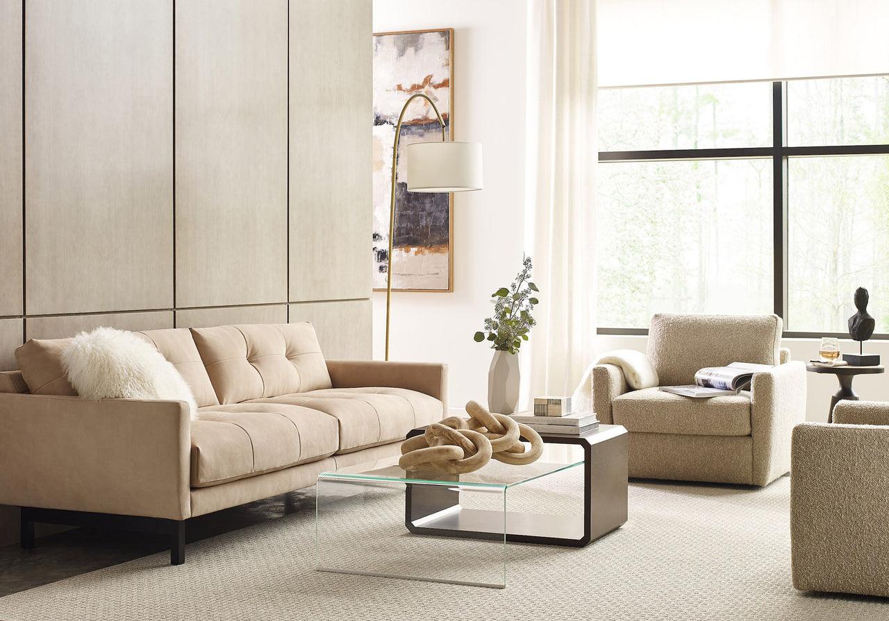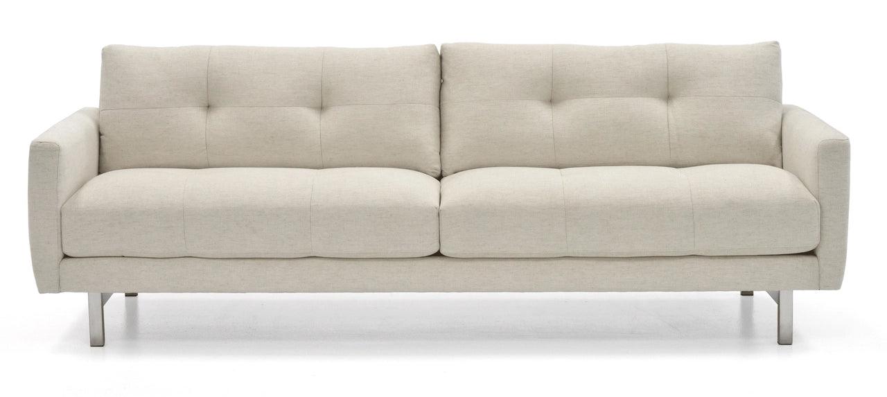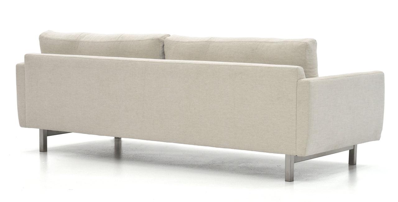 The Carmet sofa features a sleek, modernist track arm that tapers in from the top of the sofa to the bottom for an elegant look that cannot be ignored. Its low-profile beauty is further accentuated by its plush, sloping waterfall detail that can be seen on the interior of its arm.