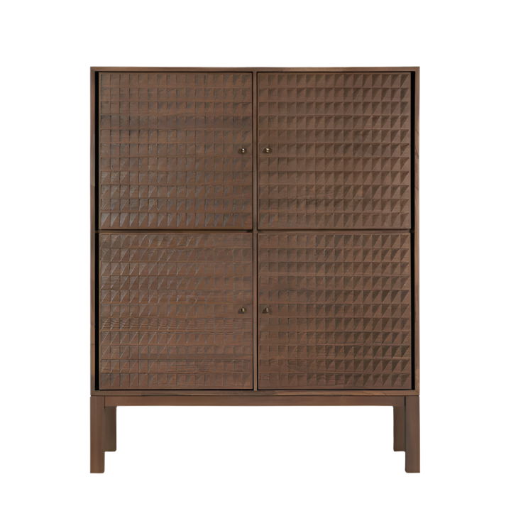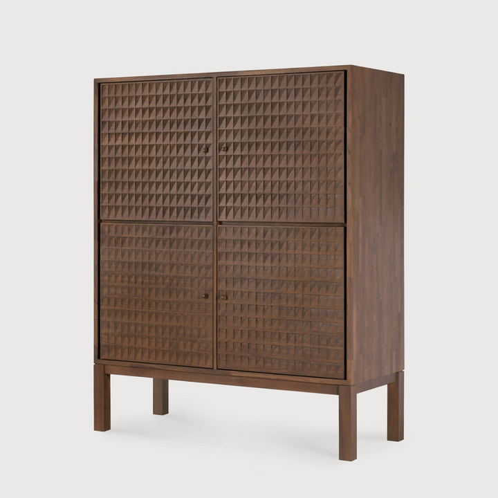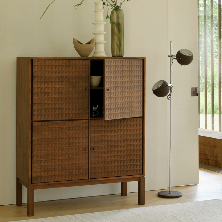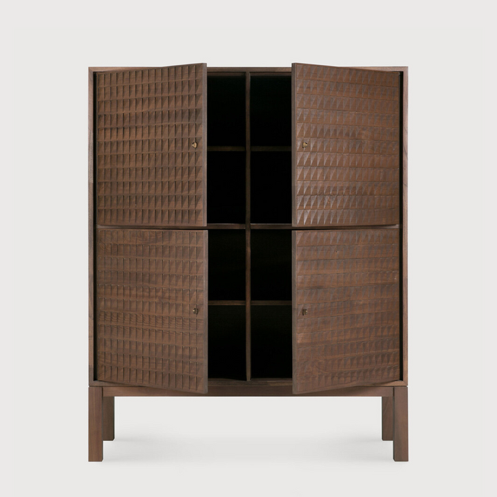 The Sono Cupboard beautifully combines antique-inspired craftsmanship with modern elegance. Its hand-carved panels and delicate cast brass handles create a refined and sophisticated statement piece for any room. Behind its stunning exterior, the cupboard offers functional storage with four doors and internal adjustable shelves, making it perfect for keeping your space organized. Made from light brown-tinted solid teak with a varnish finish, this piece blends style and practicality, providing a timeless and elegant addition to your home décor.