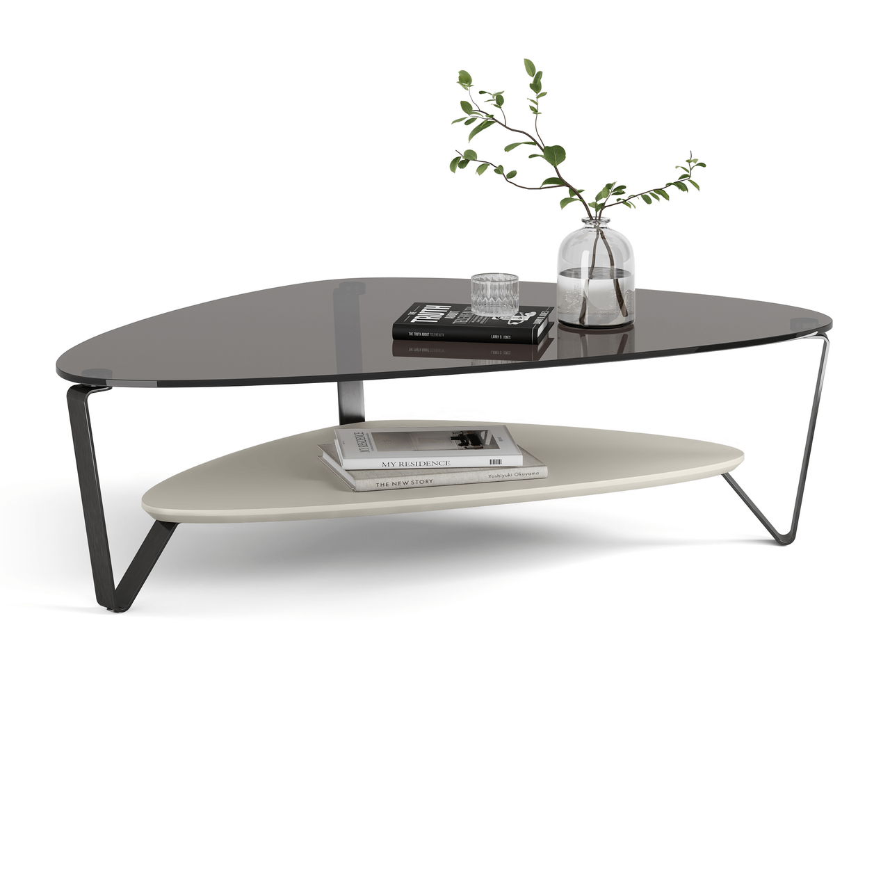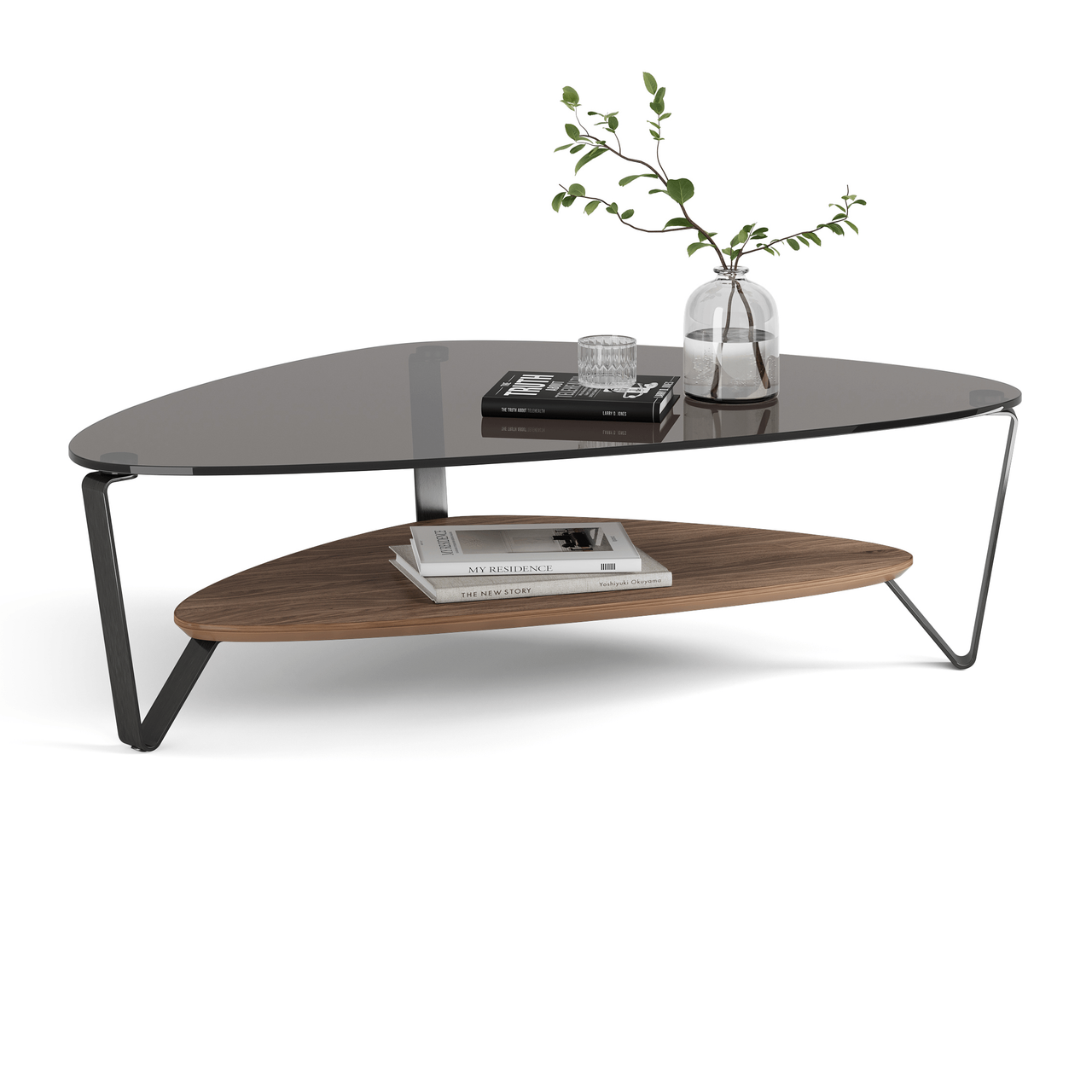 The Dino 1363 Large Cocktail Table by BDI offers a soft, triangular shape perfect for modern interiors, especially suited for use with sectional sofas. With a grey-tinted tempered glass top and a floating lower shelf finished in stone-shaded lacquer, this versatile table is both functional and stylish. The brushed carbon legs and open storage make it ideal for contemporary spaces.