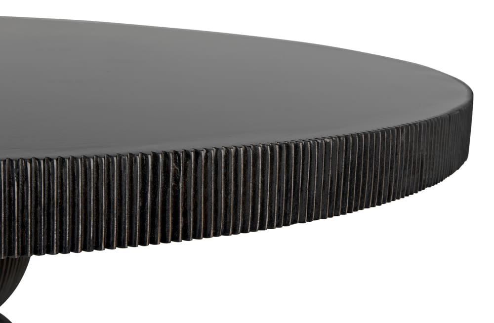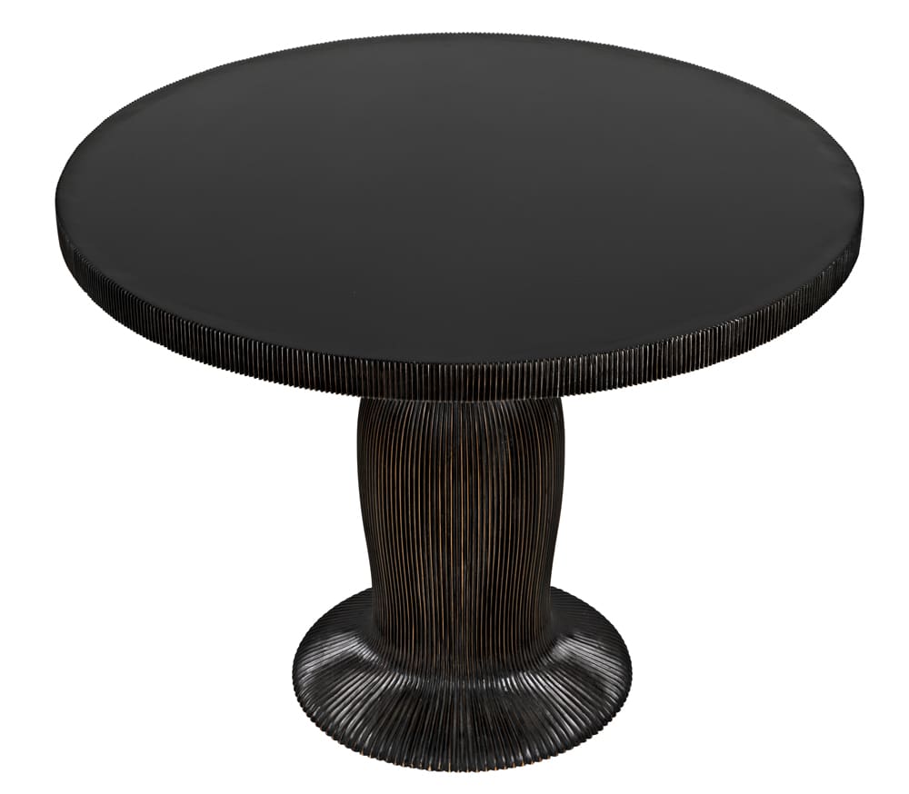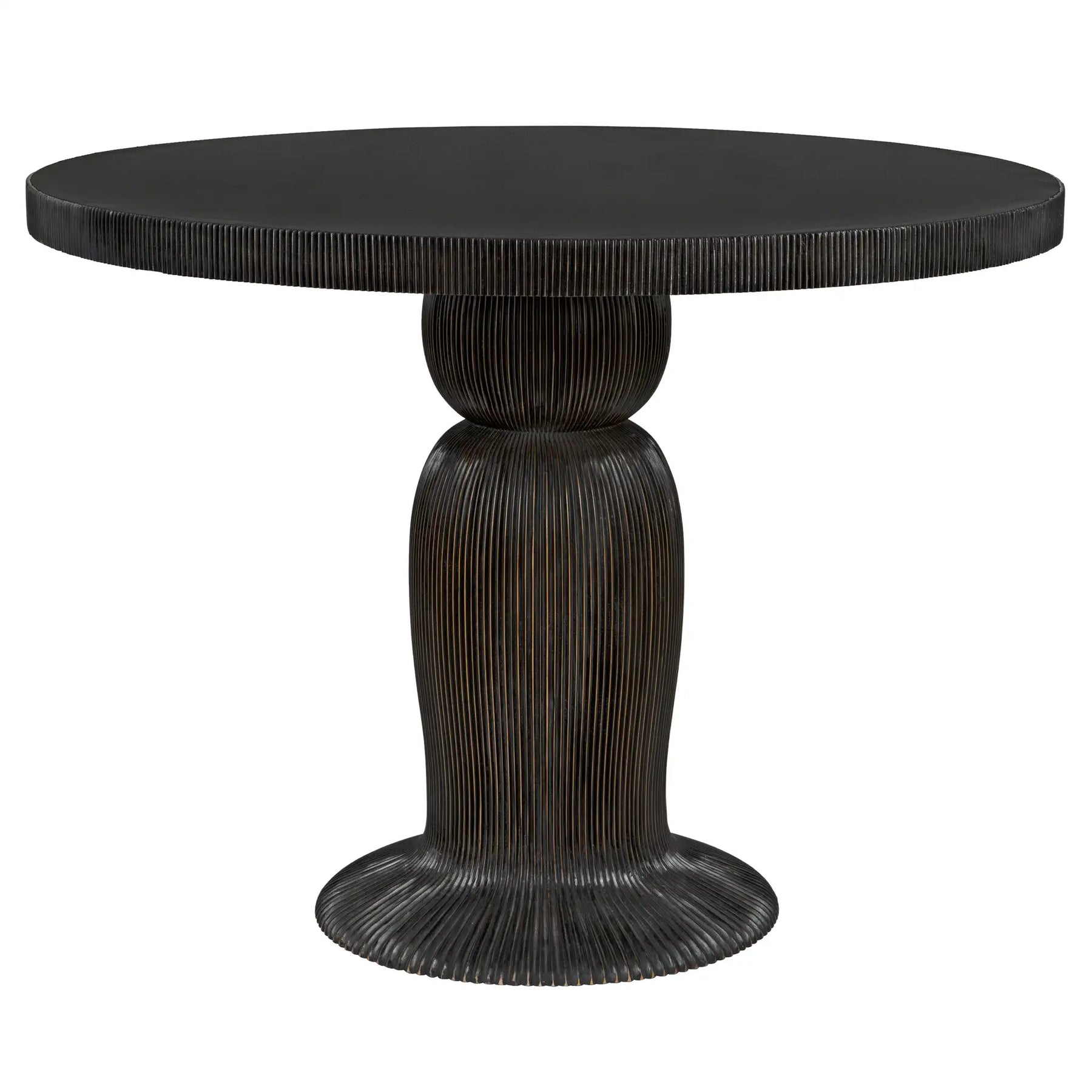 The Portobello Dining Table by Noir is a sophisticated blend of detailed craftsmanship and timeless elegance. Featuring a finely ribbed body and top edge, this 40" round table exudes a sculptural quality reminiscent of a cinched tassel or mushroom. The Hand Rubbed Black finish with light brown highlights reveals the golden wood tones beneath, creating a shimmering, dynamic effect. Perfect for compact dining spaces or as a statement centerpiece, the Portobello Table showcases Noir's dedication to artistry and design.