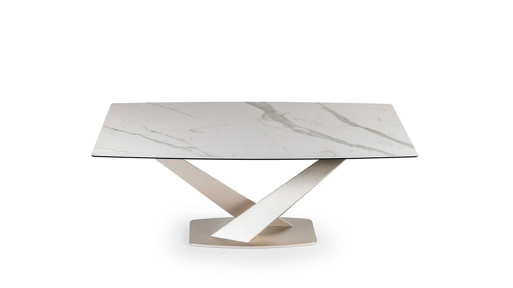 Embark on a journey where geometric artistry and dining coalesce, with the Zeus Dining Table designed by Yoshiharu Hatano for Naos. This Italian-crafted dining table, not just a piece of furniture, transforms your dining space into a hub of style and conversational brilliance with its distinctively geometrical and sculptural base. Two angled metal elements, crisscrossing against each other, set a stage that's both visually dynamic and structurally solid.
