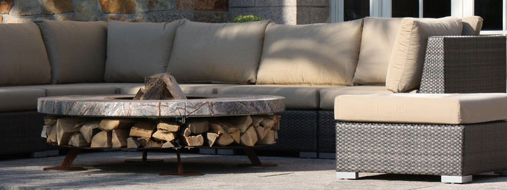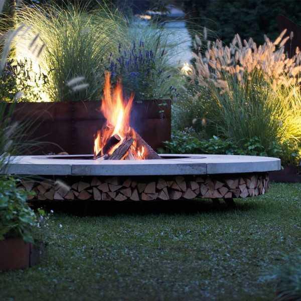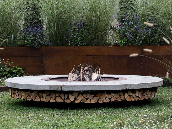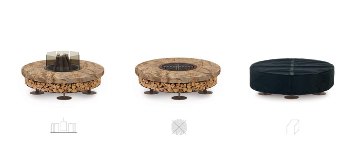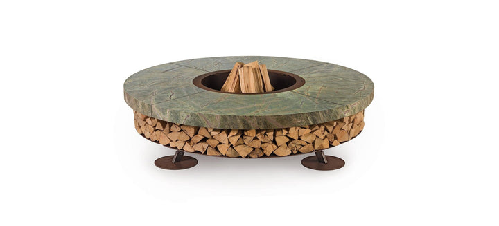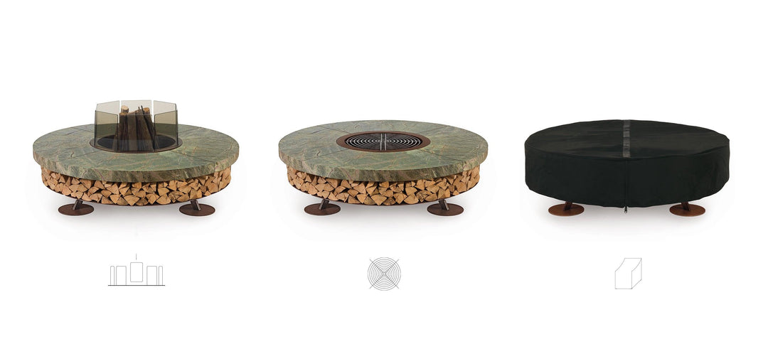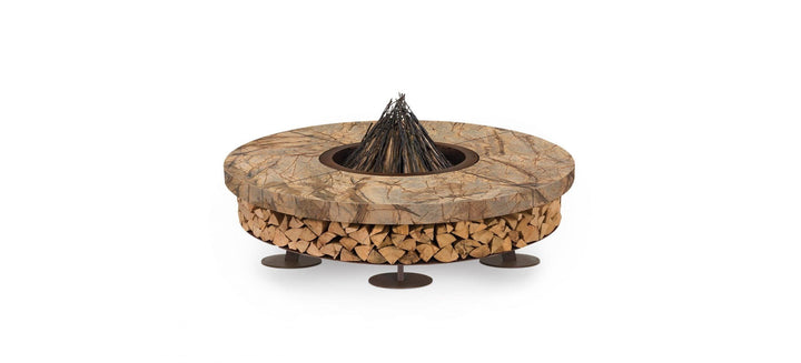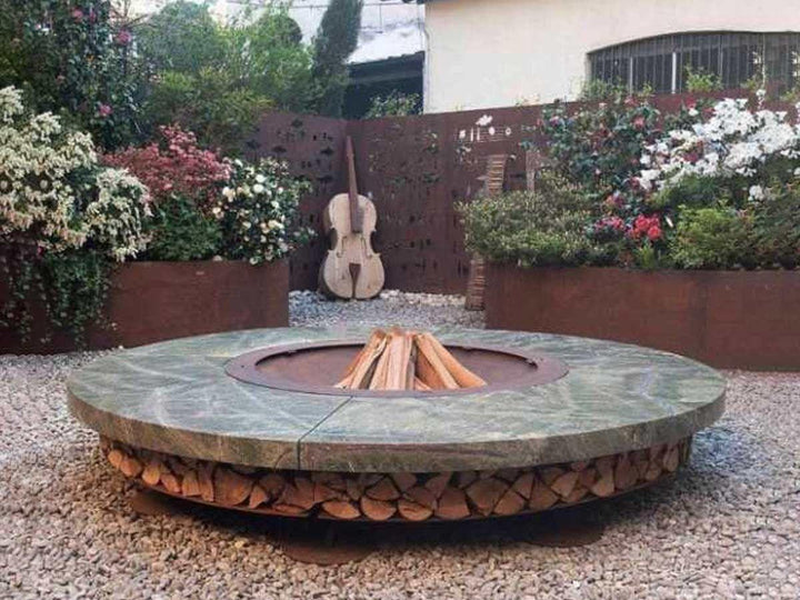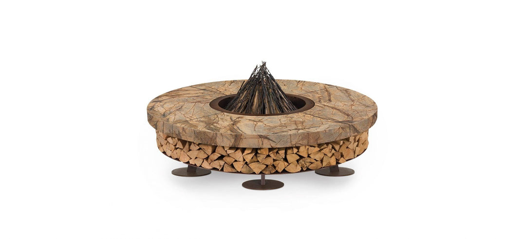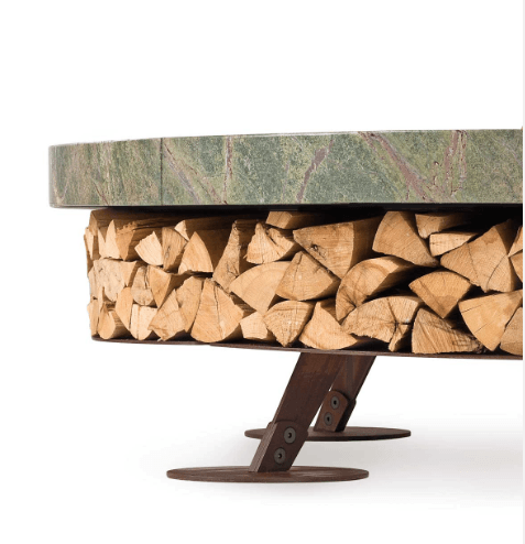 The fire pit's base is crafted from oxidized steel, treated to resist corrosion, and supports a substantial marble top that exudes elegance. This model comes in multiple color options, accommodating personal taste and complementing any outdoor decor. Beyond its visual appeal, the Ercole Marble Fire Pit serves as a practical storage solution for firewood, enhancing its utility without compromising on style.