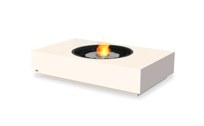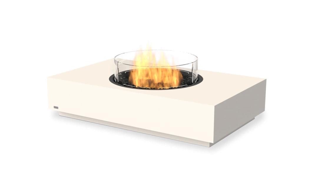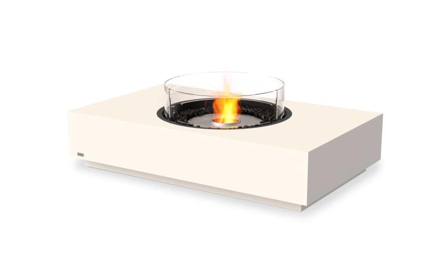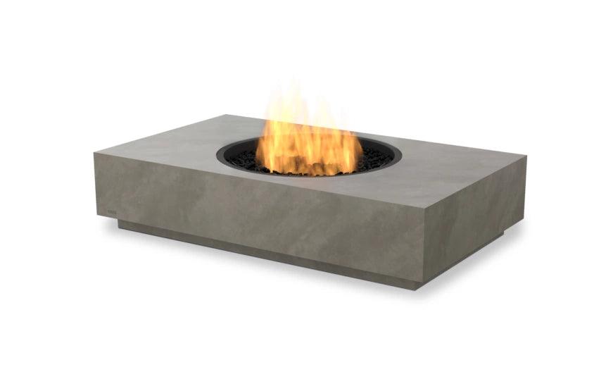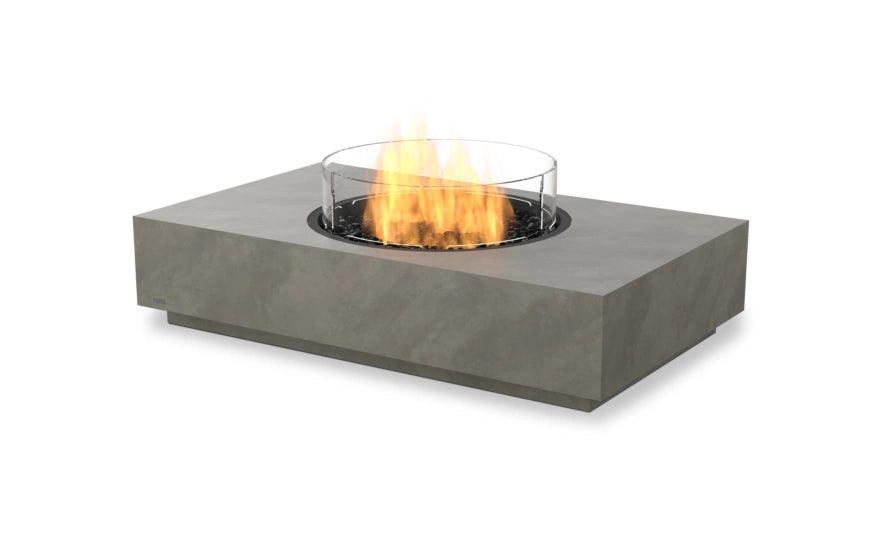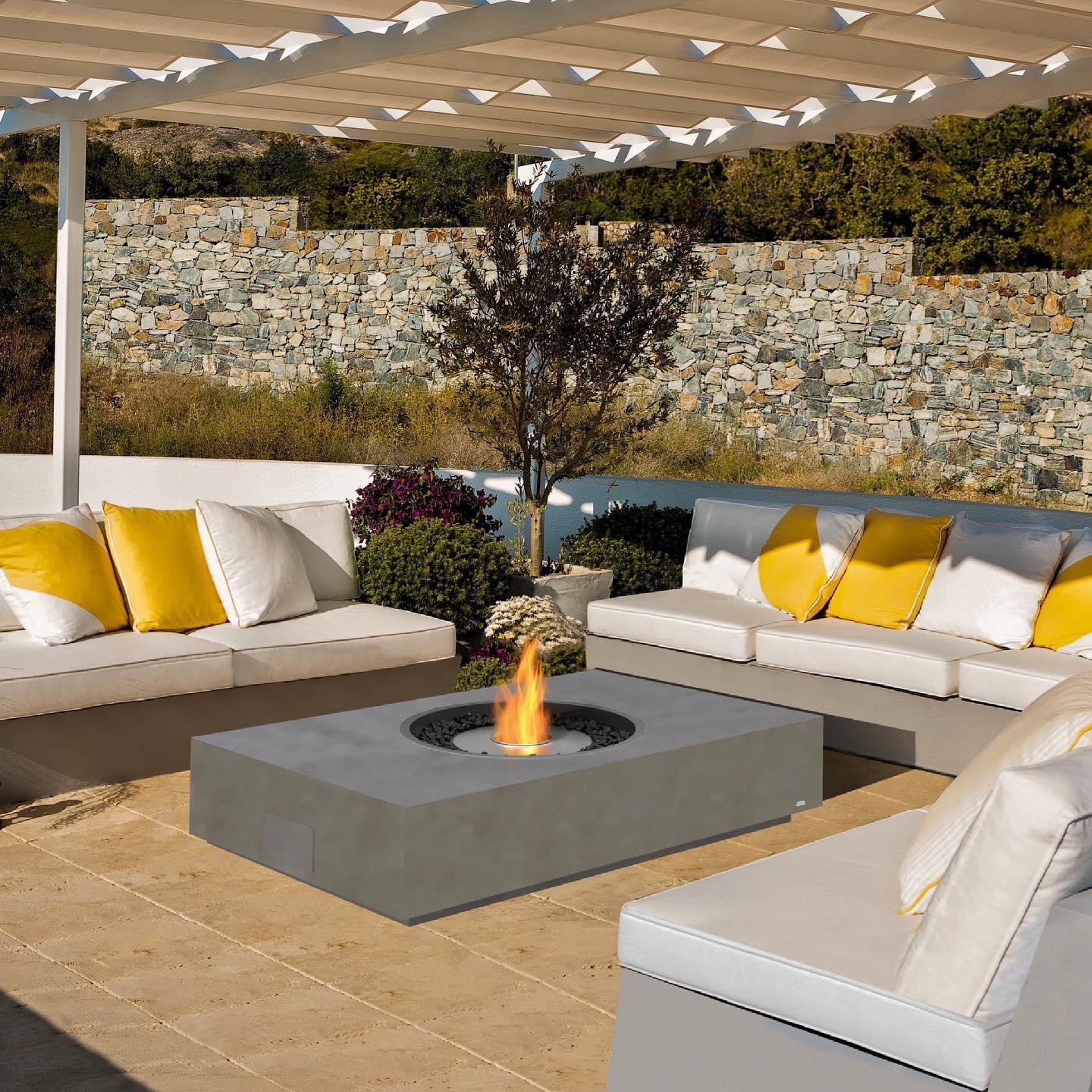 The low fire pit table is available in Ethanol, Natural Gas or Liquid Propane and comes with standard decorative glass media. Concrete configurations also include a Winter Bag/Summer Cover, while Teak models include a toughened glass screen for extra safety.