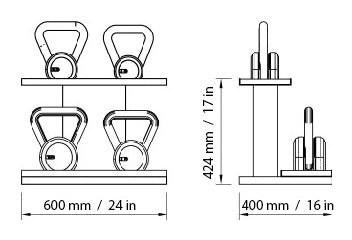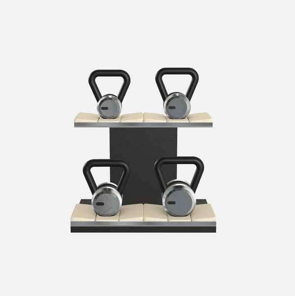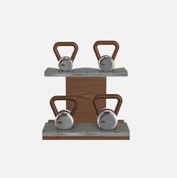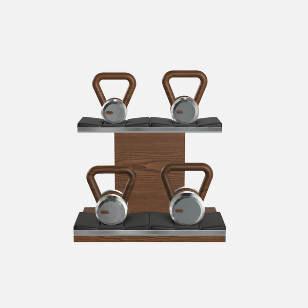 Sleek, contemporary kettlebell set featuring the highest quality stainless steel weights and natural walnut or ash grips. Natural wood base with stainless shelf trim and padded, full-grain leather base pads. Stand dimensions: 24w 16d 17h.