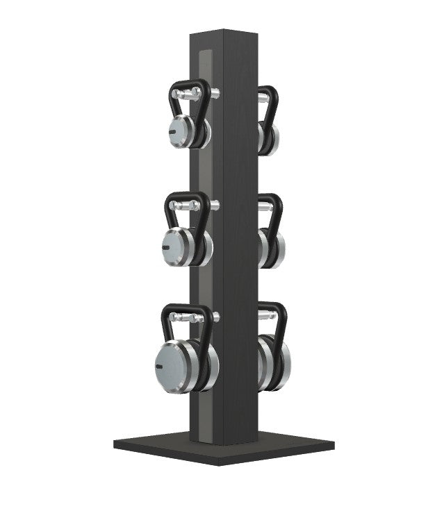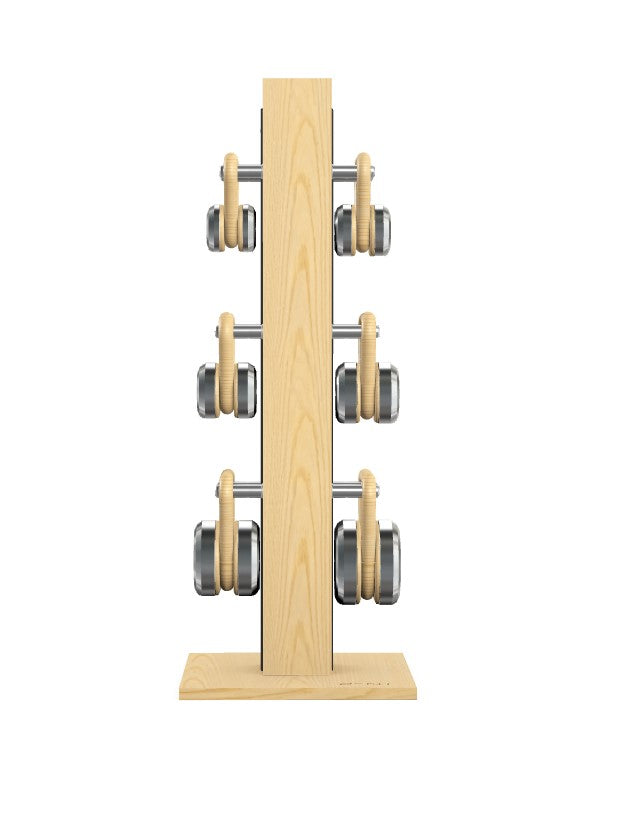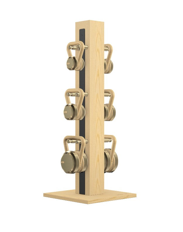 Sleek, contemporary kettlebell set featuring the highest quality stainless steel weights and natural walnut or ash grips. Natural wood tower and base with full-grain leather insert. Stand dimensions: 20w 20d 52h. No assembly required.