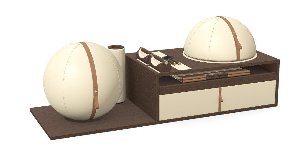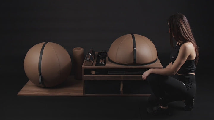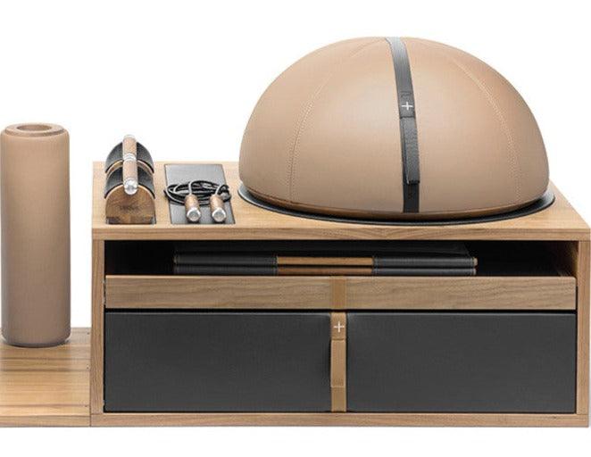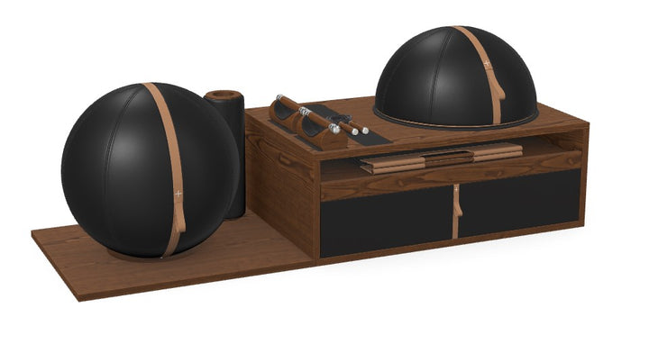 Discover the elegance of fitness with the RACKA Fitness Set by Pent Fitness. Crafted for the most opulent spaces, from luxury hotels and spas to upscale residences, this set is the embodiment of sophistication and functionality. Every piece, from the MESNA Exercise Sitting Ball to the ROLA Back Roller, is an epitome of superior craftsmanship and aesthetic allure. The base, carved from either natural walnut or ash, is adorned with stainless accents, emphasizing its modern appeal. Each accessory gleams with a rich beige primary leather, while the black leather trims add contrast and depth. Whether you're seeking balance with the TRESNA Balance Trainer or flexibility with the MATA Large Fitness Mat, this set promises a comprehensive workout experience. With no assembly required, it's not just a fitness set but a luxury statement.