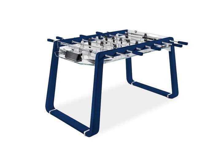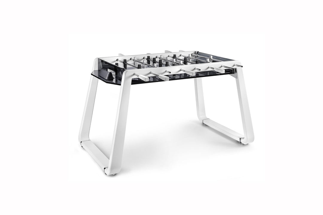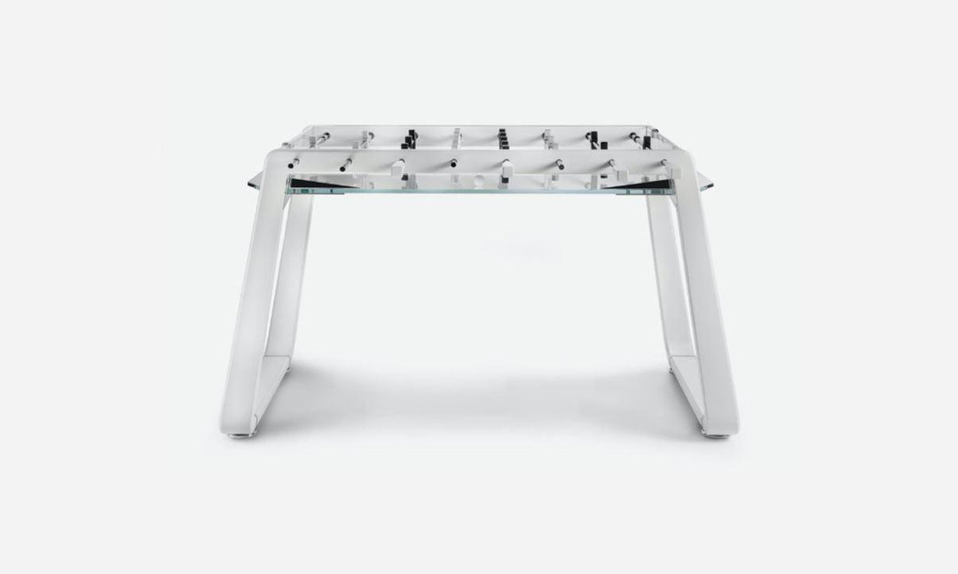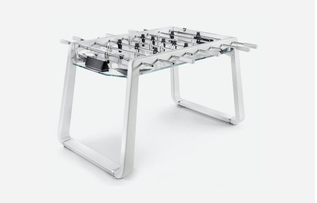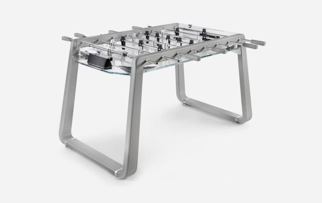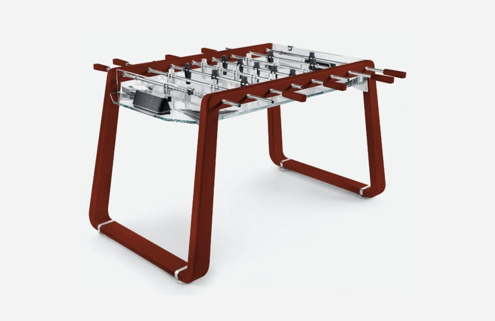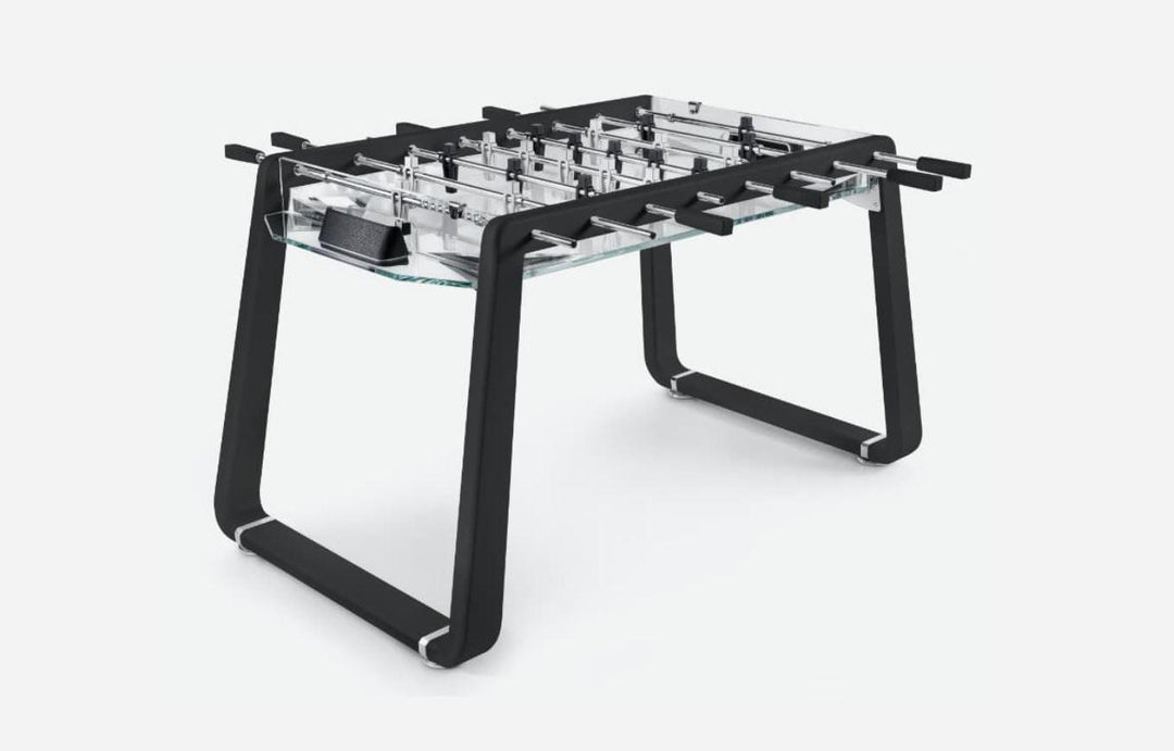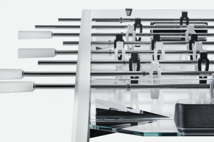 Introducing the Derby Canvas, a contemporary foosball table that harmoniously combines customizable materials to create a sophisticated gaming experience. This exceptional piece boasts a crystalline glass playing field supported by a modern, solid, lacquered wood structure.