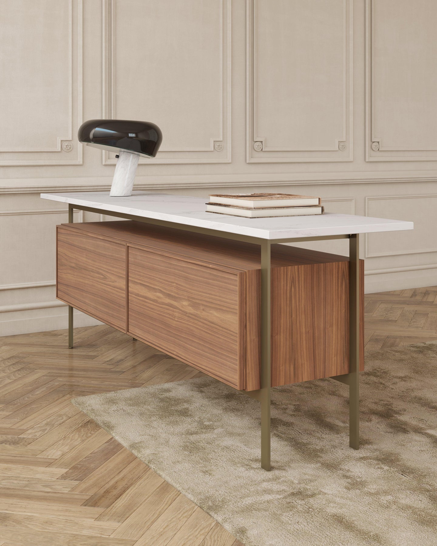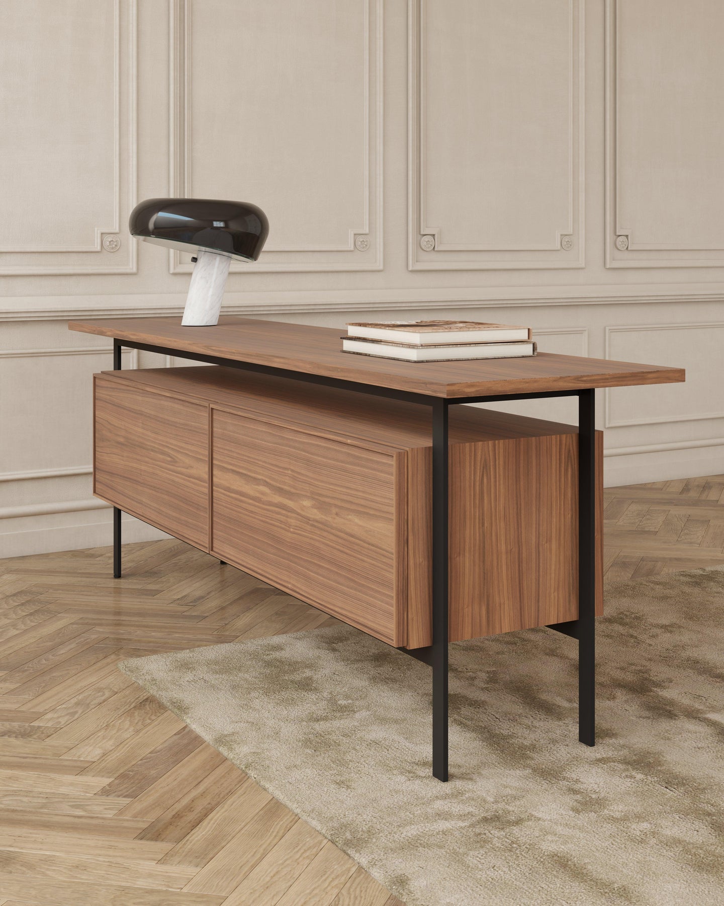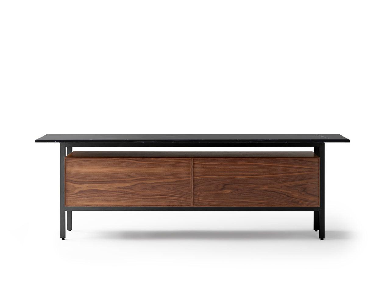 The Chicago Wood Doors Sideboard by Punt Mobles pays homage to the iconic modernist architecture of the mid-century period. Emulating unobstructed repetitive building techniques, this piece exudes a light and floating appearance that feels like a piece of modern architecture in your living space. Crafted with sturdy steel construction, it provides reliable stability, while the floating wooden cabinet imparts an enhanced spatial impression. The tabletop, acting like a floating roof with its extended eaves, completes the minimalistic framework that beautifully combines three natural materials—wood, steel, and stone.