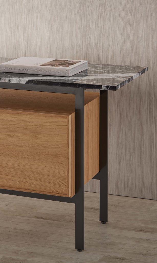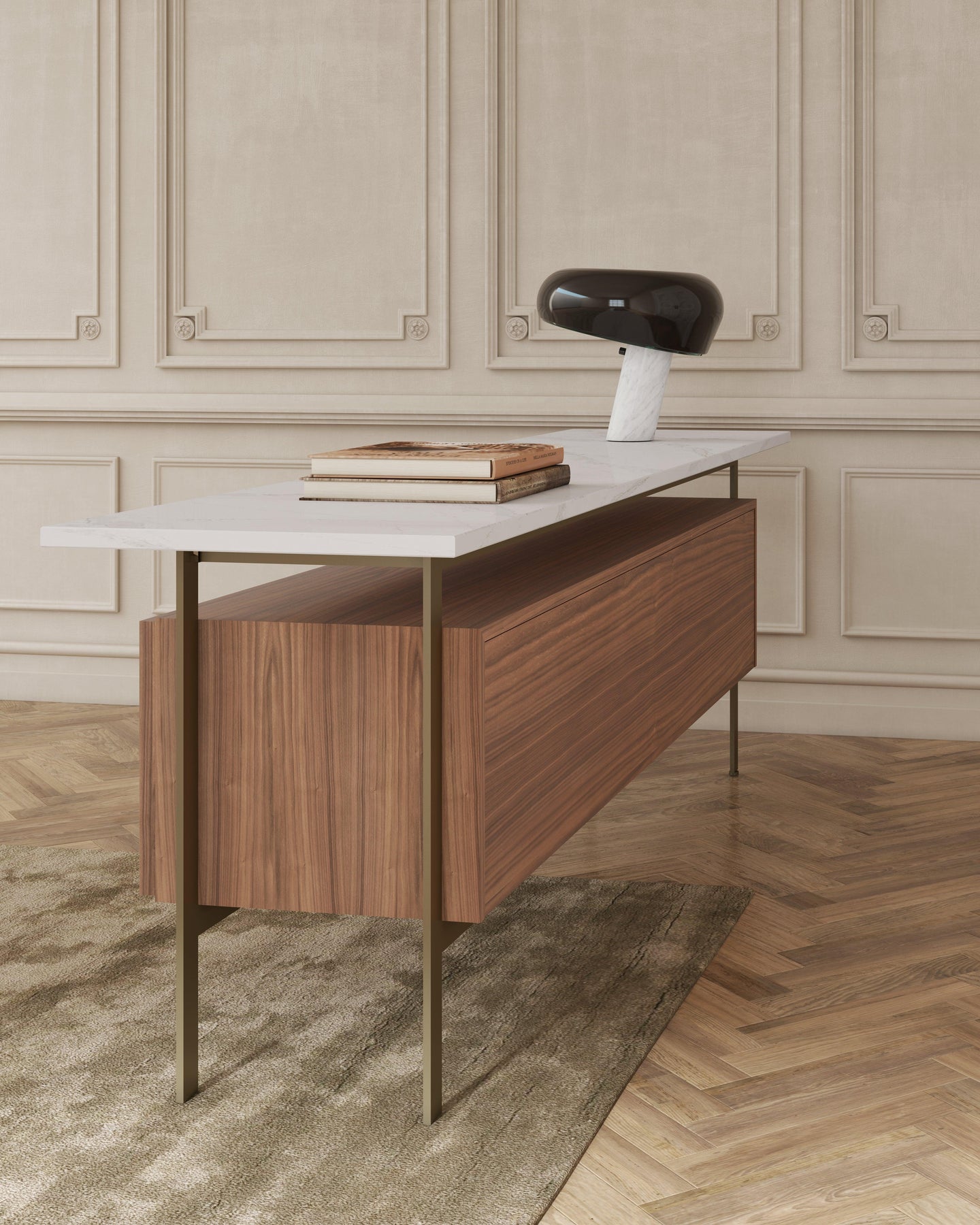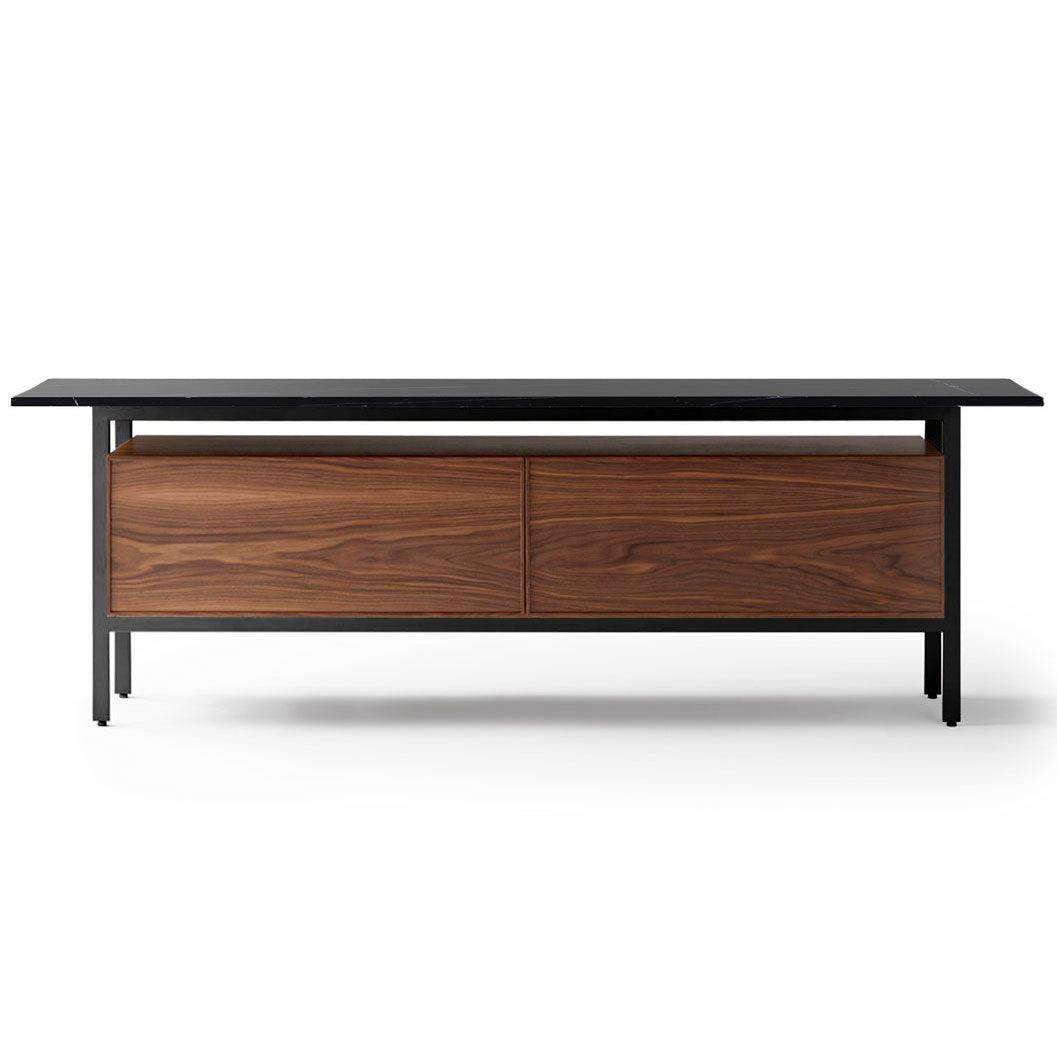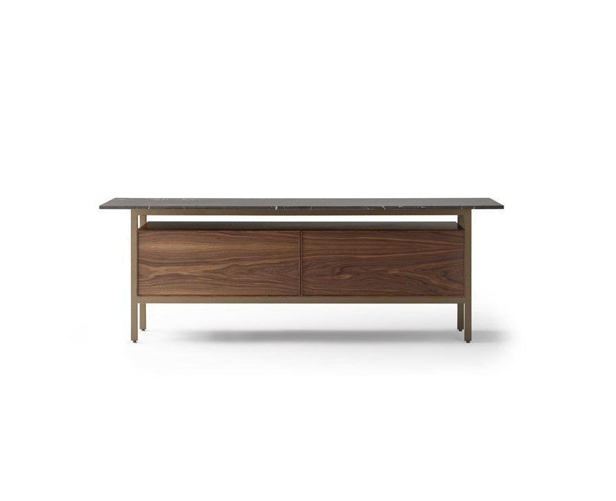 The Chicago Wood Doors Sideboard by Punt Mobles pays homage to the iconic modernist architecture of the mid-century period. Emulating unobstructed repetitive building techniques, this piece exudes a light and floating appearance that feels like a piece of modern architecture in your living space. Crafted with sturdy steel construction, it provides reliable stability, while the floating wooden cabinet imparts an enhanced spatial impression. The tabletop, acting like a floating roof with its extended eaves, completes the minimalistic framework that beautifully combines three natural materials—wood, steel, and stone.