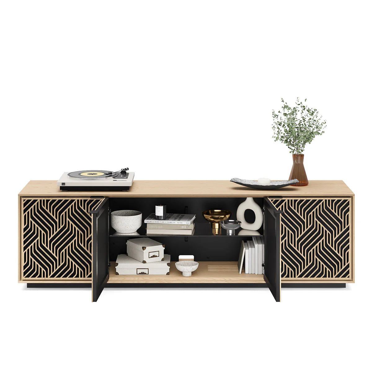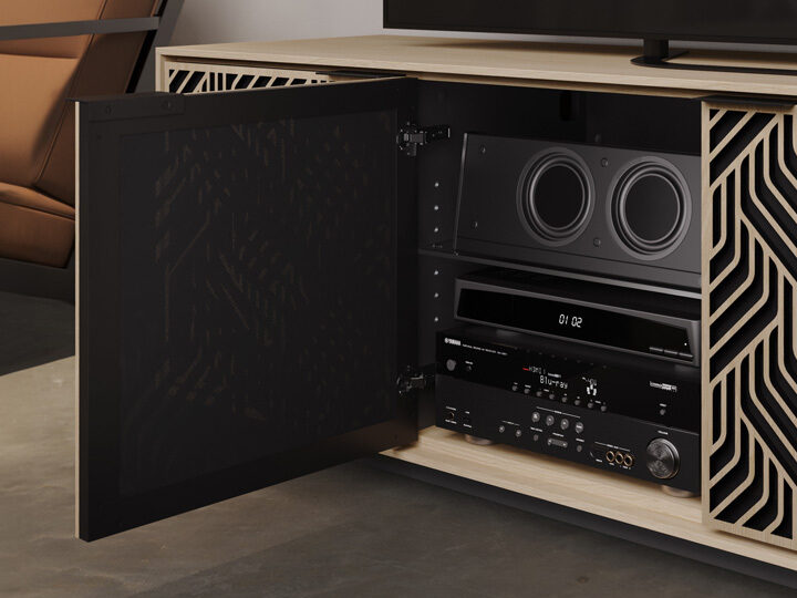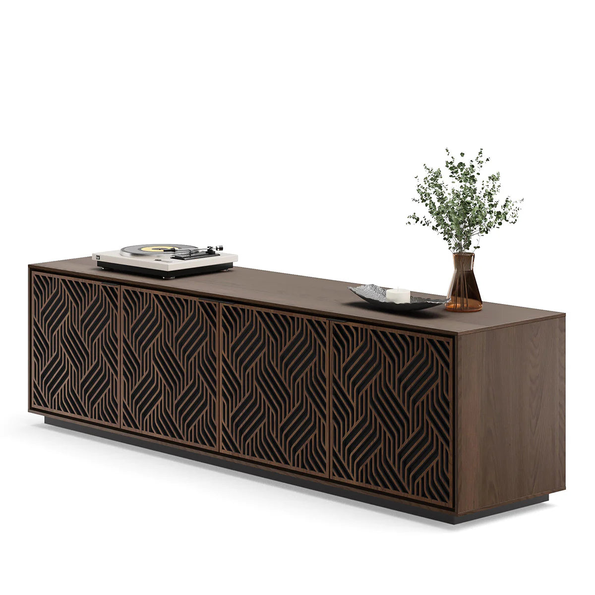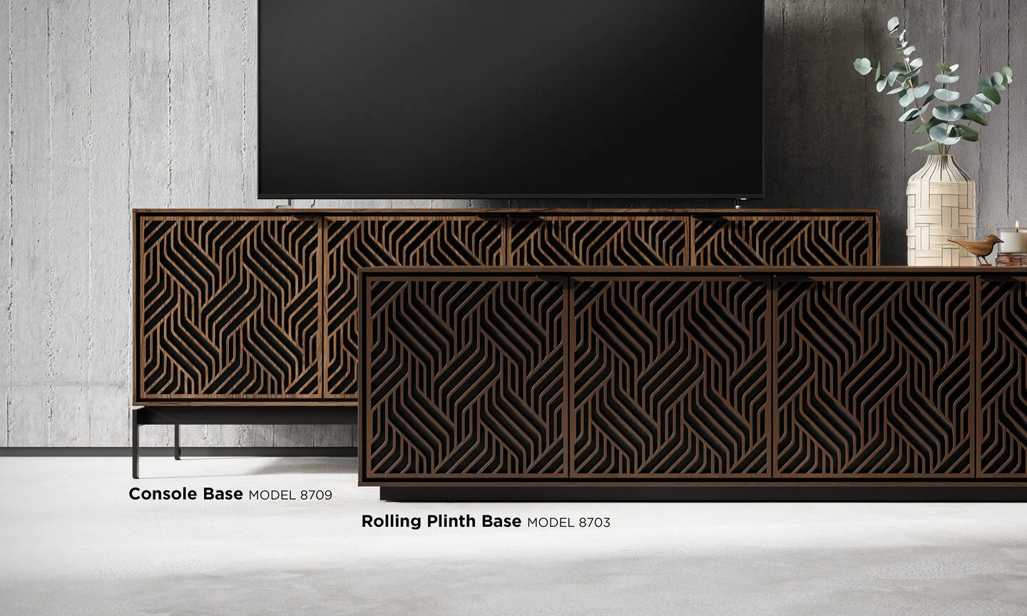 The BDI Elements 8703 Media + Storage Cabinet, featuring the Weave door pattern, is a harmonious blend of organic design and advanced functionality. Crafted to accommodate media setups and storage needs, this cabinet combines style with substance. The sleek Rolling Plinth Base with hidden wheels ensures smooth mobility, allowing effortless access to components. With its remote-friendly doors, soft-close functionality, and acoustically transparent materials, the Elements 8703 is designed to elevate both the form and function of your living space.