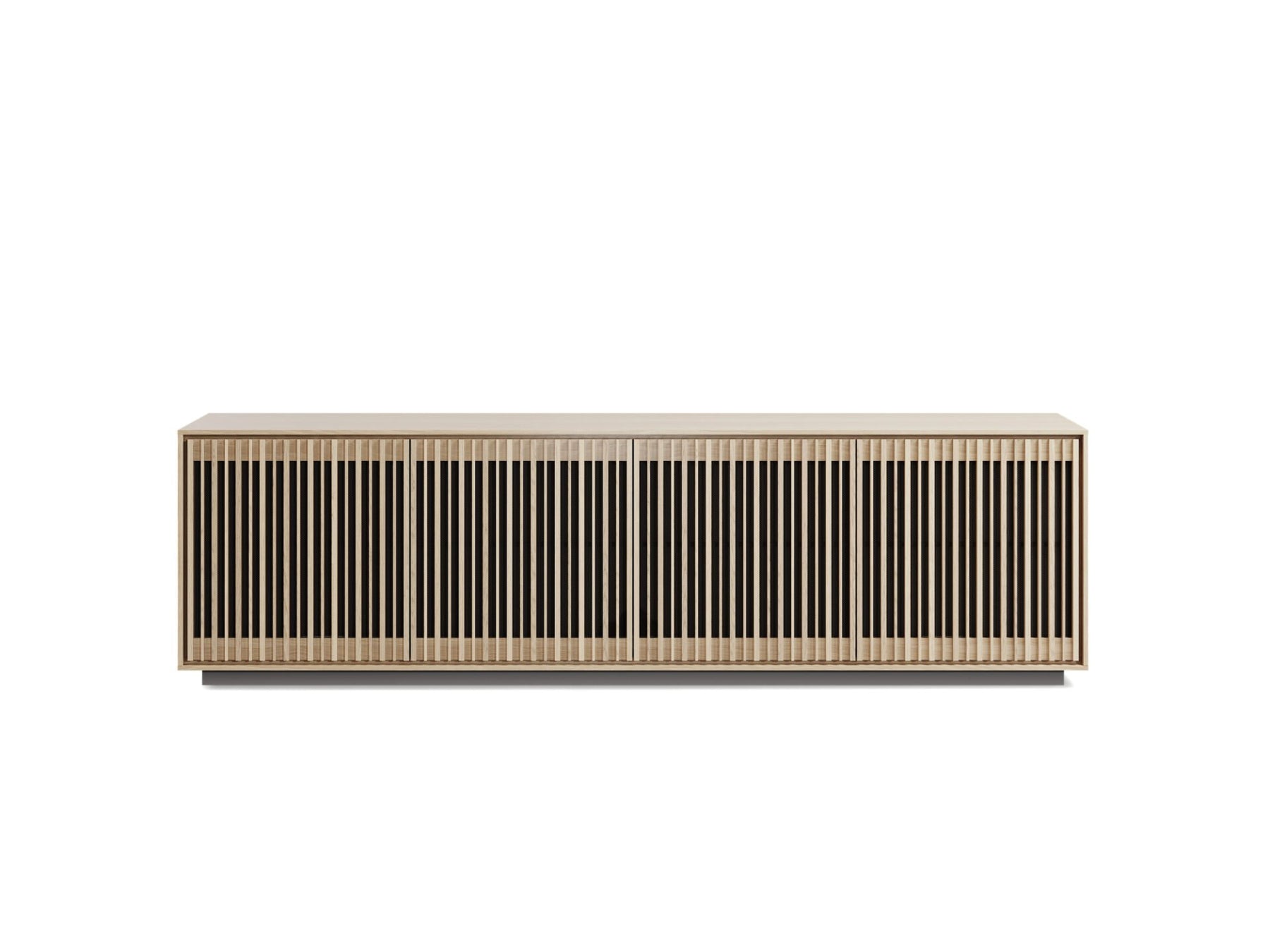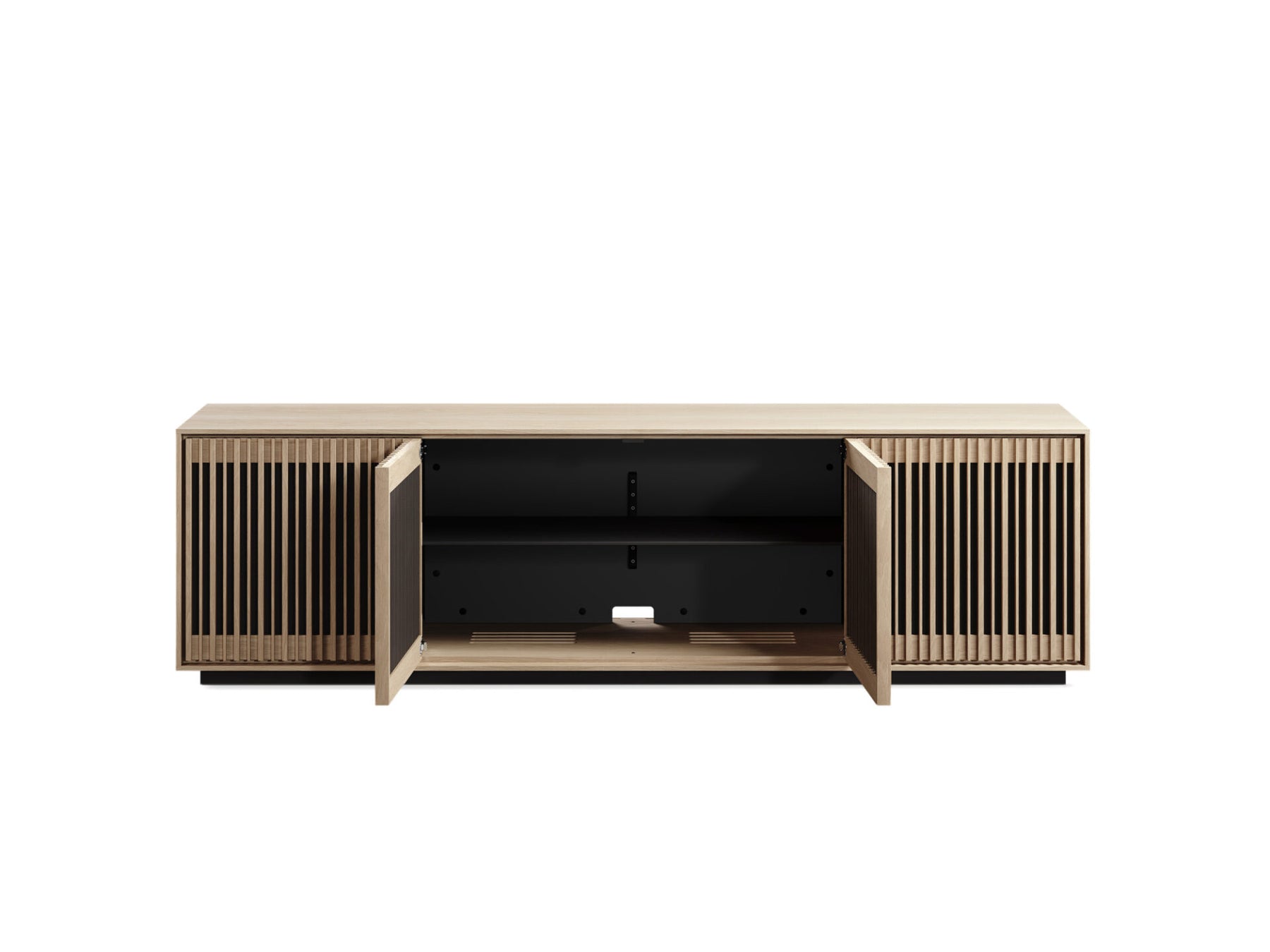 The Profile™ 8479 Media Console is a sophisticated blend of modern design and practical functionality, tailored to meet your entertainment and storage needs. Featuring a spacious four-door design, this console elegantly accommodates your media devices, while also providing ample storage for other essentials. Its sleek, contemporary aesthetic is enhanced by the use of natural wood veneer finishes, ensuring that each piece has its own unique charm. The Charcoal Finished Low-Profile Base with Hidden Wheels offers a discreet yet sturdy foundation, while cable management and adjustable glass shelves provide ultimate convenience.