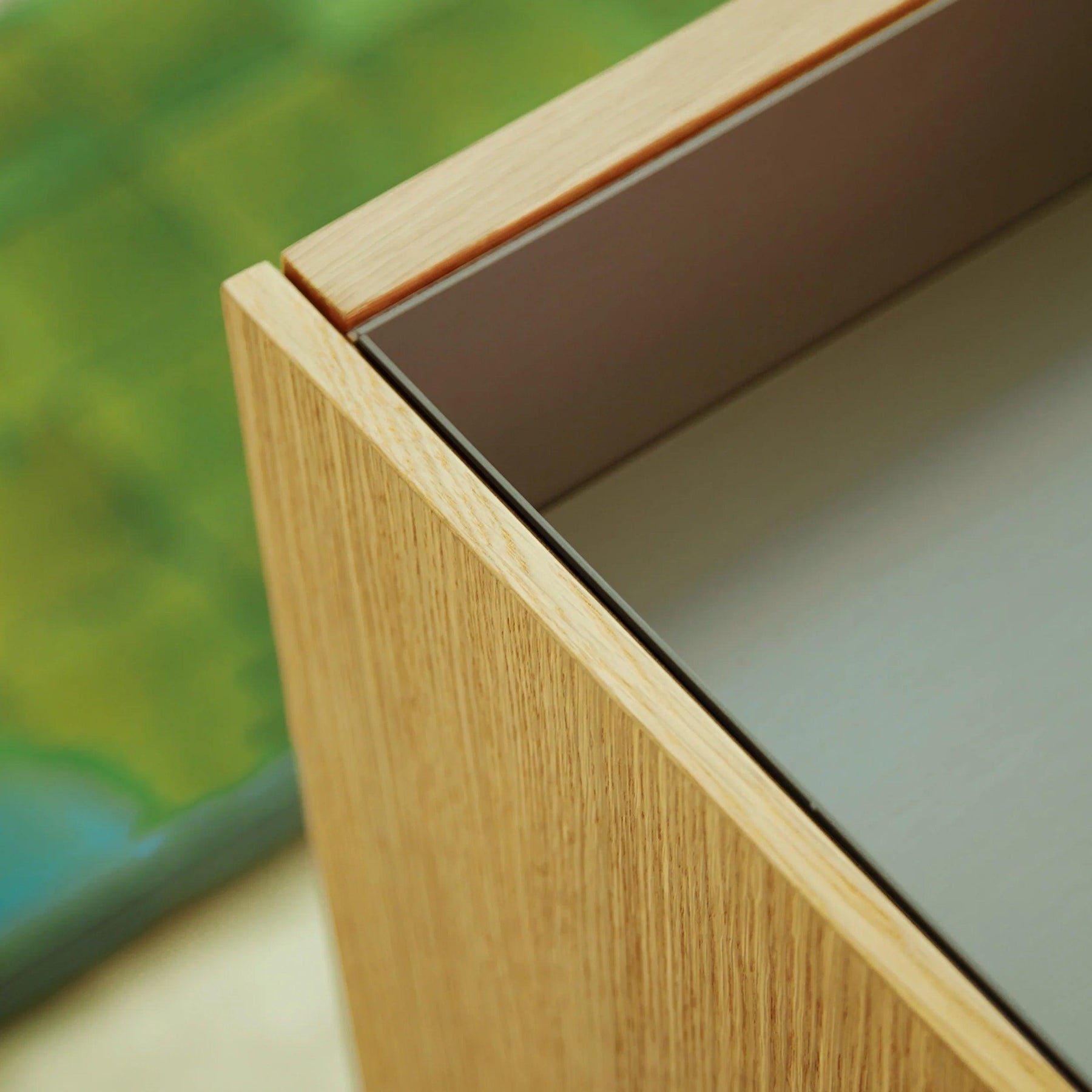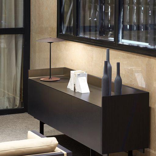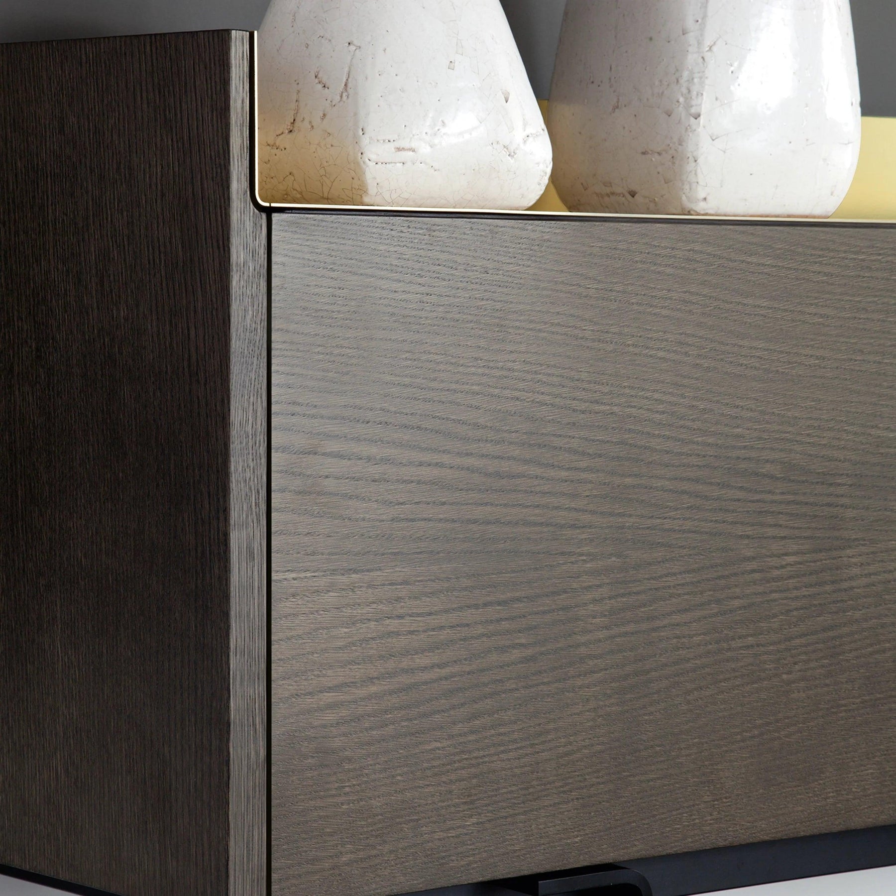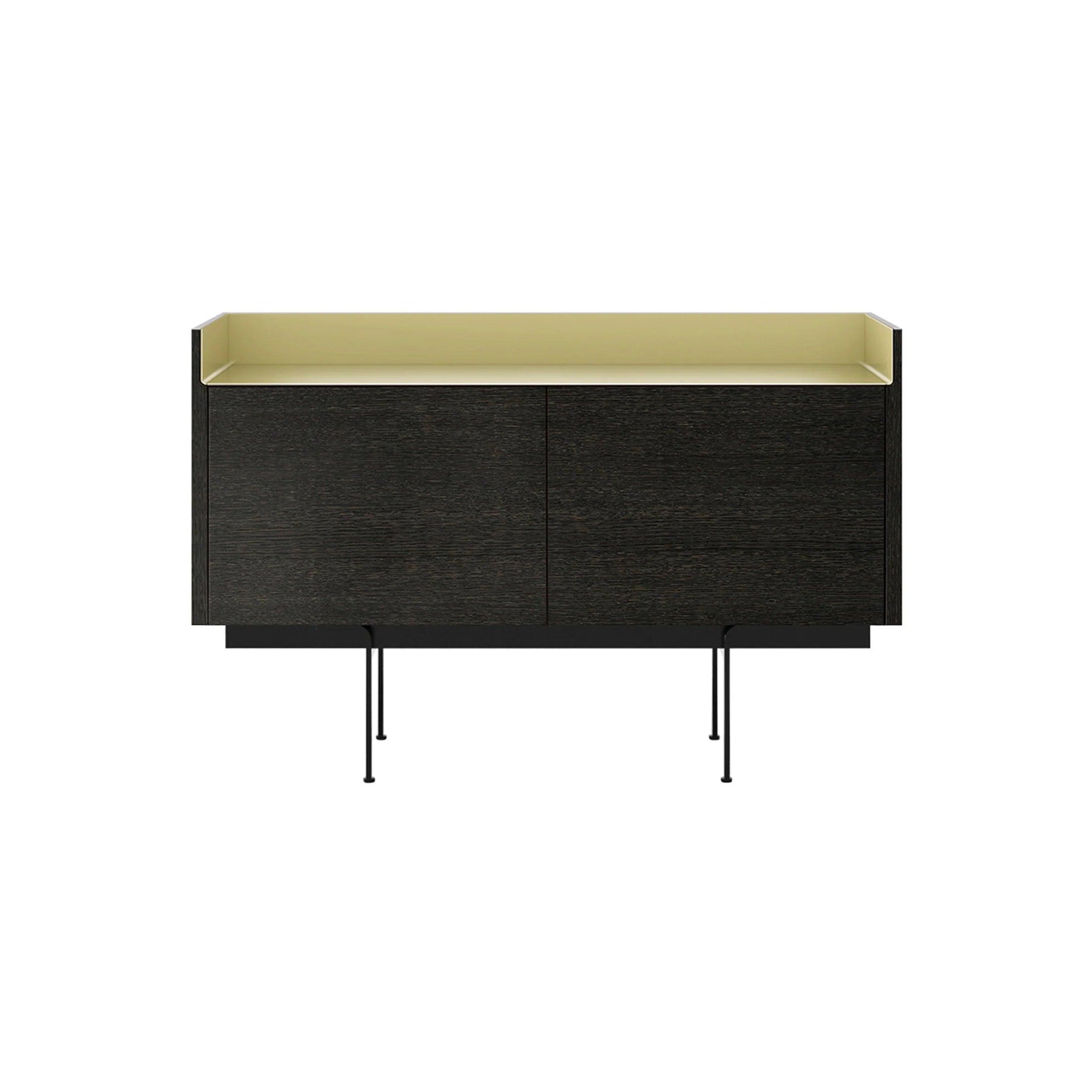 Designed by Mario Ruiz, the Stockholm 2 Door Sideboard is a compact yet elegant storage solution that beautifully blends form and function. Its clean lines and rich oak or walnut veneer present a minimalist aesthetic that can seamlessly integrate into any room. The standout feature of this sideboard is its distinctive metallic top, available in a variety of anodized aluminum hues, that adds a touch of sleek sophistication.