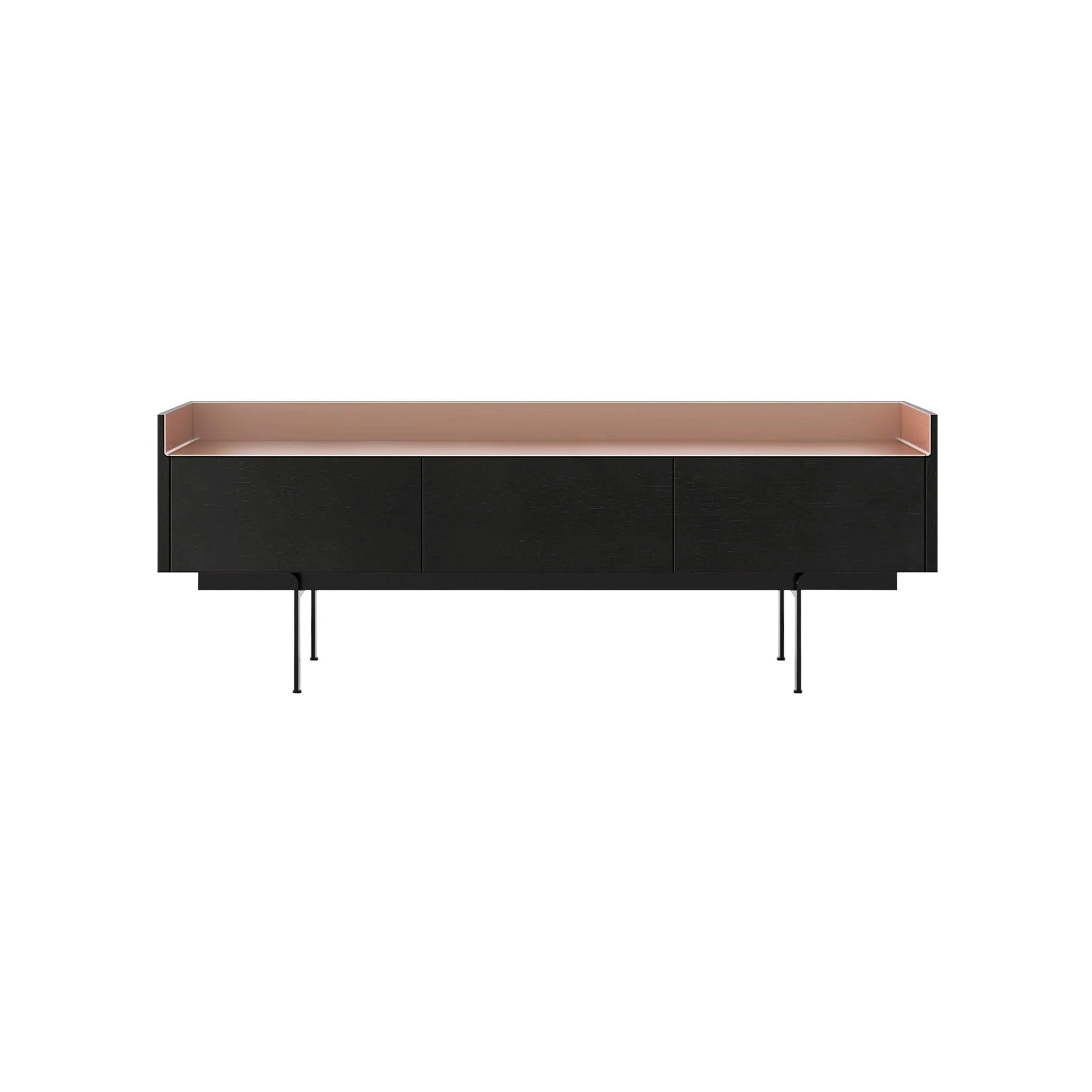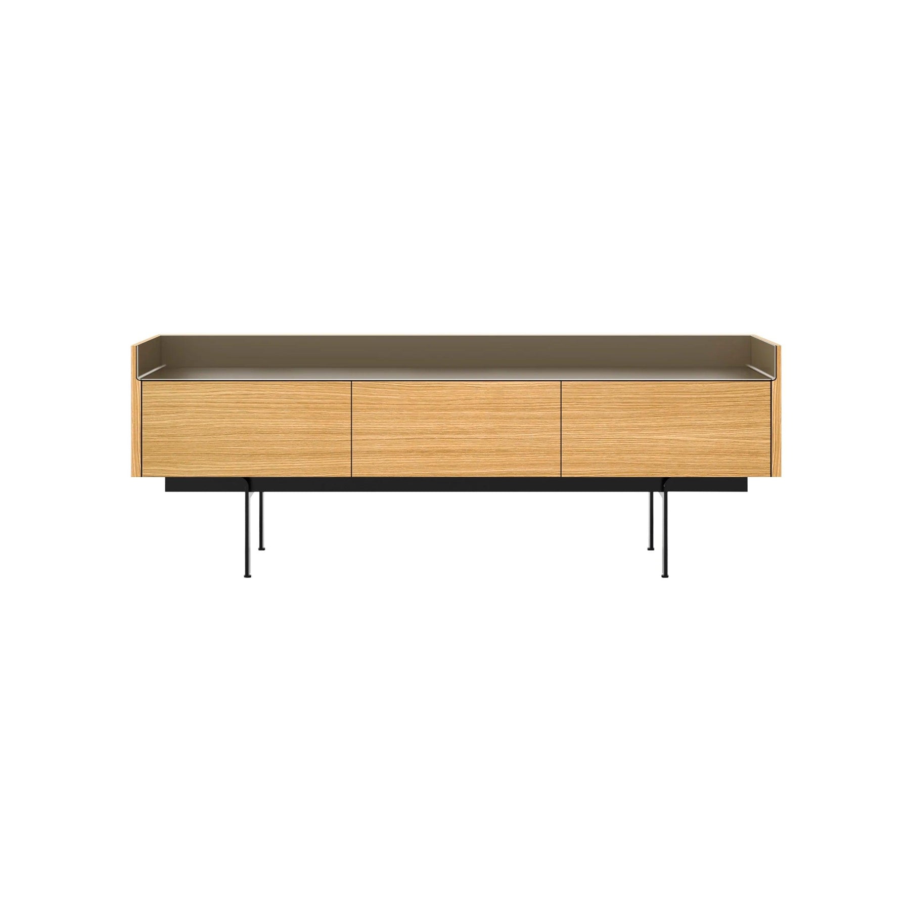 Experience the sleek elegance of the Stockholm Slim Sideboard: STH351, designed by Mario Ruiz for Punt. This mid-sized version of the Stockholm Slim line offers a TV-friendly height and generous storage space with three drop-down solid doors, each leading to a compartment with an adjustable-height shelf. The minimalist and streamlined design is enhanced by the use of rich oak or walnut veneer, coupled with the series' signature aluminum top. Balanced on a slender metal base, this sideboard effortlessly brings a touch of sophistication to any interior.