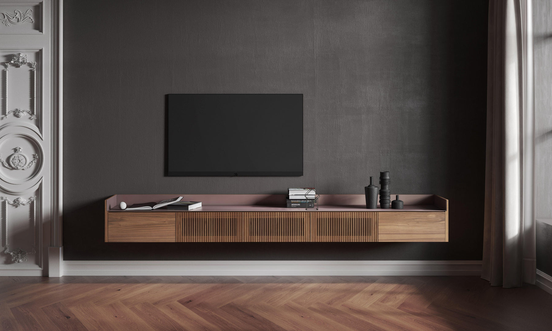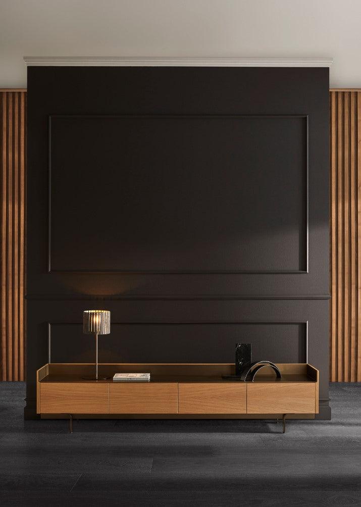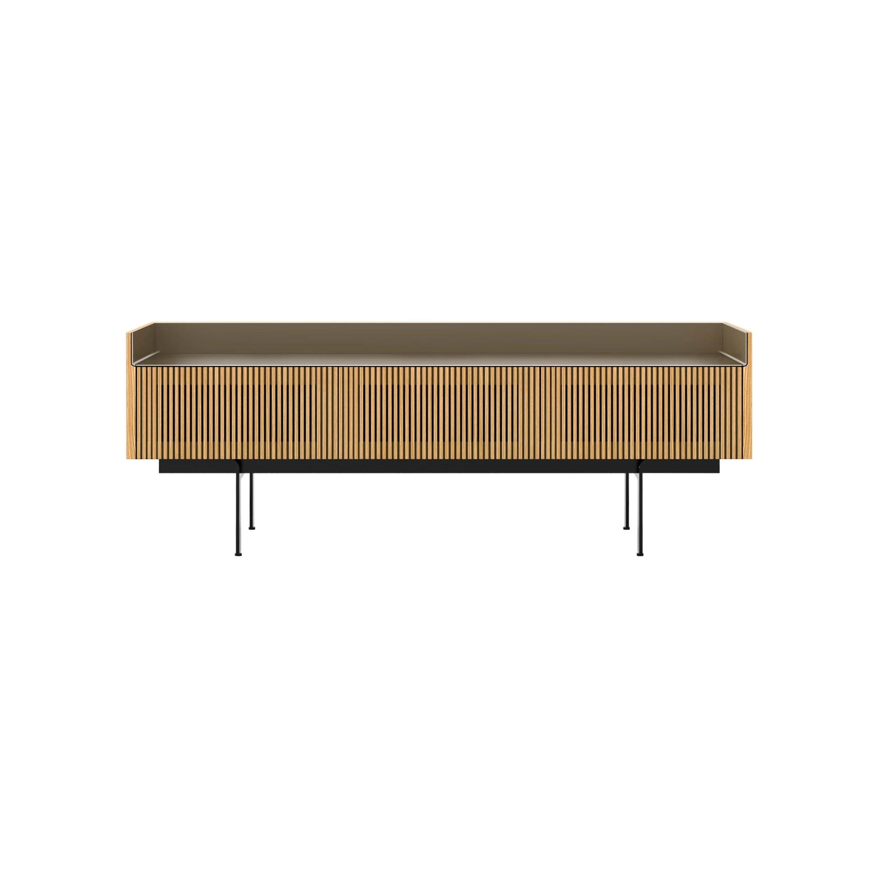 Embodying the elegance of minimalist design, the Stockholm Slim Sideboard: STH354, designed by Mario Ruiz for Punt, caters to modern needs with its compact dimensions, TV-friendly height, and efficient cable management system. It offers four compartments, each with a height-adjustable shelf hidden behind the four drop-down slatted doors, providing ample storage space despite its sleek profile. The sideboard is topped with a dazzling anodized aluminum surface that beautifully contrasts the oak or walnut veneer cabinetry, standing on a sturdy metal base available in black or bronze. It's the epitome of modern, functional design.