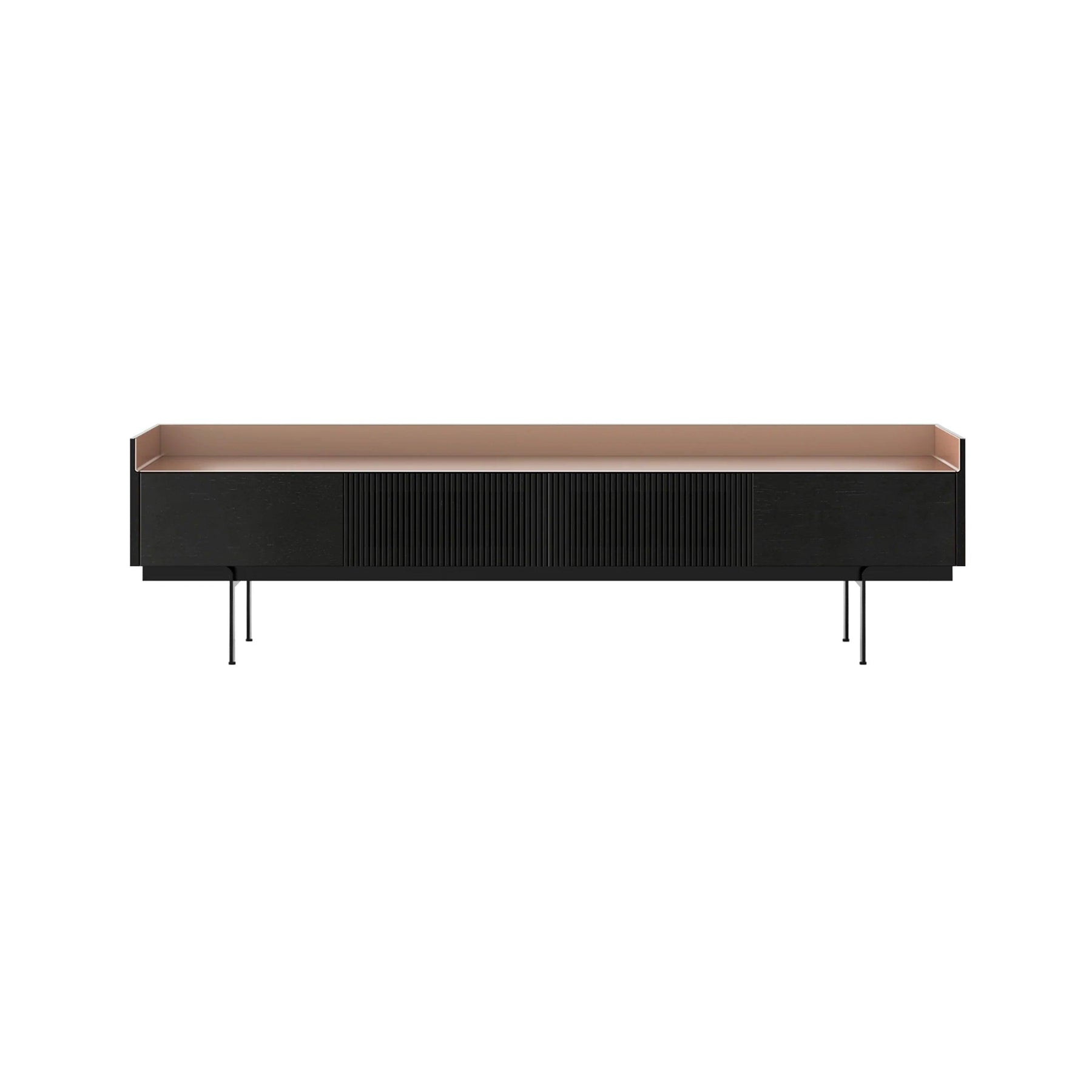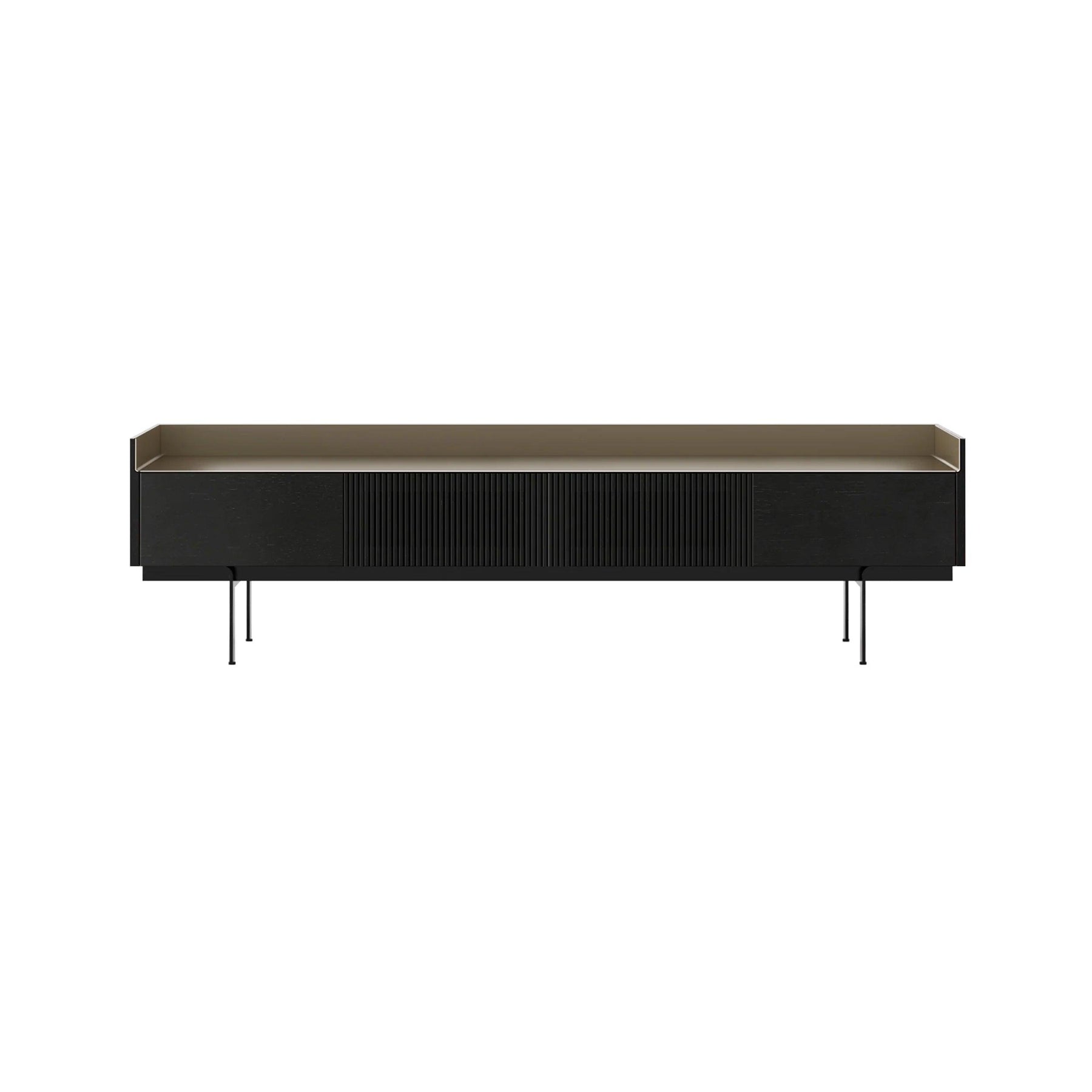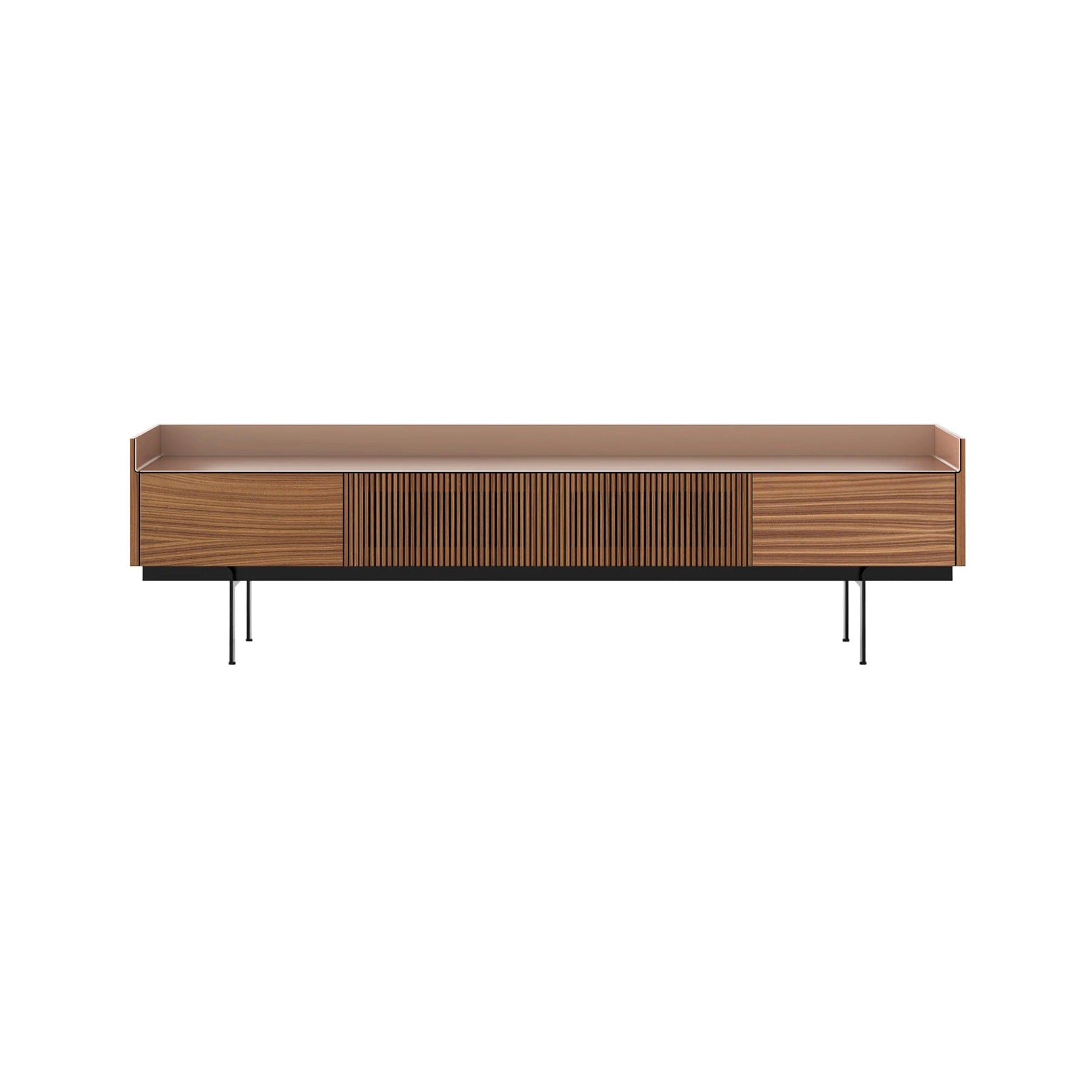 Discover the superb storage potential with the Stockholm Slim Sideboard: STH453 by Punt. Designed by Mario Ruiz, this large sideboard features two central drop-down slatted TV doors and solid doors on each side. The sideboard offers flexible storage options with its interior height-adjustable shelves and integrated cable management feature. The signature aluminum top, available in a range of lustrous finishes, contrasts beautifully with the sleek oak or walnut cabinetry, which is also offered in a variety of finishes. The sideboard sits on a sturdy metal base, finished in a durable black or bronze epoxy powder coat, enhancing its modern and sleek appeal.
