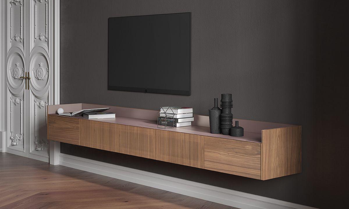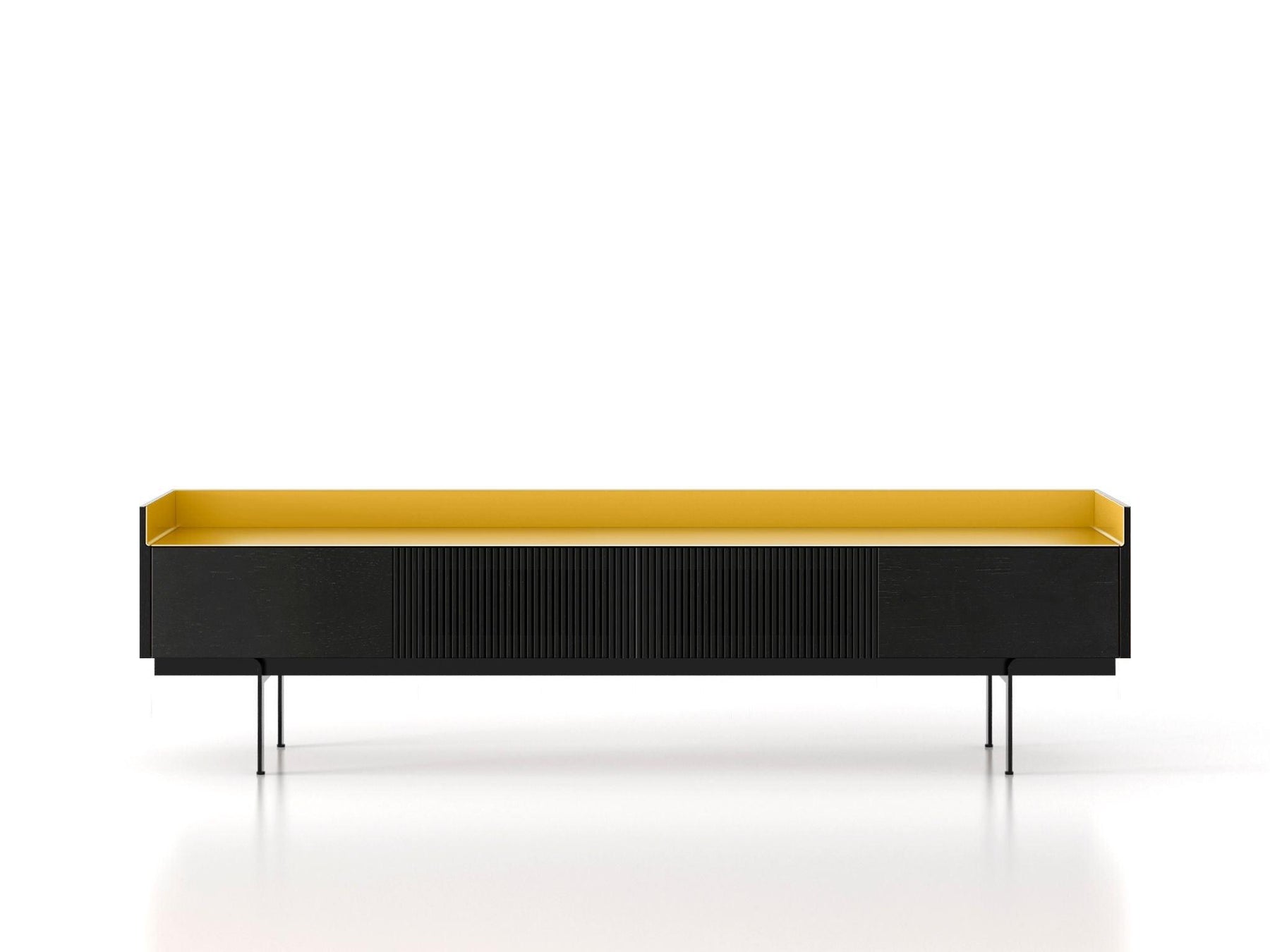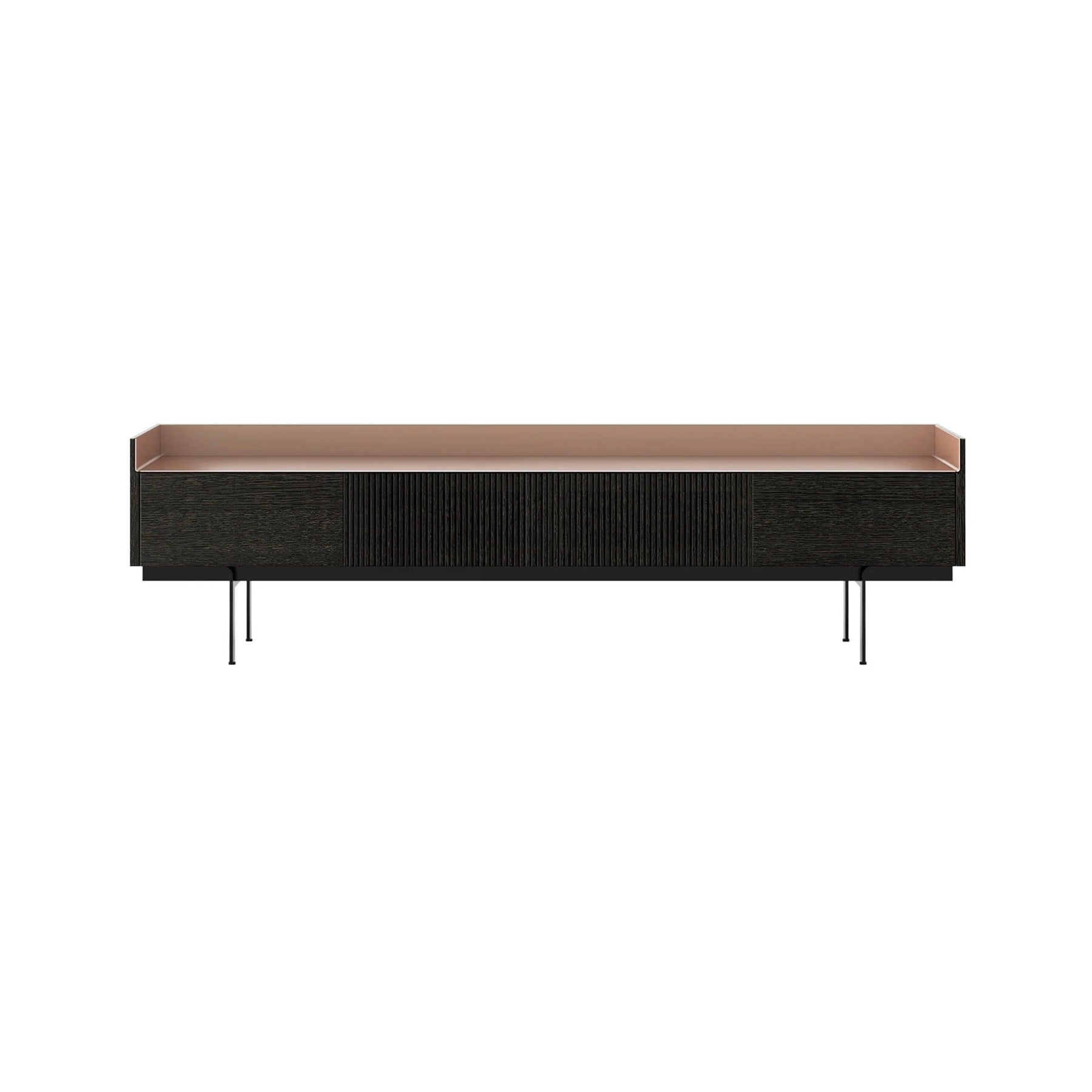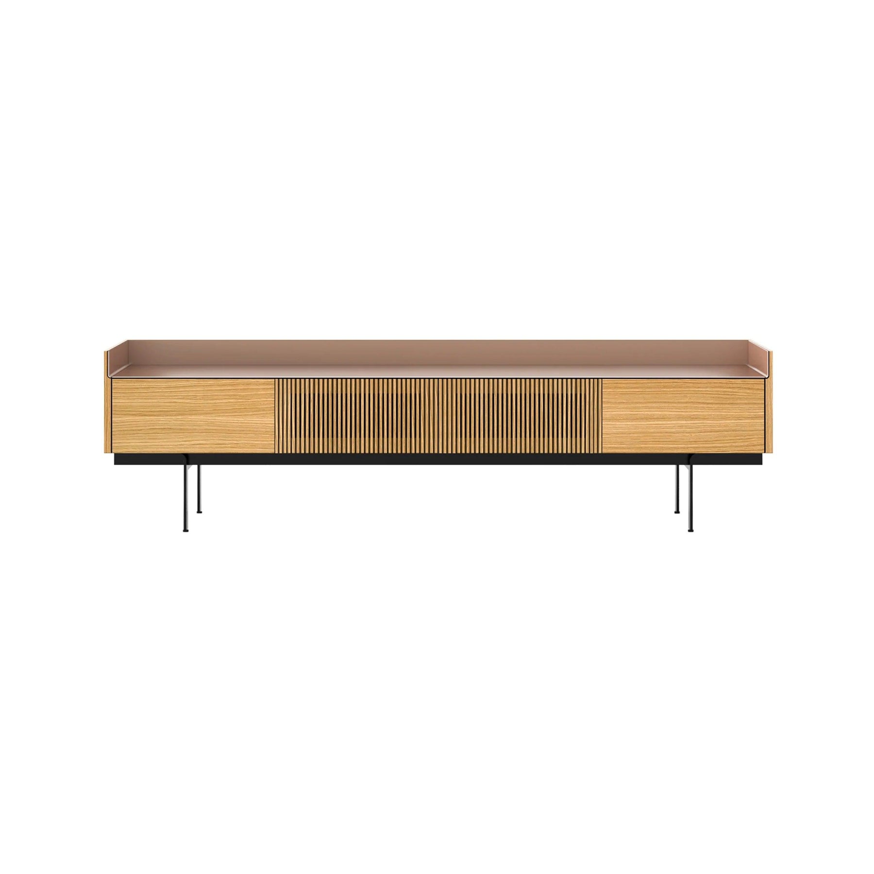 Discover the superb storage potential with the Stockholm Slim Sideboard: STH453 by Punt. Designed by Mario Ruiz, this large sideboard features two central drop-down slatted TV doors and solid doors on each side. The sideboard offers flexible storage options with its interior height-adjustable shelves and integrated cable management feature. The signature aluminum top, available in a range of lustrous finishes, contrasts beautifully with the sleek oak or walnut cabinetry, which is also offered in a variety of finishes. The sideboard sits on a sturdy metal base, finished in a durable black or bronze epoxy powder coat, enhancing its modern and sleek appeal.