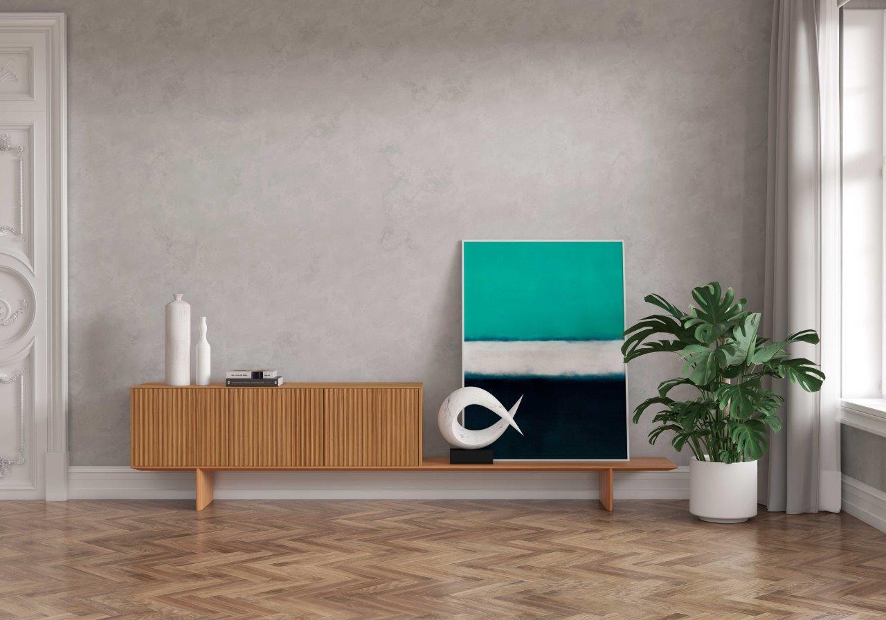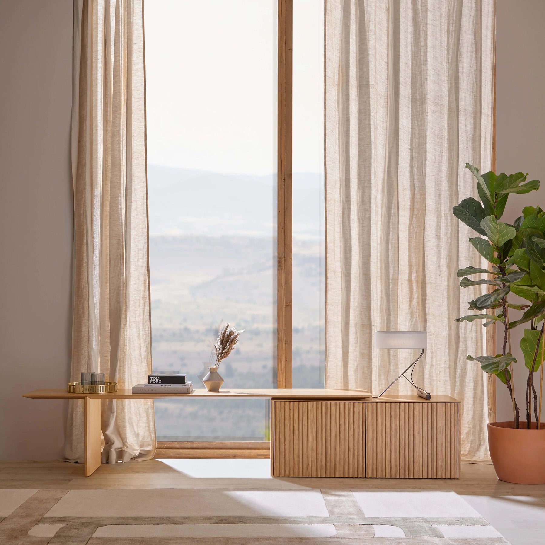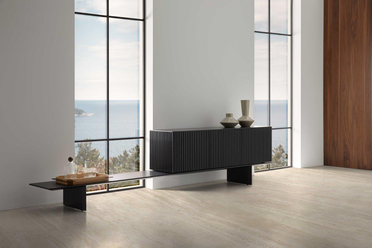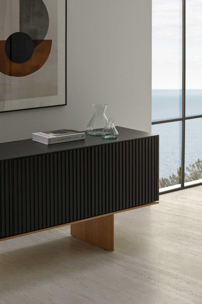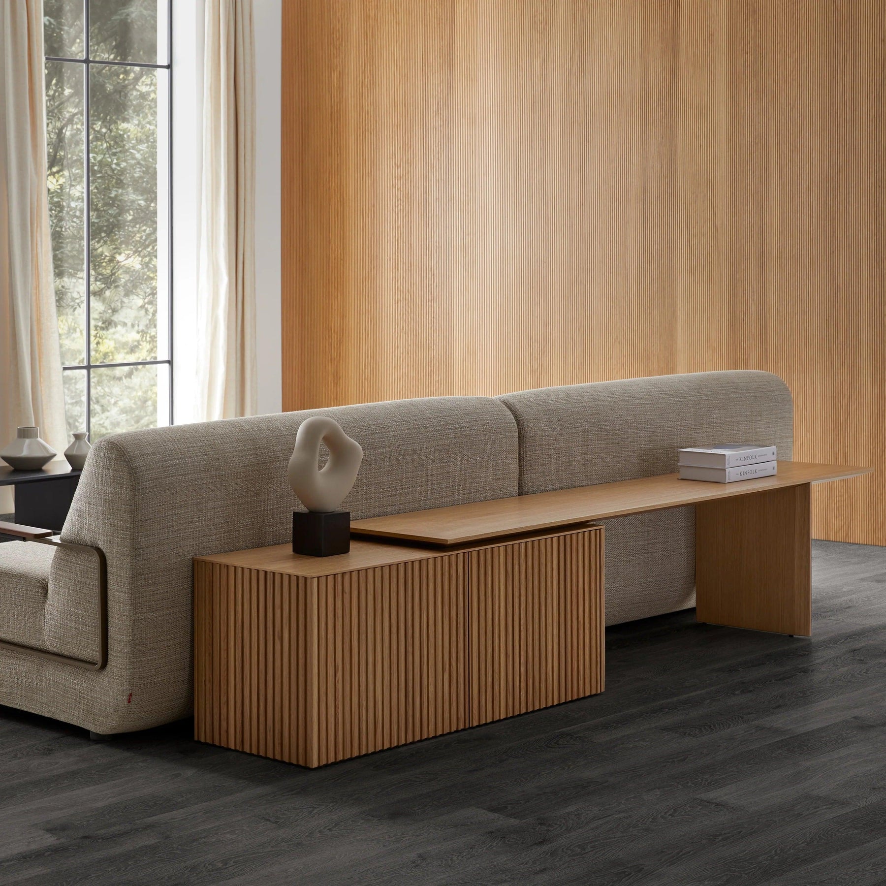Immerse in the charm of functional versatility with the double-unit Velasca Extensible: Composition 1. Conceptualized by the celebrated design duo Ludovica + Roberto Palomba, this unit cleverly combines elegance with practicality, featuring an extendable top surface that adapts to your space requirements. Crafted in rich veneered oak, it adds a warm minimalist aesthetic to any room. The additional flourish of vertical slats on the doors and side panels creates a design that's both visually appealing and distinctive.