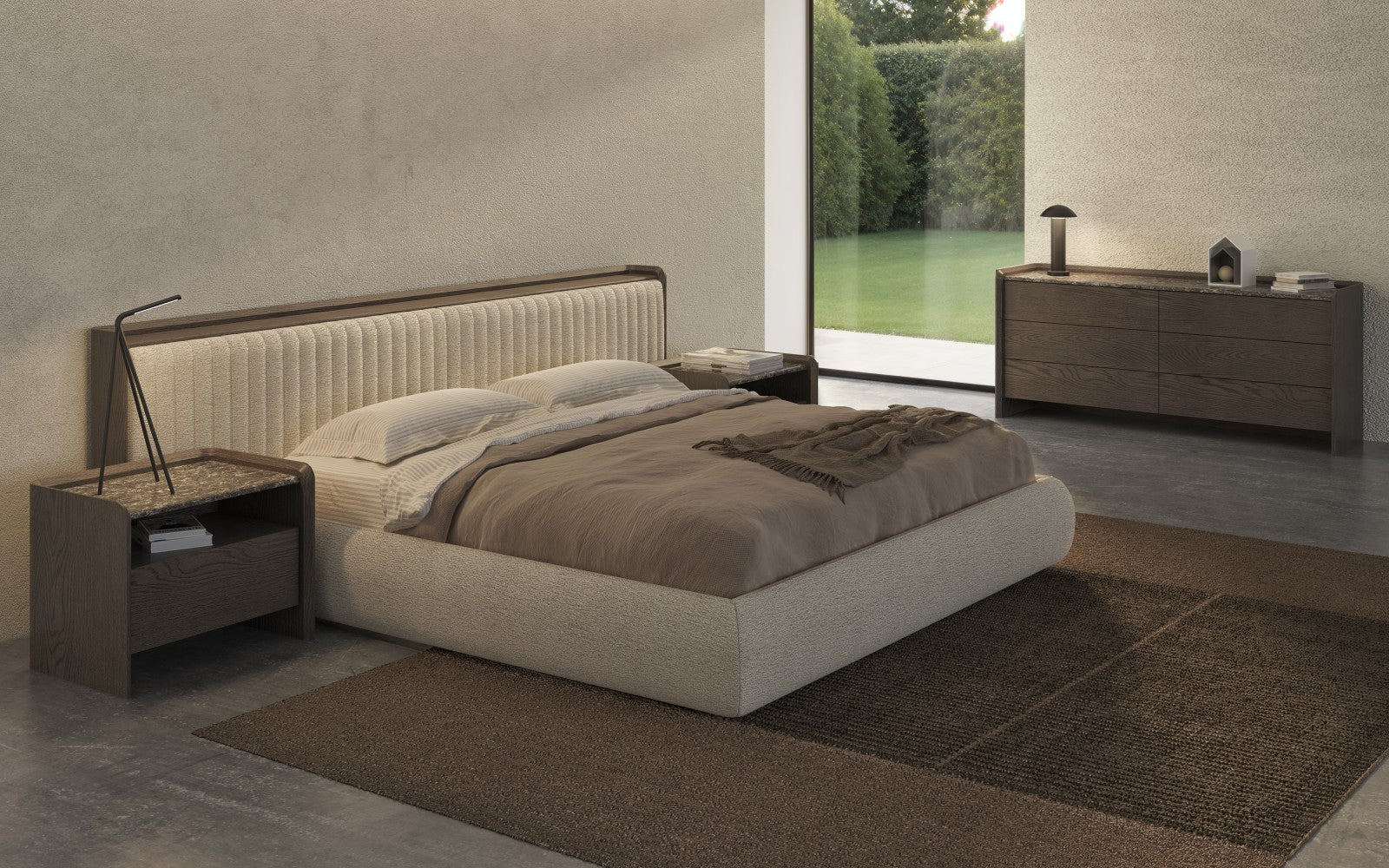 The Colette is a modern upholstered bed with an integrated shelf, thoughtfully designed to bring comfort, function, and architectural elegance to the bedroom. Its fully upholstered platform frame features soft, rounded lines that create a calming presence, while the vertical channel-tufted headboard introduces tailored structure and refined symmetry.