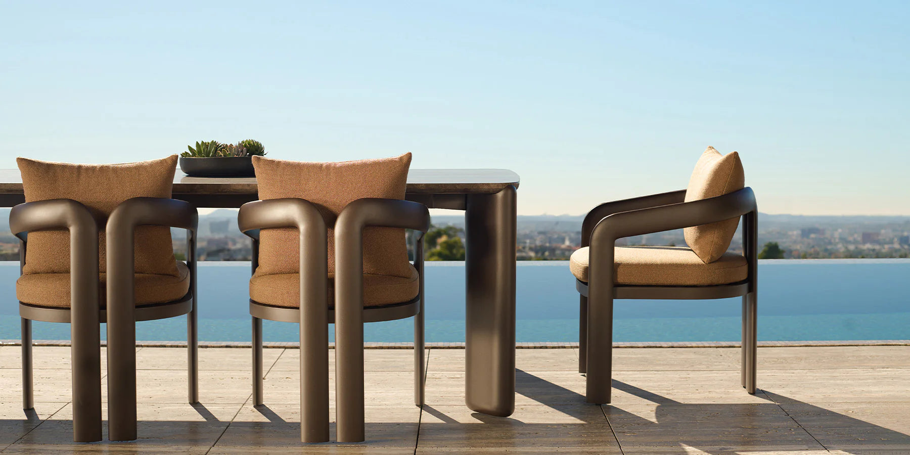 The travertine top features a reverse rounded demi-bullnose edge and a distinctive soft-rectangle shape—intentionally designed without sharp right angles and gently bulging between the ends for a contemporary, organic feel. The interplay of natural stone and sculptural aluminum creates a luxe, versatile design that complements a wide range of outdoor styles. Comfortably seating eight to ten guests, this table is ideal for entertaining and pairs beautifully with the matching Chloe Dining Chairs.