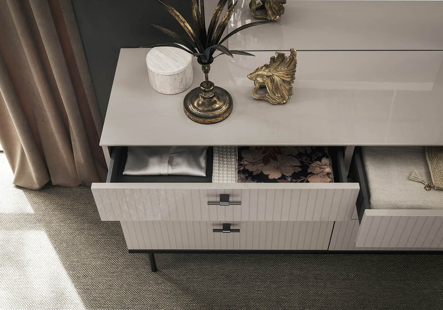 Made in Italy by ALF Group, the Claire Bedroom Collection by ALF Italia is a luminous expression of modern Italian bedroom furniture, blending refined elegance with everyday functionality. Finished in a sophisticated Pearl High Gloss lacquer with Pearl Line High Gloss detailing on the front panels, Claire delivers a bright, polished aesthetic that enhances both contemporary and transitional interiors.