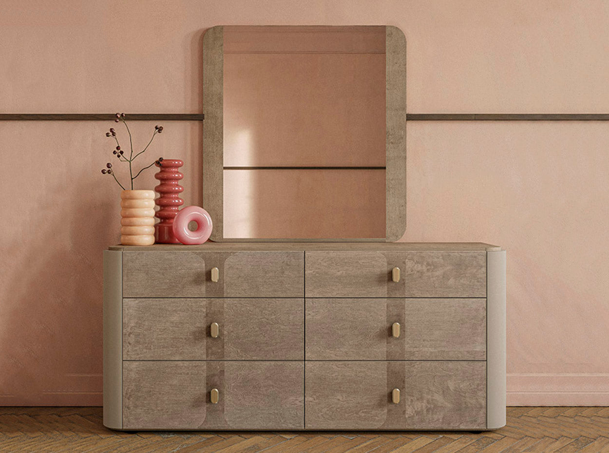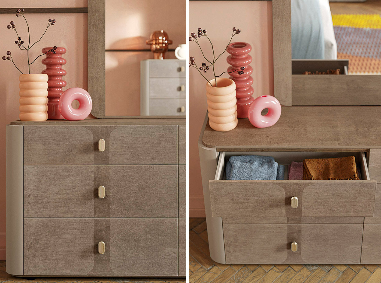 The complete Hebe Bedroom Collection includes coordinating nightstands, dresser, mirror, and chest, each thoughtfully designed to create a cohesive and harmonious interior. The tops of each piece are finished in Matte Mild Umber, while the frames feature a Matte Saddle Birch finish — a refined pairing that delivers Warm Neutral Luxury with Timeless Glamour.