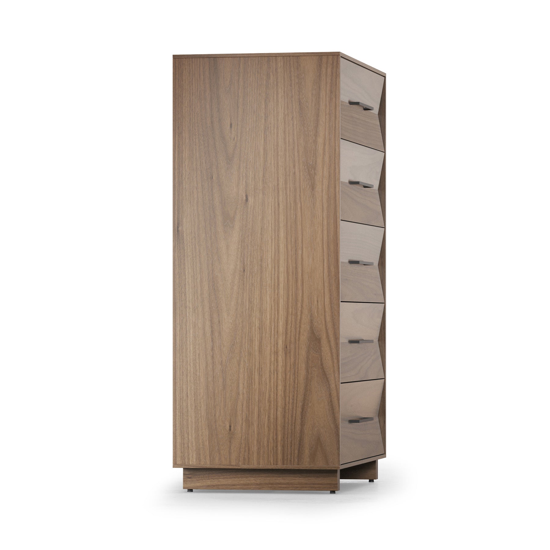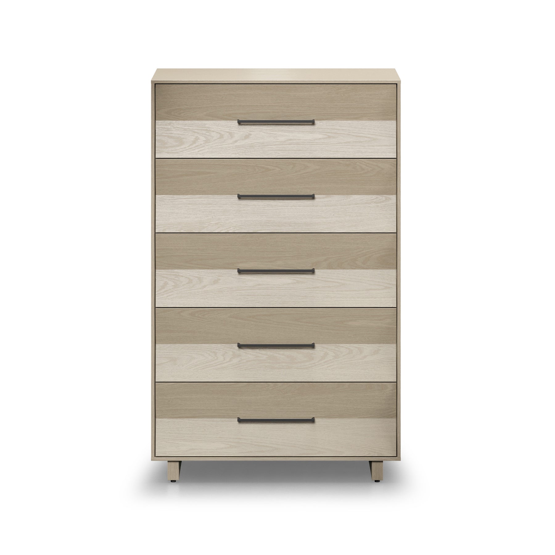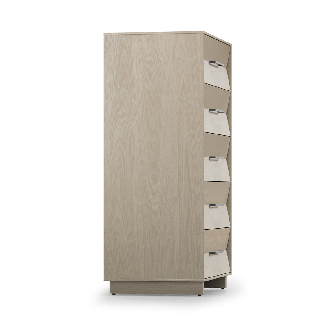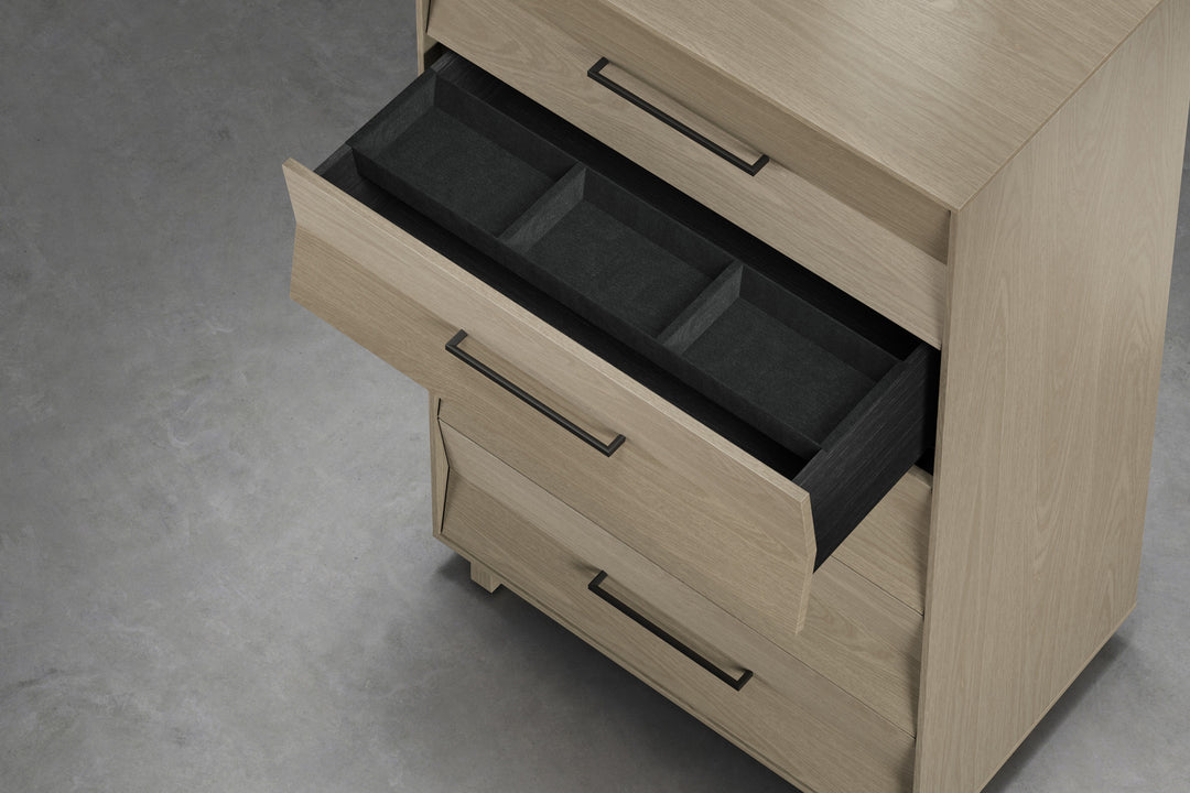 The Kava 9685 Chest by BDI combines vertical storage with minimalist elegance. Designed with five soft-close drawers and a streamlined profile, this tall chest offers generous capacity while maintaining a clean, modern silhouette. Crafted in Washed Oak or Natural Walnut, the piece includes a removable velvet-lined tray, powder-coated drawer pulls, and a safety-enhancing interlock system—delivering the perfect blend of style, function, and peace of mind.