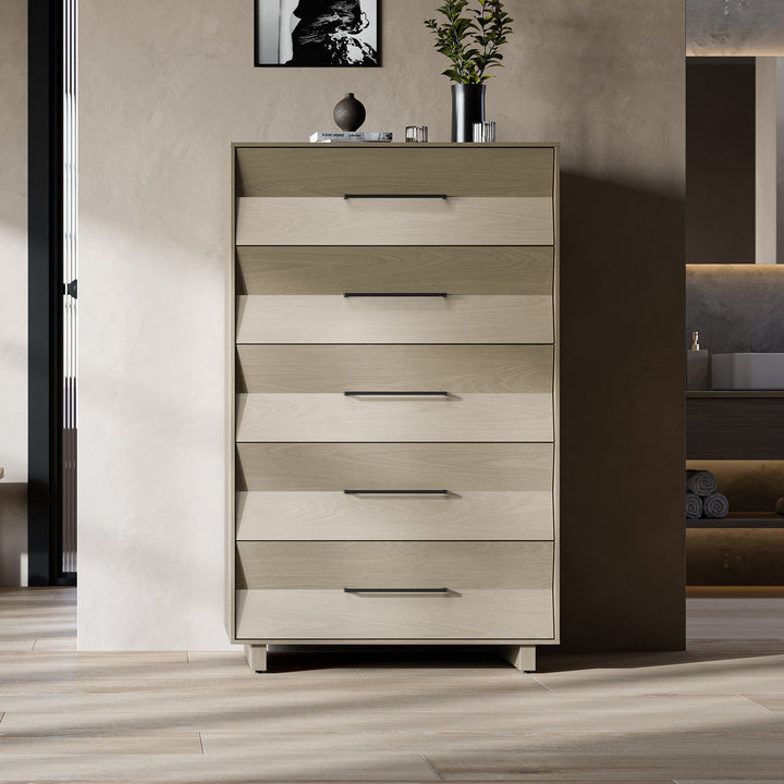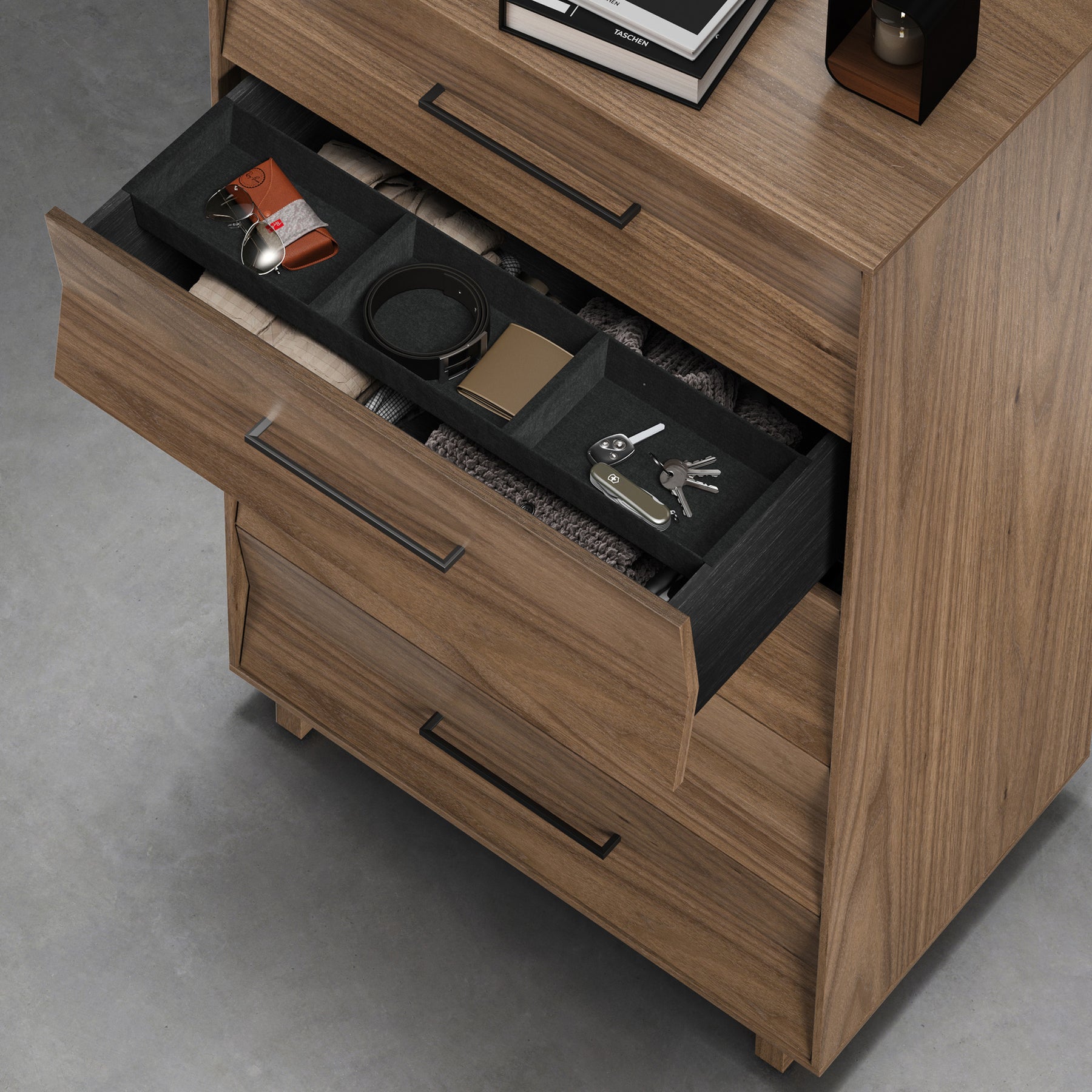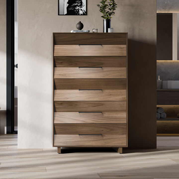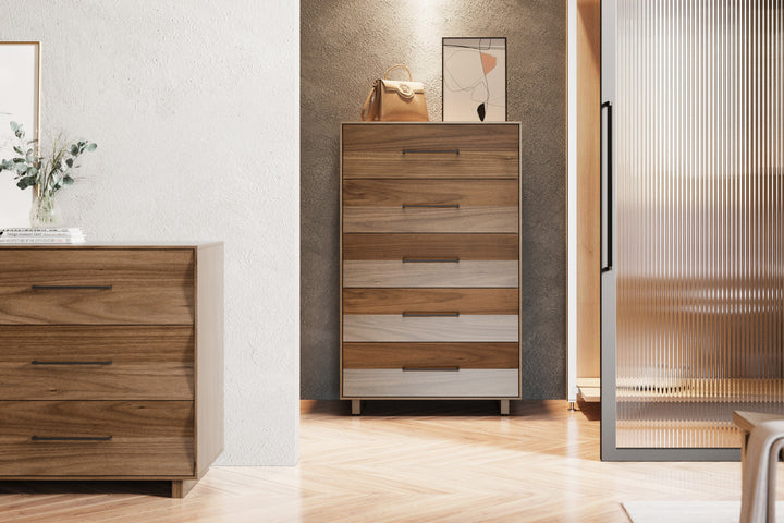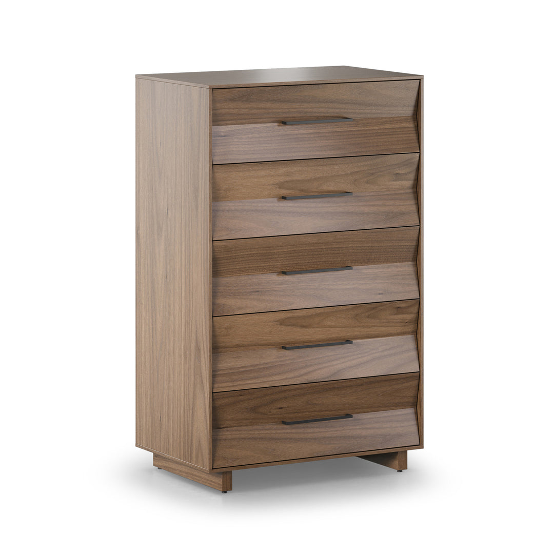The Kava 9685 Chest by BDI combines vertical storage with minimalist elegance. Designed with five soft-close drawers and a streamlined profile, this tall chest offers generous capacity while maintaining a clean, modern silhouette. Crafted in Washed Oak or Natural Walnut, the piece includes a removable velvet-lined tray, powder-coated drawer pulls, and a safety-enhancing interlock system—delivering the perfect blend of style, function, and peace of mind.