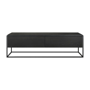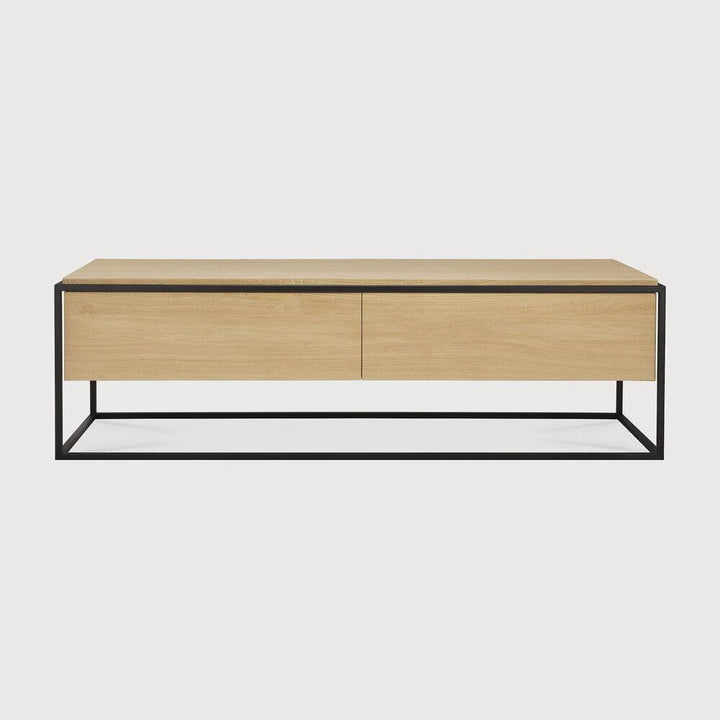 The Monolit Media Console from Ethnicraft embodies a perfect harmony of form and function, offering Scandinavian sophistication to your living space. Crafted from solid oak and set upon a robust black metal frame, this media console is not just a furniture piece—it's a statement of simplicity and elegance. With one push-open drawer and one flip-down door, it provides ample storage for your electronics and media, making your entertainment area both stylish and organized. Designed for durability and aesthetic appeal, the Monolit Console is an essential foundation for your flat-screen TV, enhancing every movie night with style and comfort.