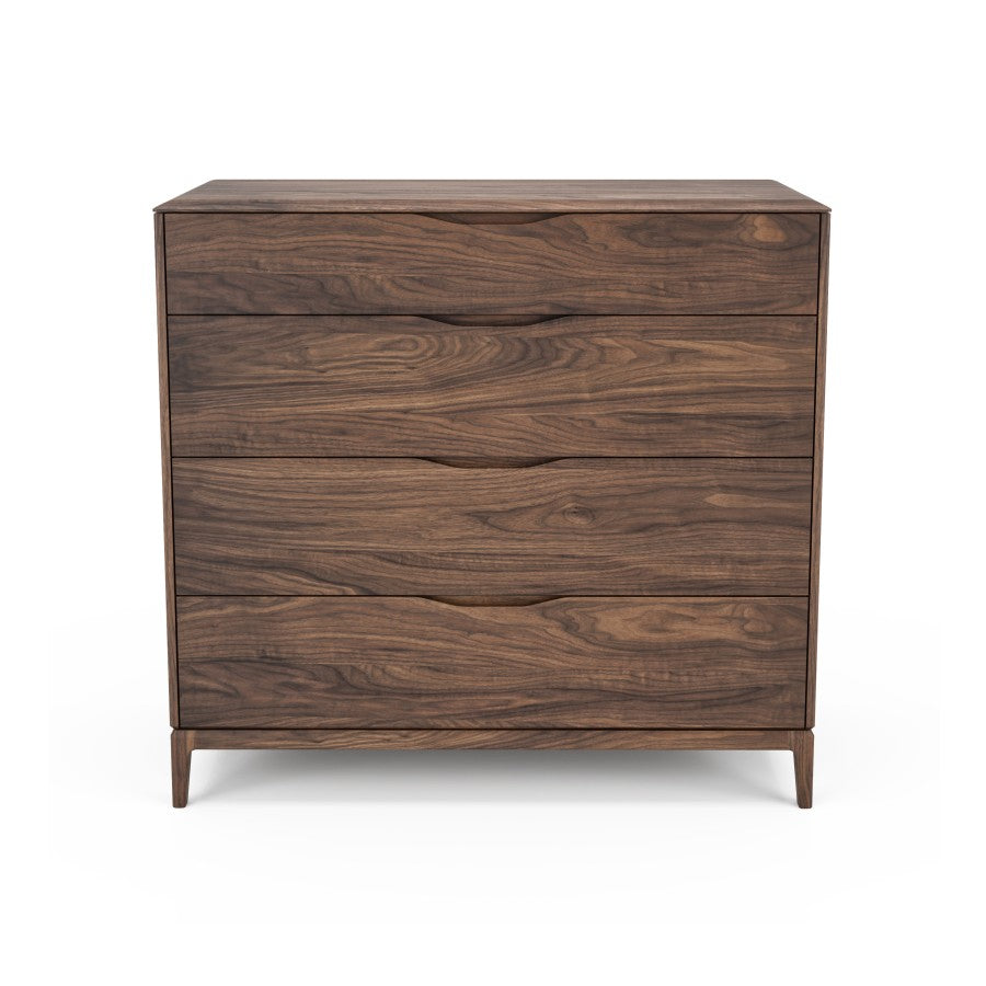 The River Chest of Drawers by Huppé, designed by Joel Dupras, combines timeless craftsmanship with modern minimalism. Made from solid ash or walnut with a slightly tapered solid wood base, this piece offers four spacious drawers with sculpted fronts for a smooth, effortless open. The clean lines and refined silhouette bring lightness to your bedroom, while the natural grain variations ensure each chest is truly unique.