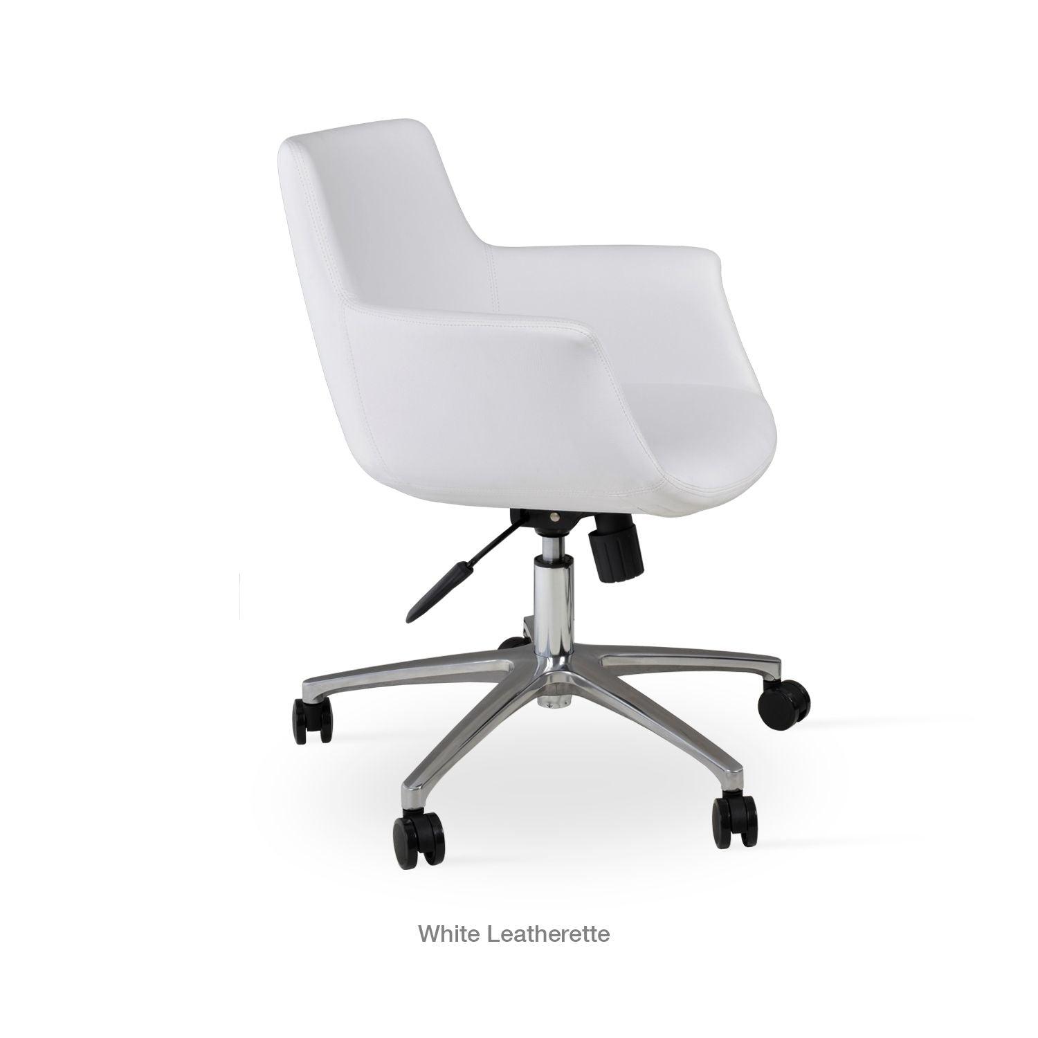 The Bottega Office chair is a contemporary chair with a comfortable upholstered seat and backrest on a height-adjustable gas piston base that swivels and tilts. The chair has a chromed steel five-star base with plastic casters. The seat has a steel structure with “S” shape springs for extra flexibility and strength. This steel frame is molded by injecting polyurethane foam. Bottega seat is upholstered with a removable zipper enclosed leather, PPM, leatherette, or wool fabric slipcover. Bottega Office may be upholstered with various colors as a special order with a minimum quantity required. The chair is suitable for both residential and commercial use.