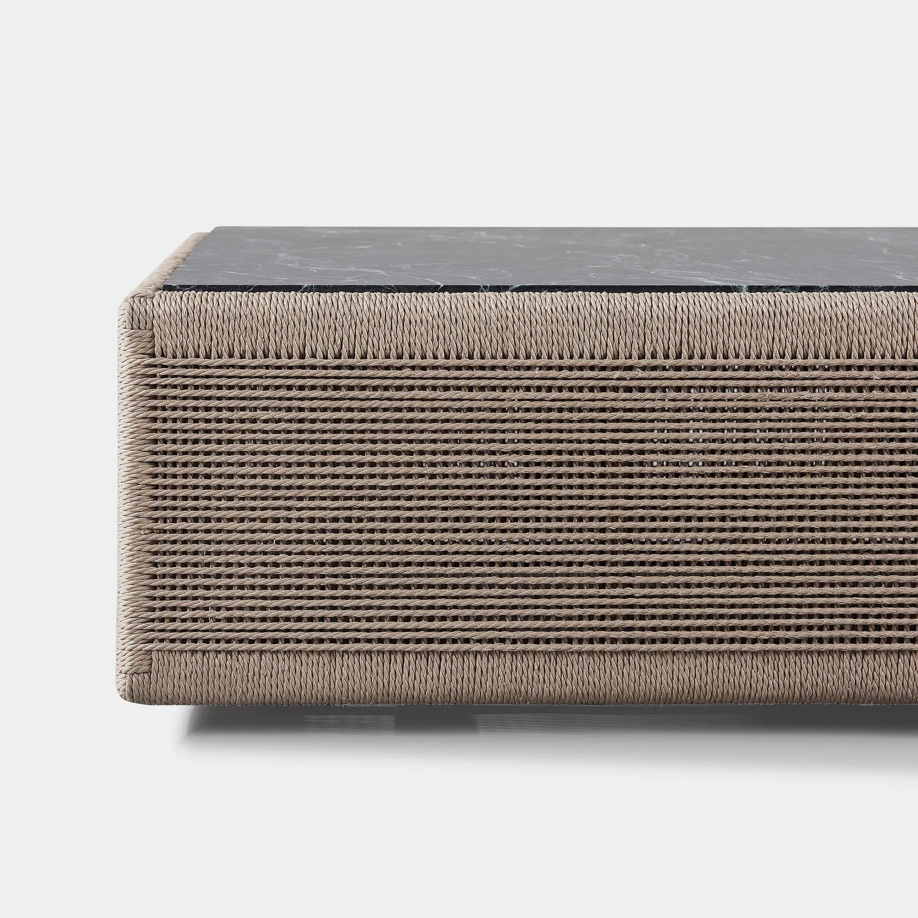 Designed by Kara Mann. Featuring an exposed aluminum tube, twisted all-weather rope, and deep green marble, our Formentera collection is an organic luxury. The Formentera Round Dining table transforms traditional aesthetics for a coastal lifestyle — featuring a classic central plinth silhouette, hand woven with all-weather rope in our workshop. The rope features a twisted detail that recalls functional nautical ropes. At the same time, the vertical up-and-down pattern highlights the simplicity of form and allows light to pass through the rope onto the aluminum substructure. Topped with a stone surface in your choice of marble or travertine for an earthy detail, this piece is the perfect mix of contemporary materials for any outdoor space.