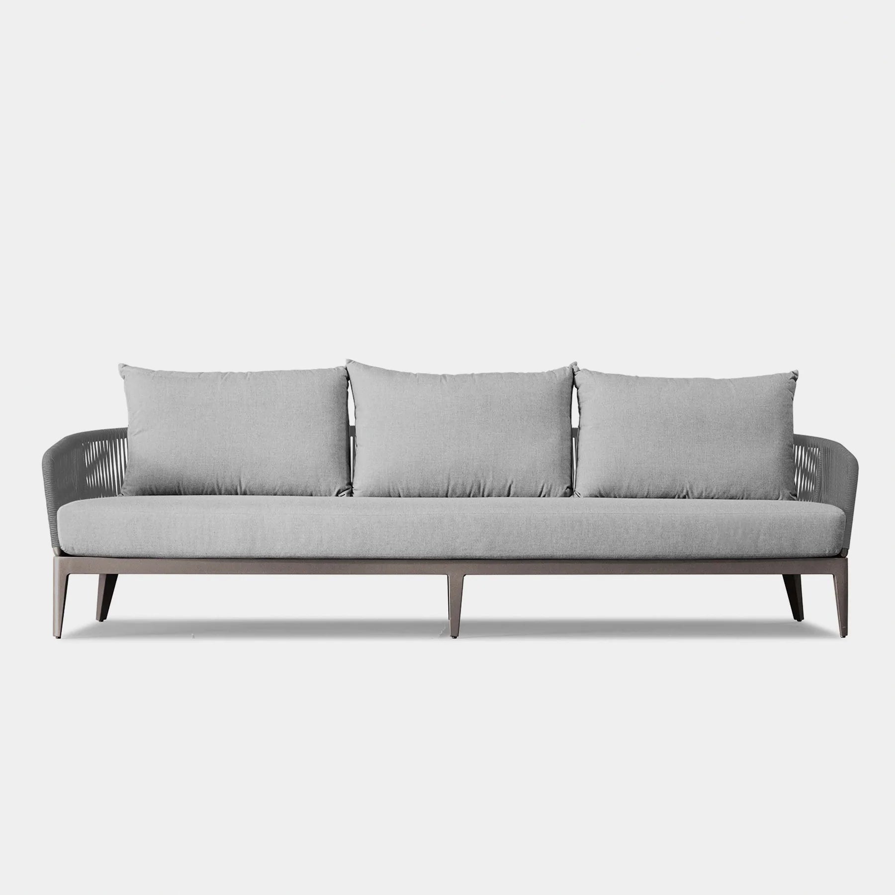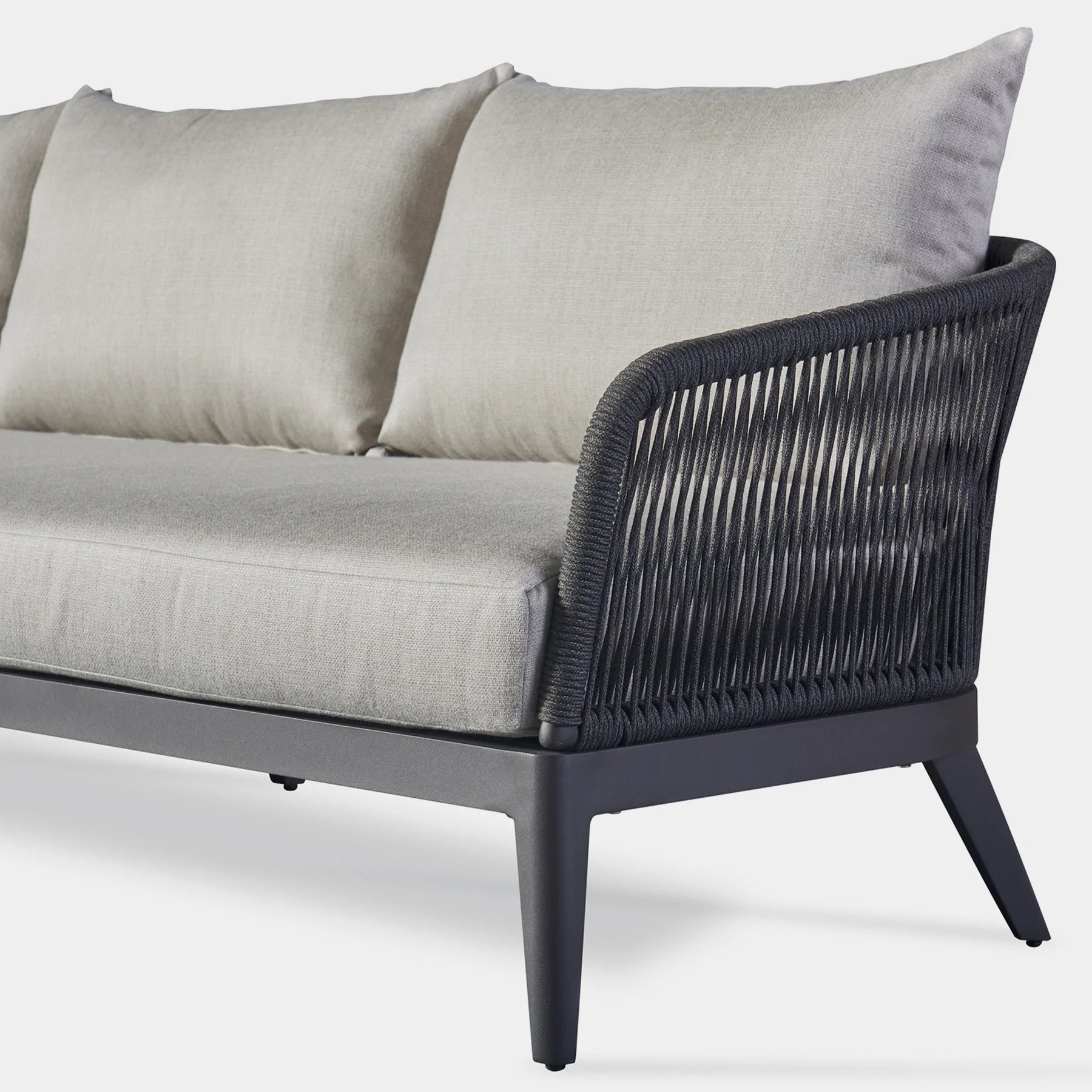 The Hamilton collection pairs clean lines with practical design. The Hamilton 3 Seat Sofa is contemporary comfort — featuring an extruded aluminum frame with tapered legs, sculptural backrest contours, and double–layered woven Olefin rope accents. Enjoy a plush all-weather bench cushion with a knife–edge back cushions for total comfort. This effortless piece is made to be incredibly versatile, elevating any smaller space.