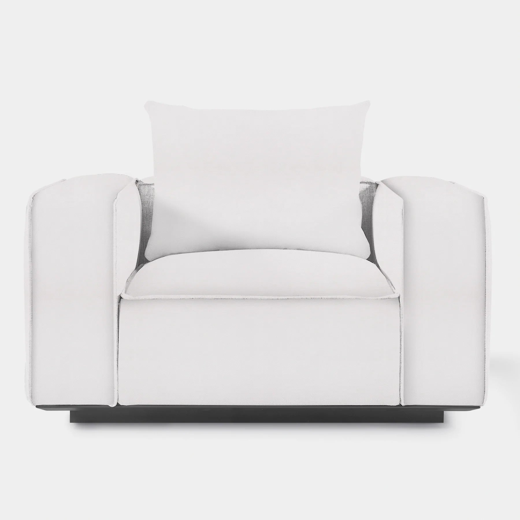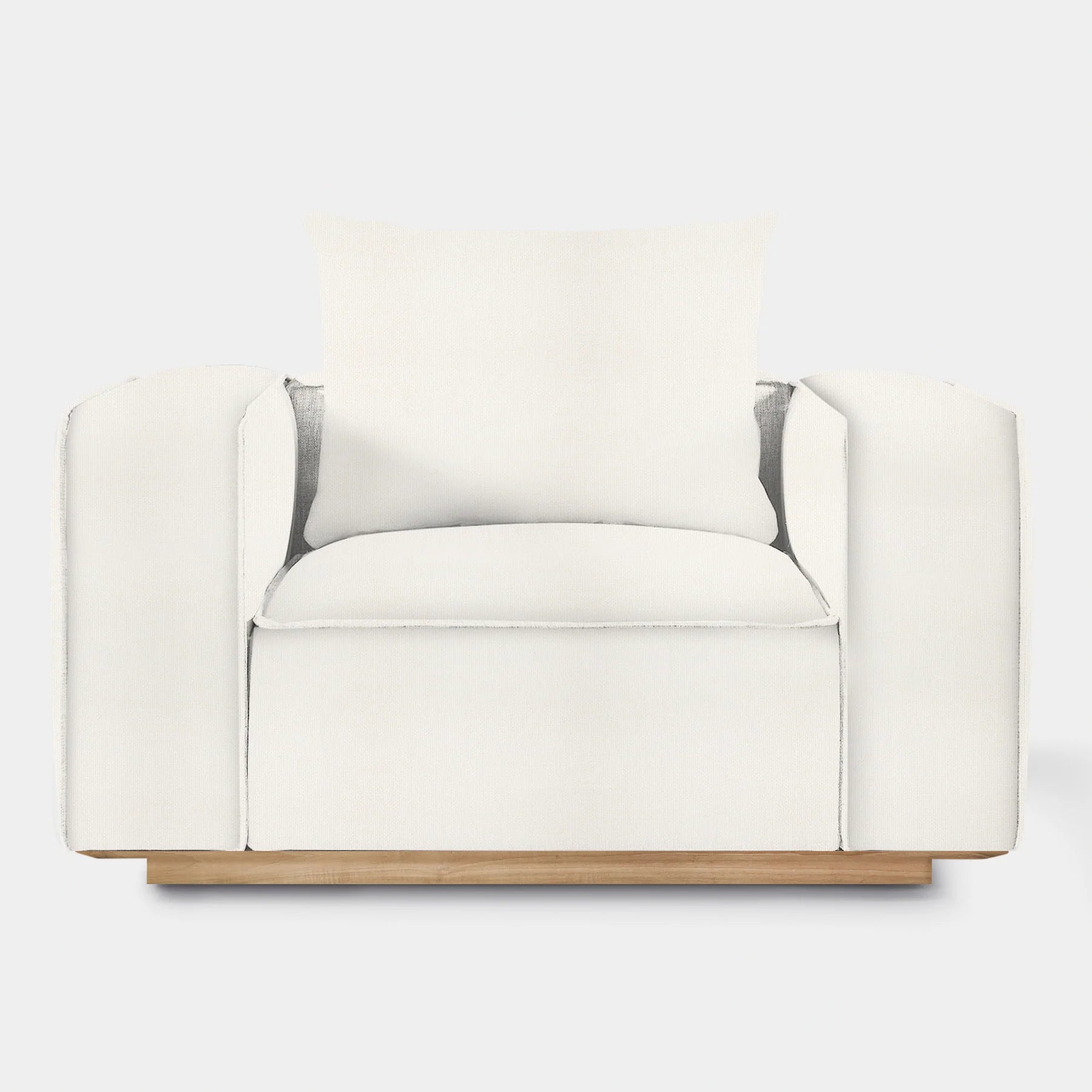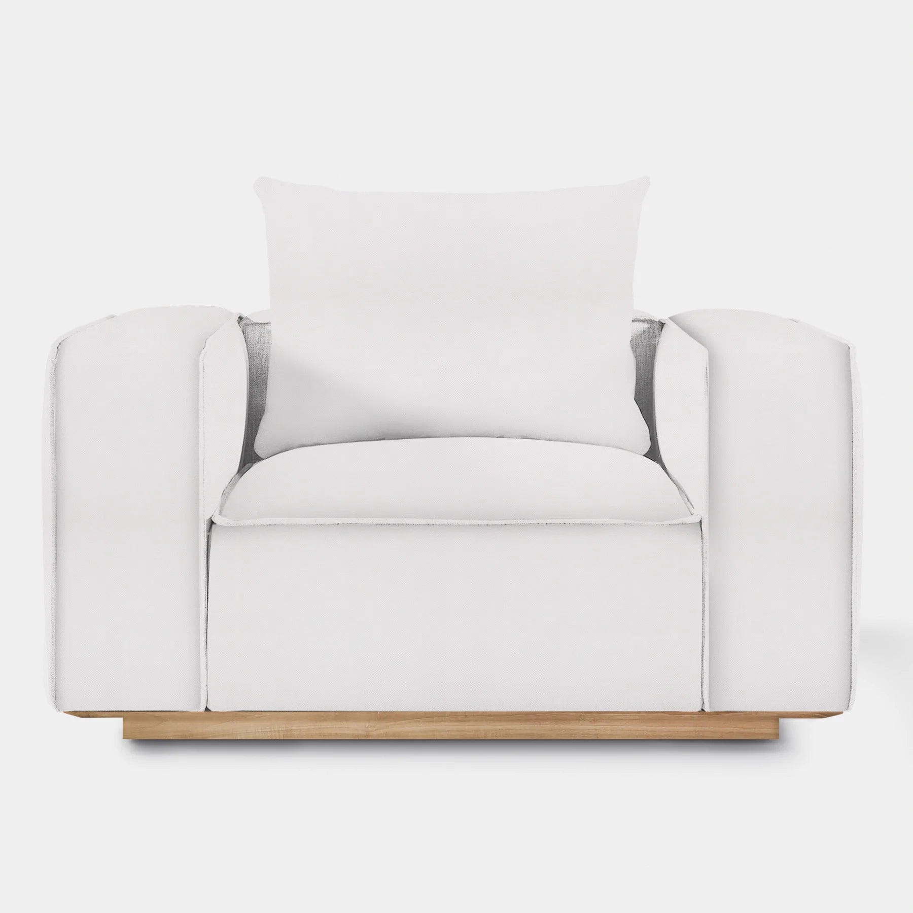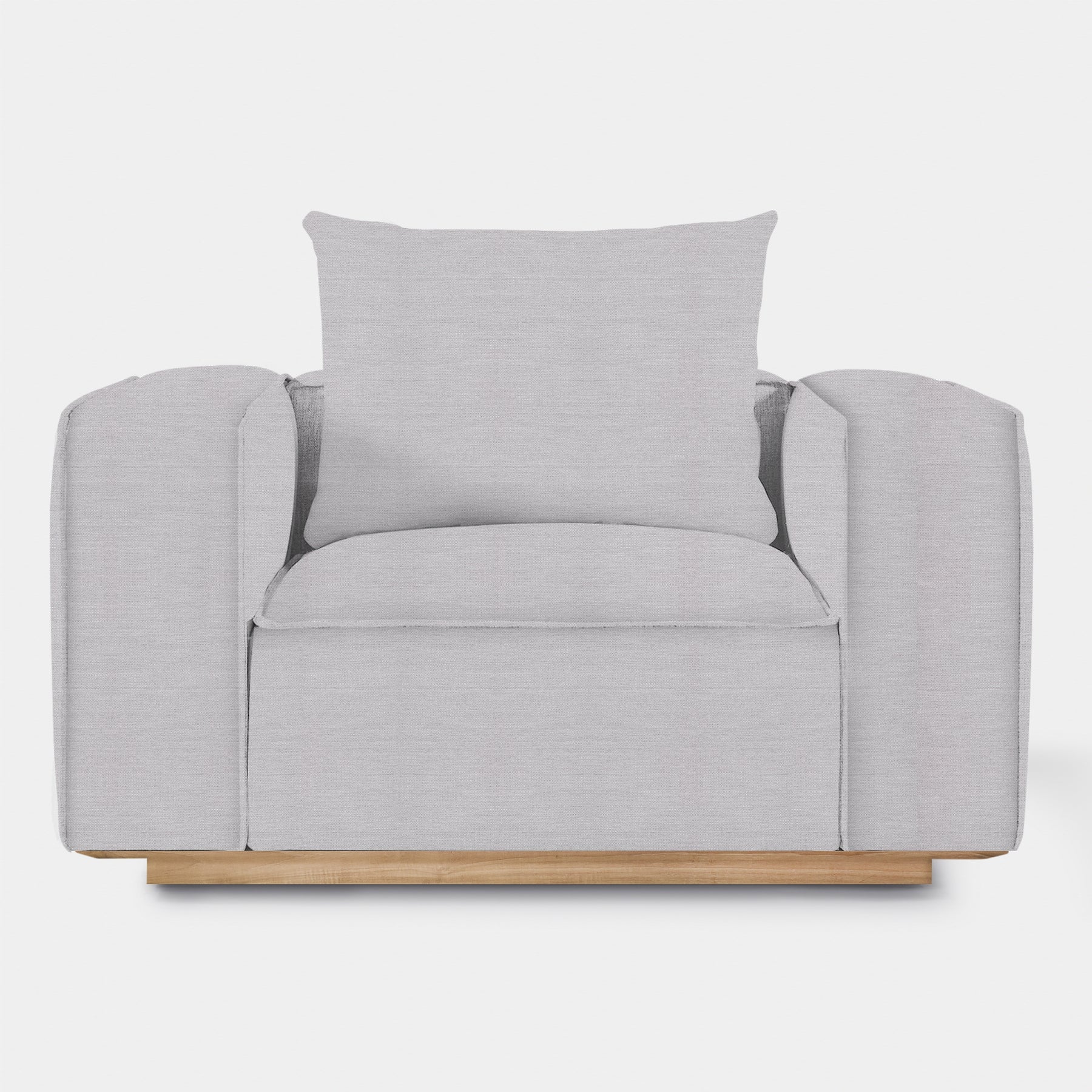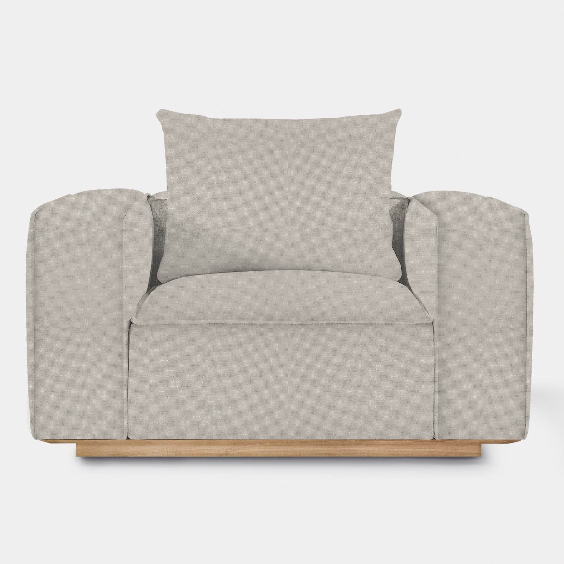 Building on our years of experience in outdoor design, the popular fully upholstered Santorini collection offers versatility in modular seating. Our smaller sofa, the Santorini collection is pure comfort — sink into an extra generous tight seat cushion with an all-weather suspension system and accent pillows, all floating on a plinth base in a choice of aluminum or teak. This easygoing modular component can be configured to fit an existing smaller space — and is always adaptable to the next space.