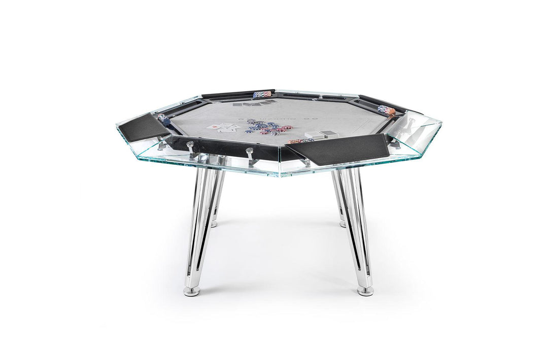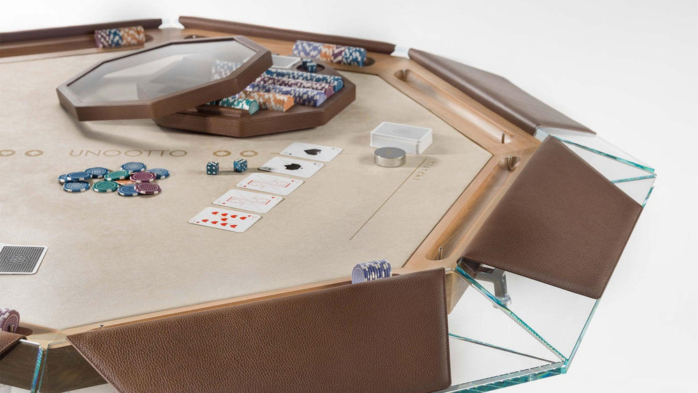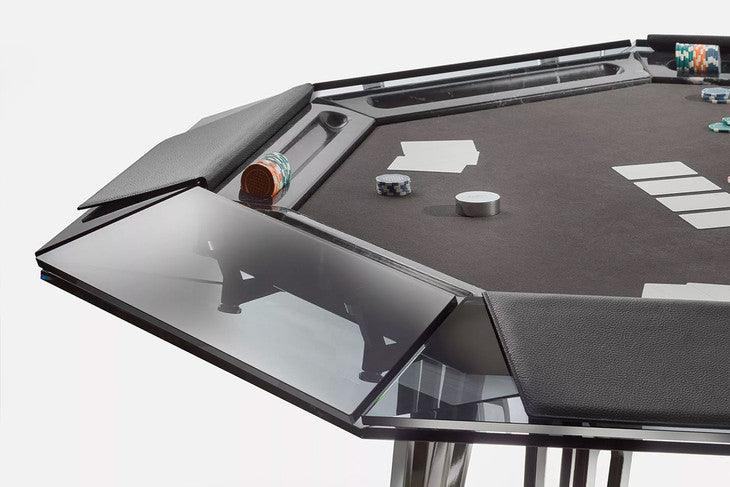 Each poker table in our collection showcases a unique design, featuring a range of customizable materials and finishes to suit your individual taste. From sleek glass frames to elegant oak or marble accents, these modern poker tables are the epitome of refinement and innovation. Our selection includes tables with luxurious Alcantara® playing surfaces, genuine leather armrests, and polished chrome or blackened nickel hardware, ensuring that you'll find the perfect addition to your game room.
