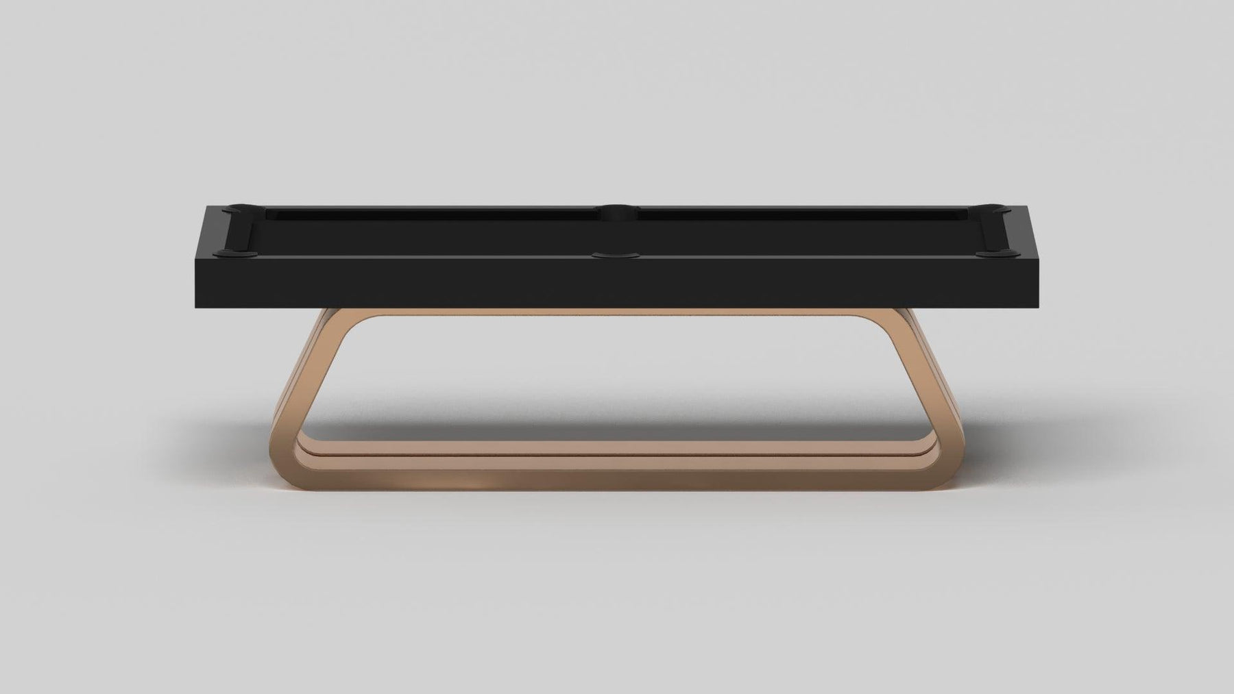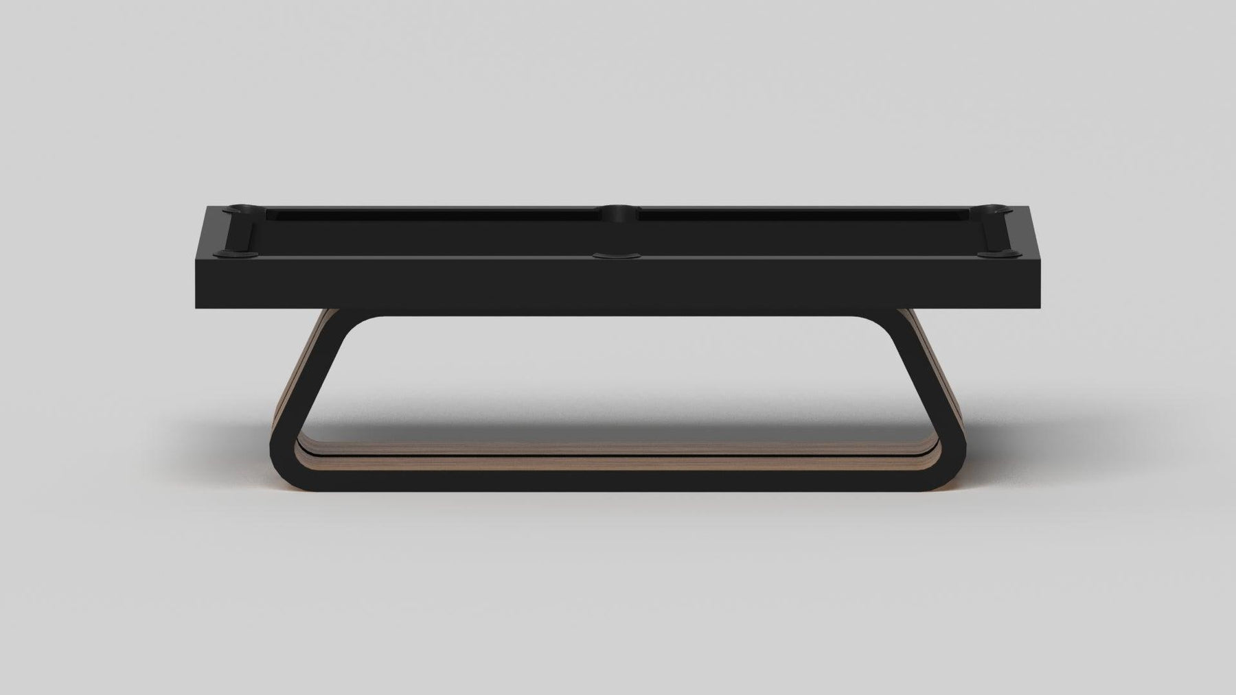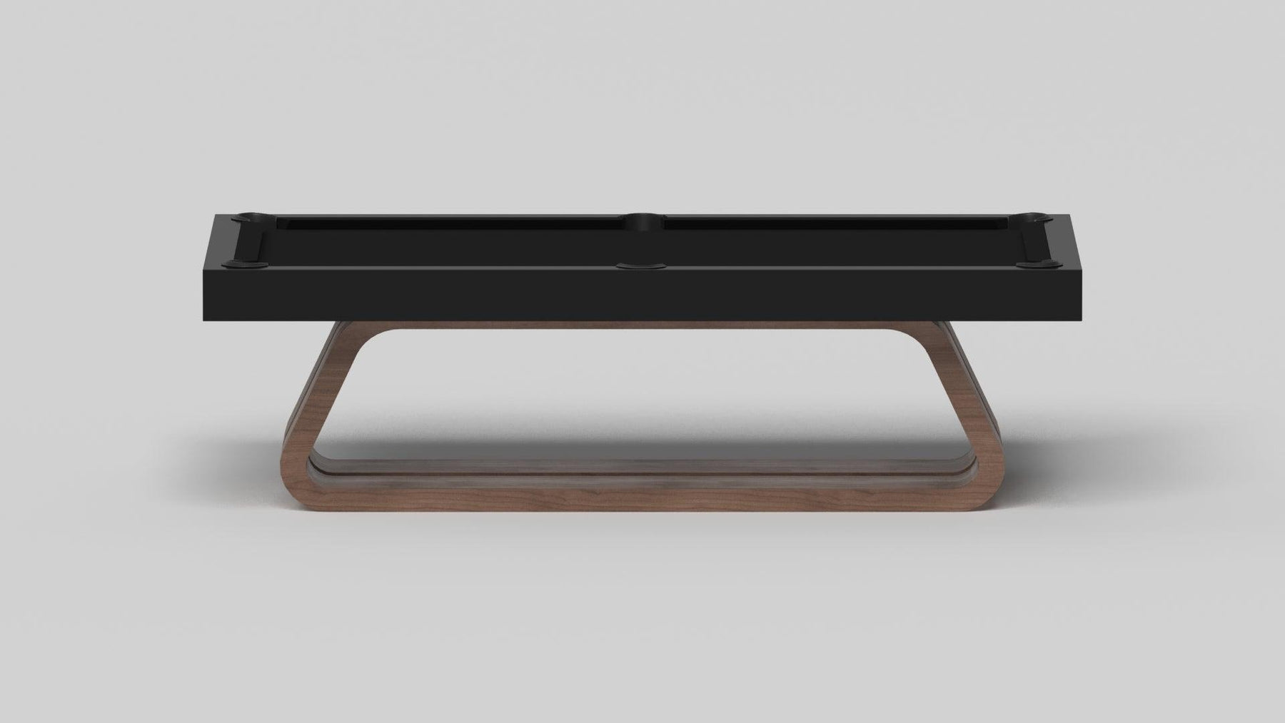 The LUGE Pool Table by Elevate Customs is a striking embodiment of both form and function, capturing the essence of movement and speed. Its unique design features an open base with sweeping curves and smooth edges, fashioned in rich walnut to impart a light, airy feel. The table's split base, with open sides, showcases a dynamic and continuous curvature, offering a visual contrast to the classic rectangular tabletop. This juxtaposition of the rounded base and linear top creates a balance that is both aesthetically pleasing and functionally sound. The table's surface is adorned with a high-quality felt, inviting hours of engaging gameplay and enhancing the overall experience.