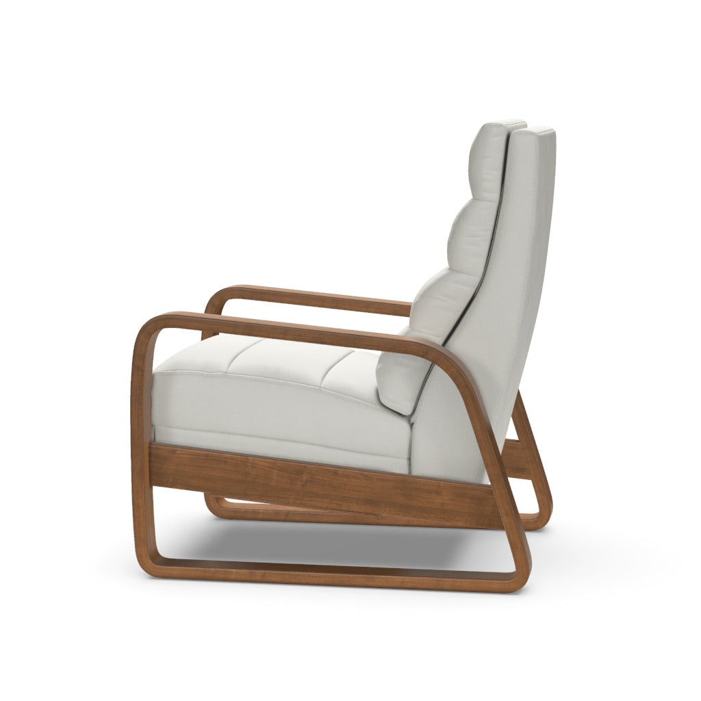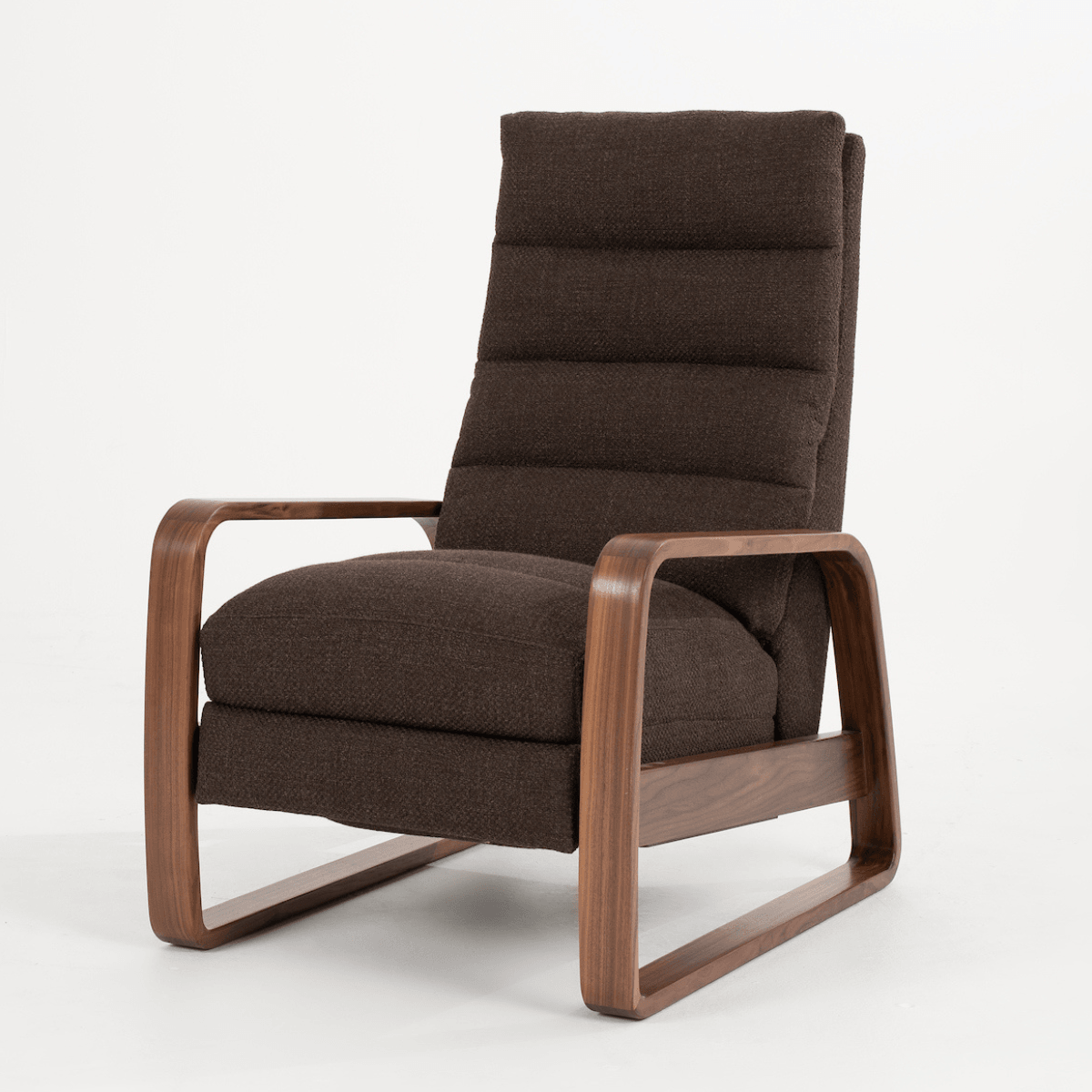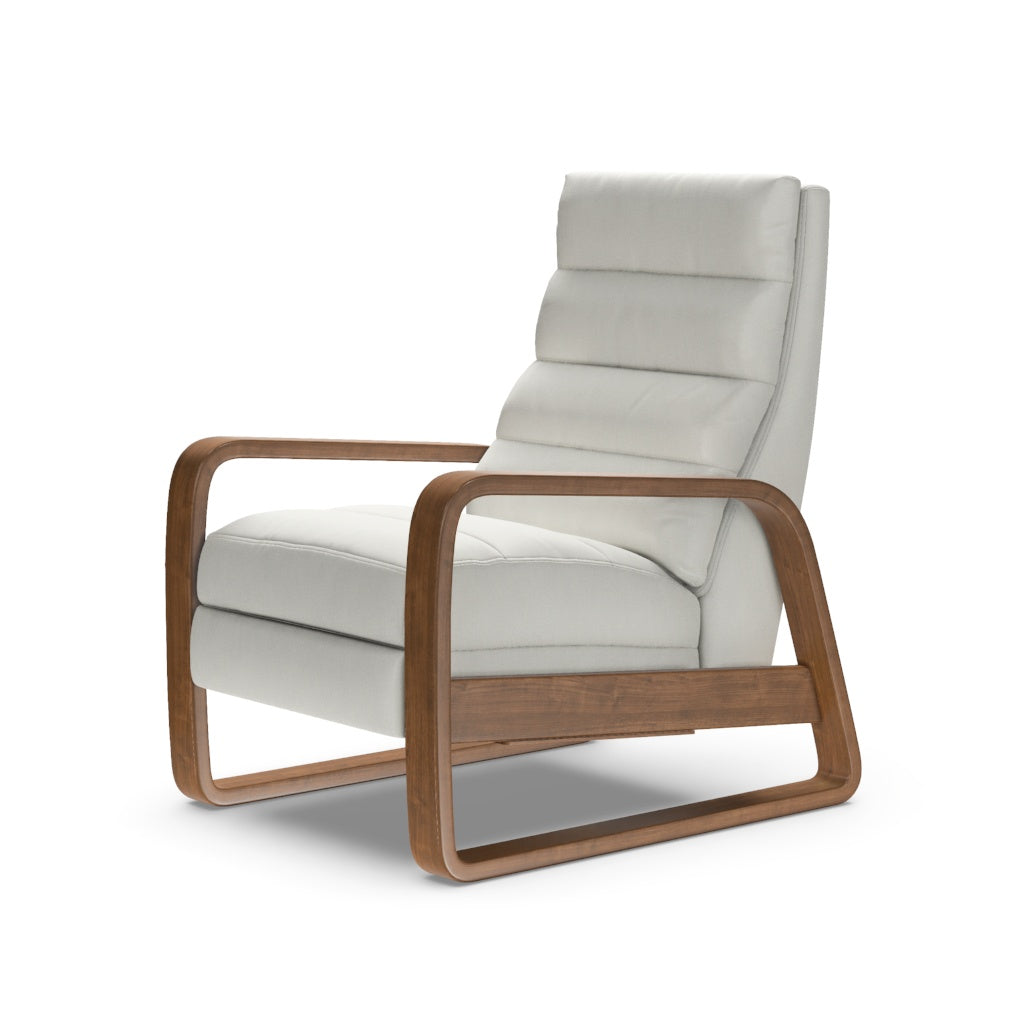 The Elton Re-Invented Recliner by American Leather draws inspiration from classic Scandinavian ski sleds, combining sleek design with robust craftsmanship. Its sculpted wooden arms flow into soft geometric shapes, creating the impression of effortless motion. With an invisible reclining mechanism and down-filled, channel-tufted back and seat cushions, the Elton offers unmatched comfort wrapped in timeless style.