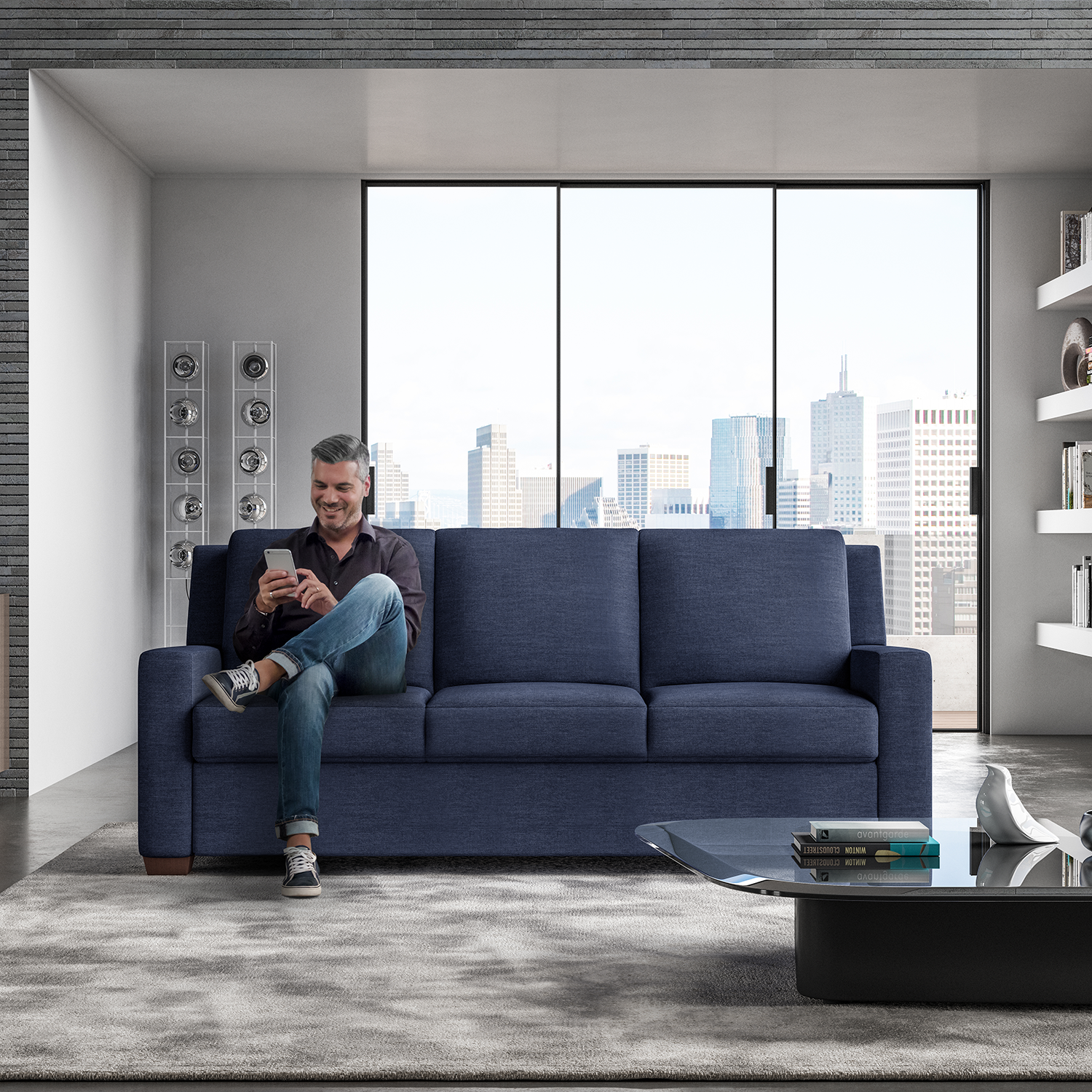 The Lyons Comfort Sleeper by American Leather combines timeless elegance with modern functionality. Featuring a classic track arm and proportioned cushions, this sleeper boasts a sleek look from every angle. With 8" more sleeping space than traditional sleepers, the patented Tiffany 24/7™ platform offers unparalleled comfort. Perfect for small spaces, the Lyons Comfort Sleeper requires zero wall clearance and can be disassembled for narrow doorways and hallways.