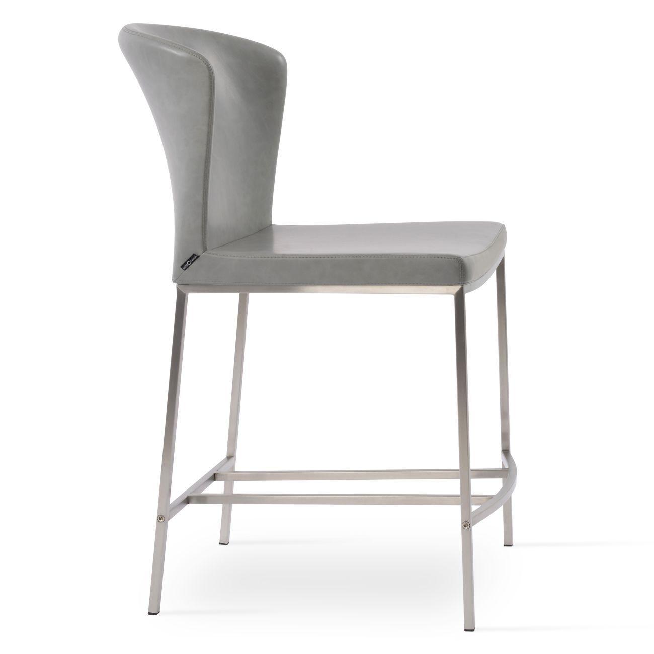The Capri Metal Stool is a modern counter and bar stool featuring a comfortable upholstered seat and backrest on brushed stainless steel legs with plastic tips. Its steel structure has "S" shaped springs for added flexibility and strength, while the polyurethane foam mold provides durability. This versatile stool is perfect for both residential and commercial use. Please note that a minimum order of 8 is required for "Special Order" colors.