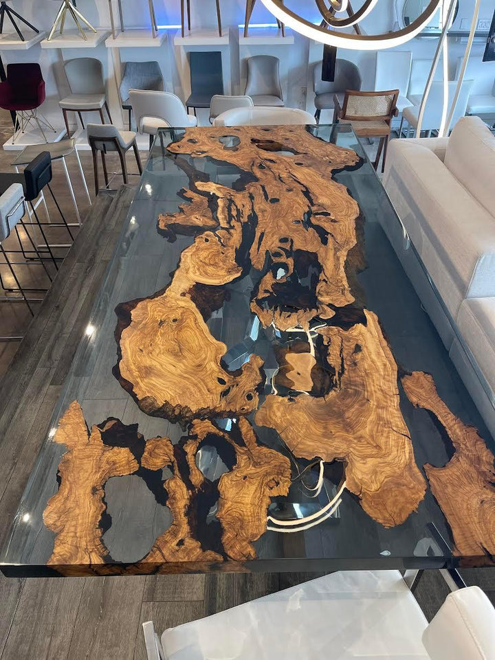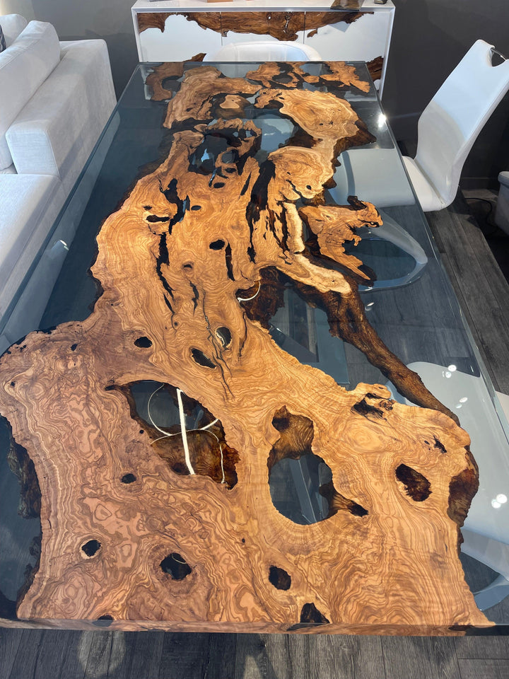 Each piece is made to order, offering complete customization in size, wood tone, resin color, and base finish. Whether you’re furnishing a dining room, luxury office, or statement entry, the Abruzzo Olive Table is both functional and sculptural—truly a collector's piece.