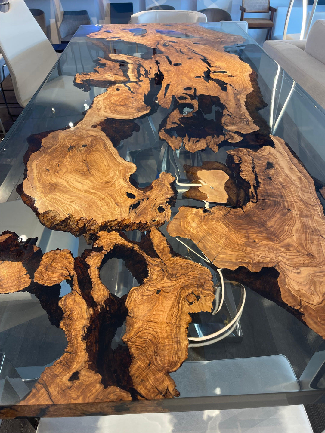 The Abruzzo Olive Dining Table by Arditi Design is a statement of artisanal excellence and bespoke luxury. Handcrafted in Florida using the finest selected olive wood and premium-grade epoxy resin, this one-of-a-kind table brings natural beauty and contemporary elegance into any space. The clear resin top highlights the intricate grain patterns of the solid wood slab, while a bold stainless steel base—available in gold or custom finishes—adds modern refinement.