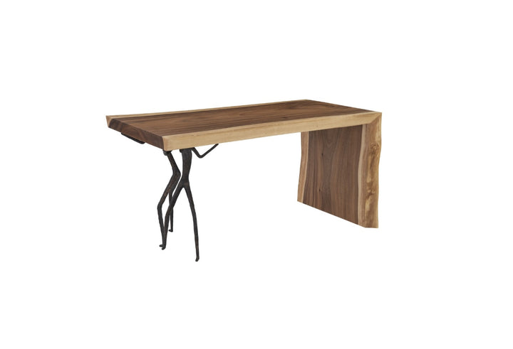 The Atlas Desk Natural, Waterfall Leg by Phillips Collection offers a beautiful juxtaposition of natural and sleek elements. With its flowing reclaimed chamcha wood top and side, paired with sleek metal legs, this desk is the epitome of modern organic design. Ideal for home offices, the Atlas Desk combines both playful and serious design elements to create a workspace that is as functional as it is stylish.