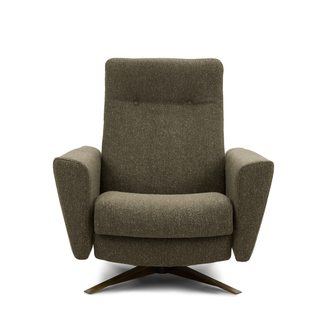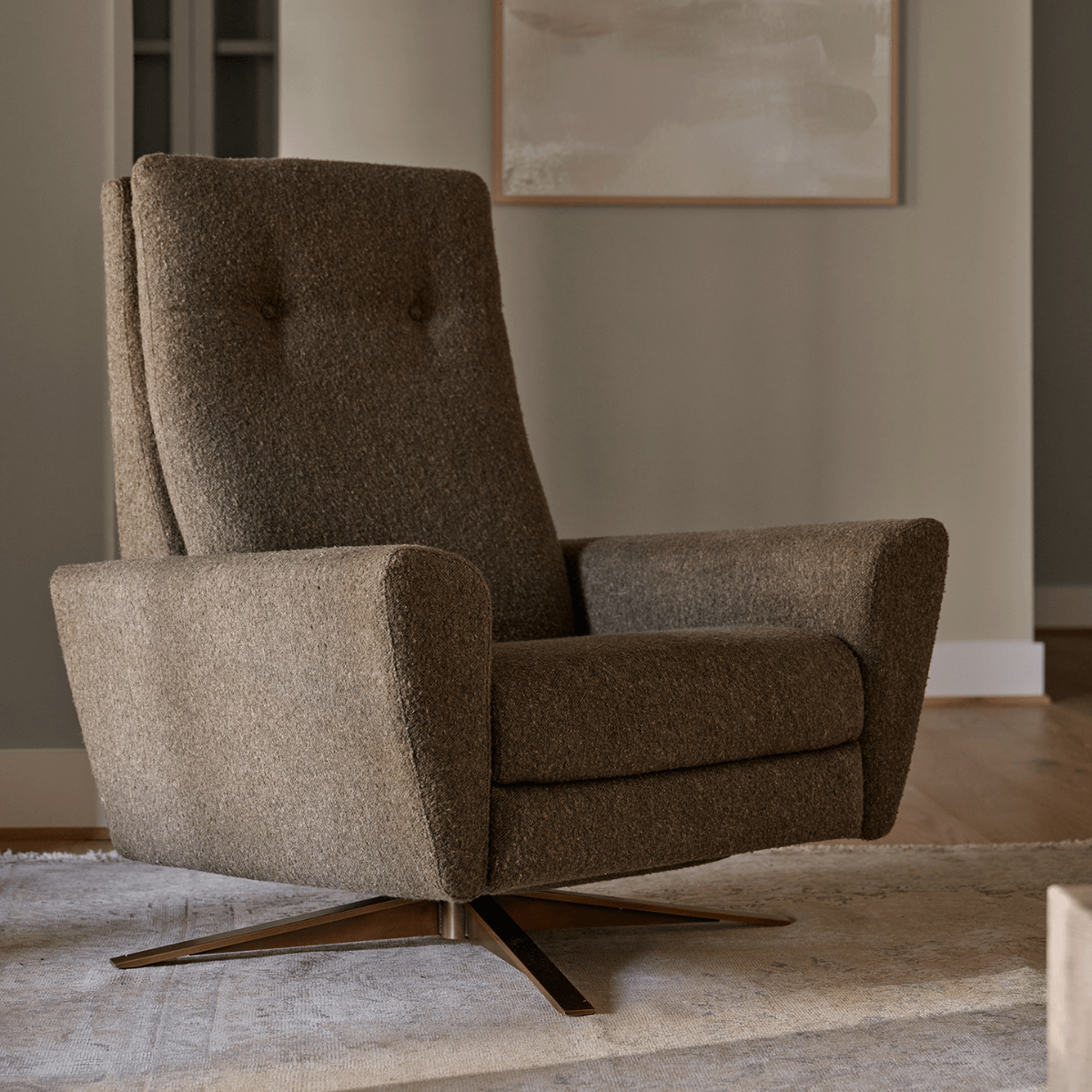 Choose between a four-star base in finishes like Antique Brass or Natural Walnut, or a low-profile disc base in Brushed Metal or Natural Walnut. Available with an optional power recliner function, complete with a rechargeable battery and built-in USB charger for modern convenience.