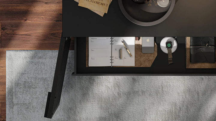 Two adjustable glass shelves create four distinct compartments, perfect for organizing various items. The sleek design includes two lined drawers that can be positioned at the top or bottom, offering versatile storage and use as a serving tray or storage for personal accessories. An internal leveling system ensures stability on any surface, while integrated wire management keeps everything tidy.