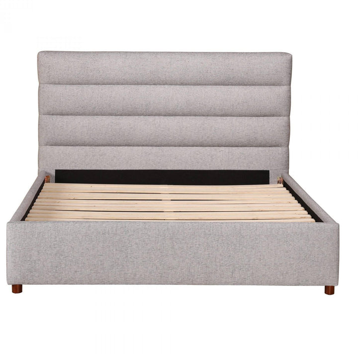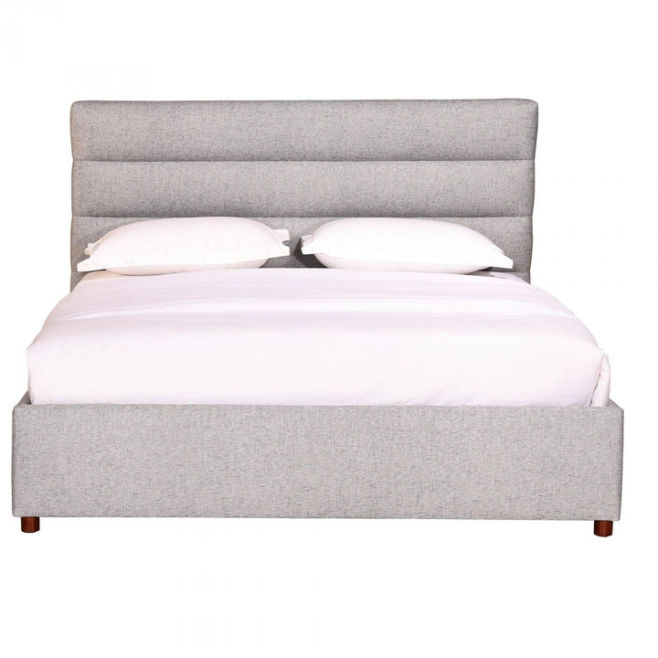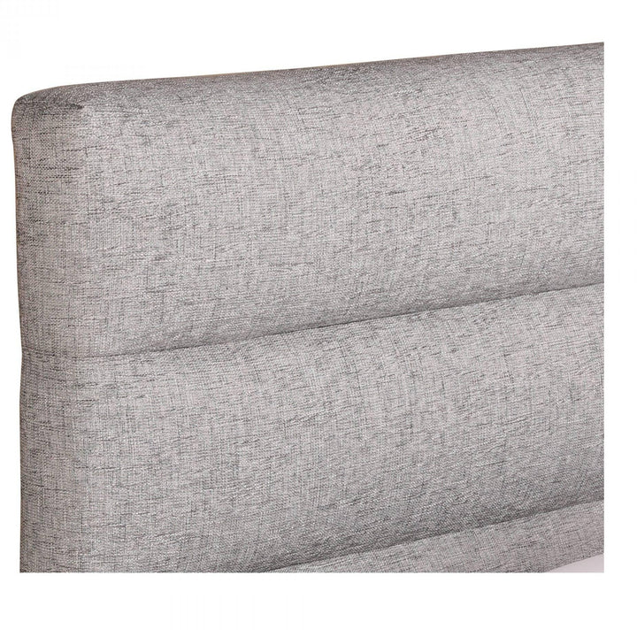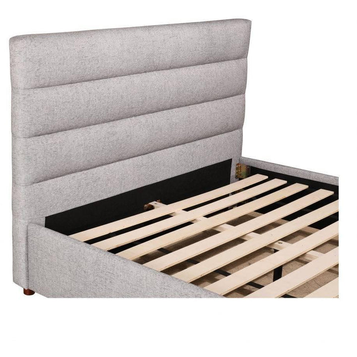 Modern and minimal. The Taka bed is softly upholstered in light grey polyester fabric for a soothing feel before you drift off to dreamland. Lightly stuffed and tufted on top of solid wood construction for ultimate comfort.