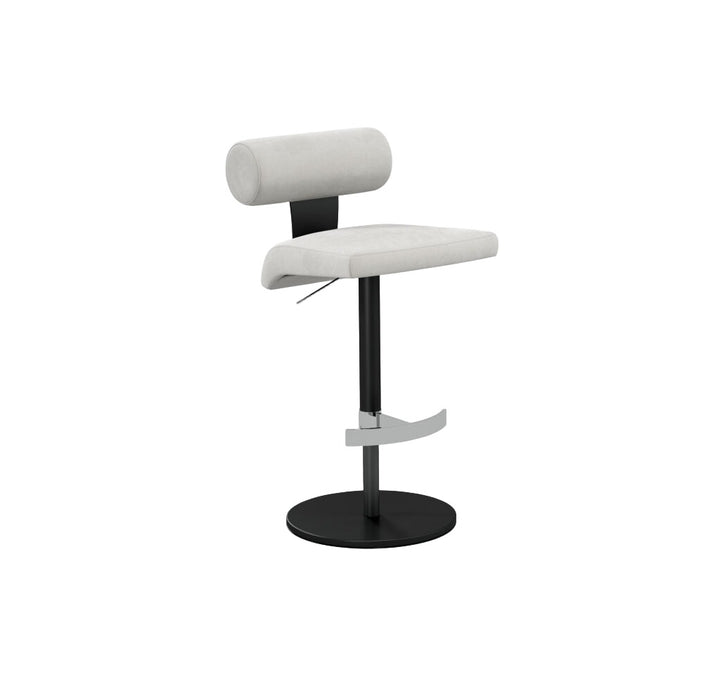 The Bolo Barstool brings a playful, yet geometric touch to any contemporary environment. The generously padded cylindrical back provides both surprising long-term comfort and a truly unique modern design statement. Square tapered steel legs with an athletic stance support the distinctive reverse waterfall seat cushion, with a solid steel arc balancing the distinctive cylindrical back. This stool is not only a functional piece but also a striking addition to modern interiors, seamlessly blending comfort with a bold aesthetic.