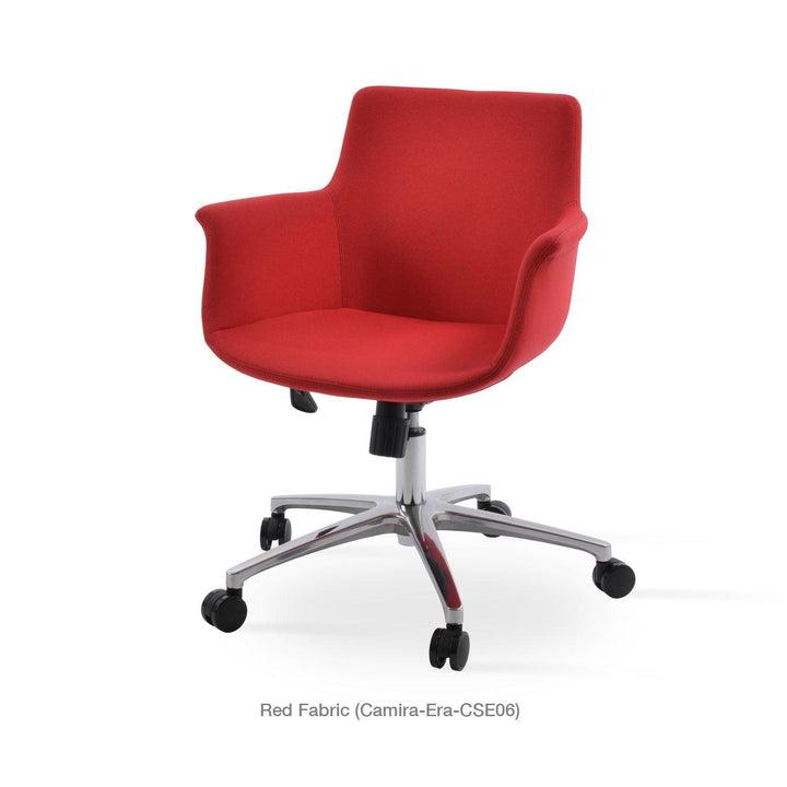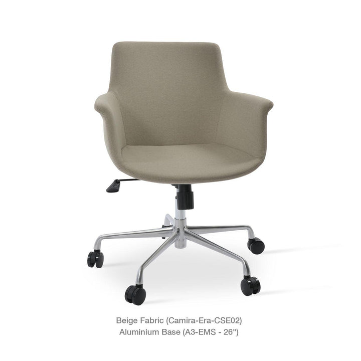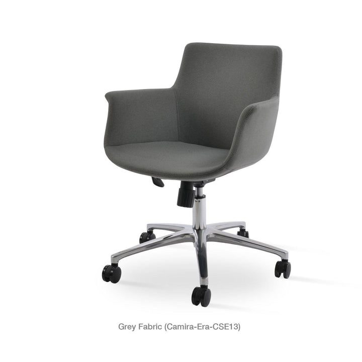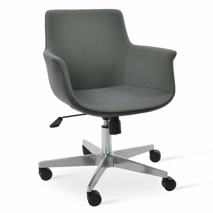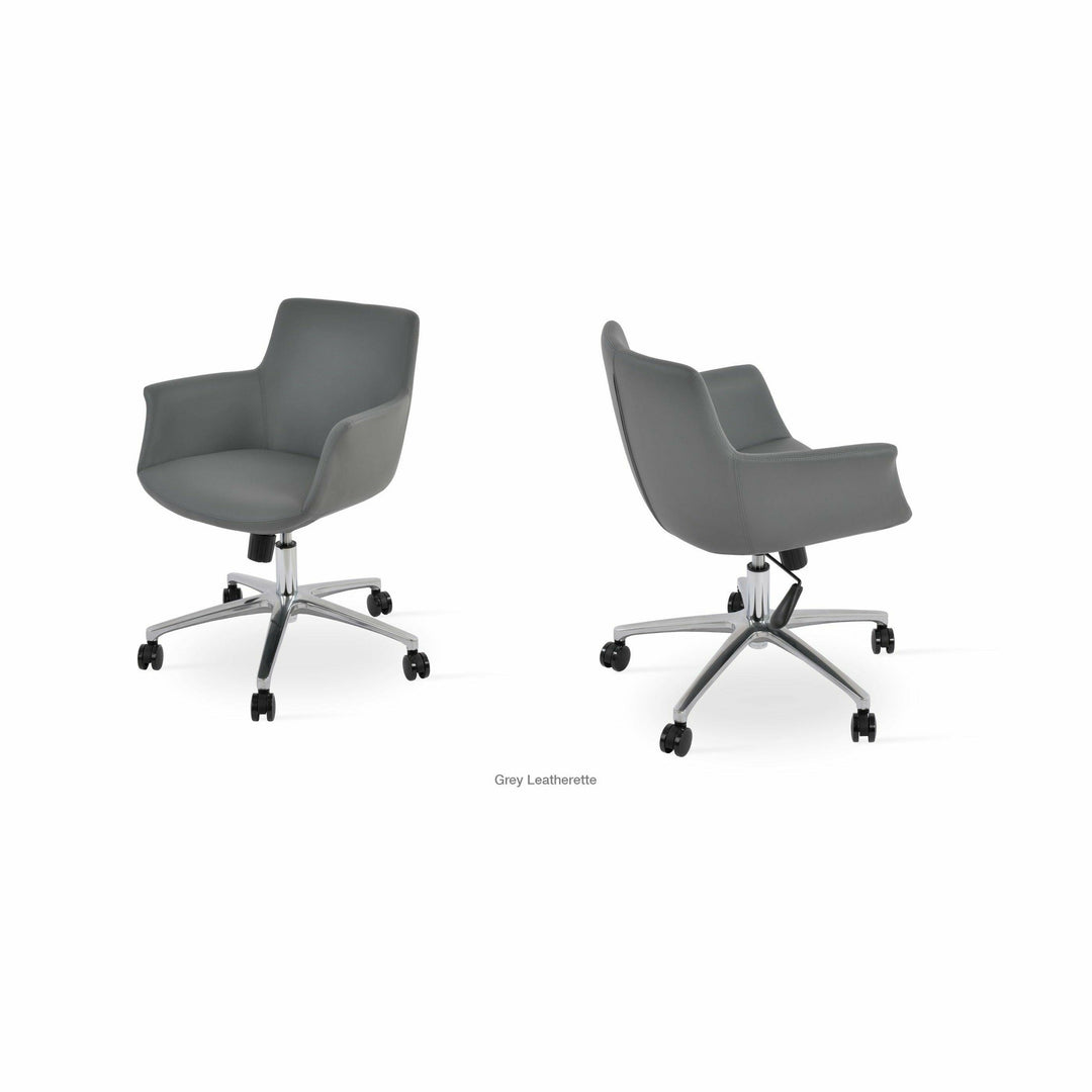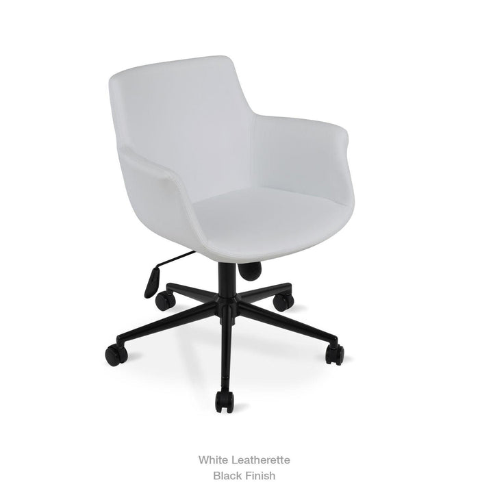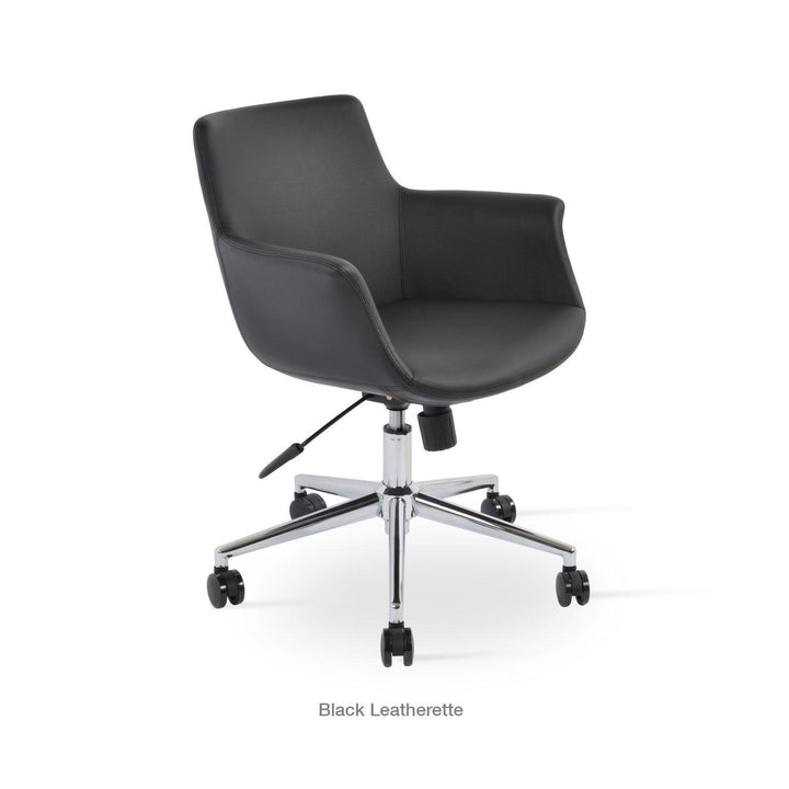 The Bottega Office chair is a contemporary chair with a comfortable upholstered seat and backrest on a height-adjustable gas piston base that swivels and tilts. The chair has a chromed steel five-star base with plastic casters. The seat has a steel structure with “S” shape springs for extra flexibility and strength. This steel frame is molded by injecting polyurethane foam. Bottega seat is upholstered with a removable zipper enclosed leather, PPM, leatherette, or wool fabric slipcover. Bottega Office may be upholstered with various colors as a special order with a minimum quantity required. The chair is suitable for both residential and commercial use.