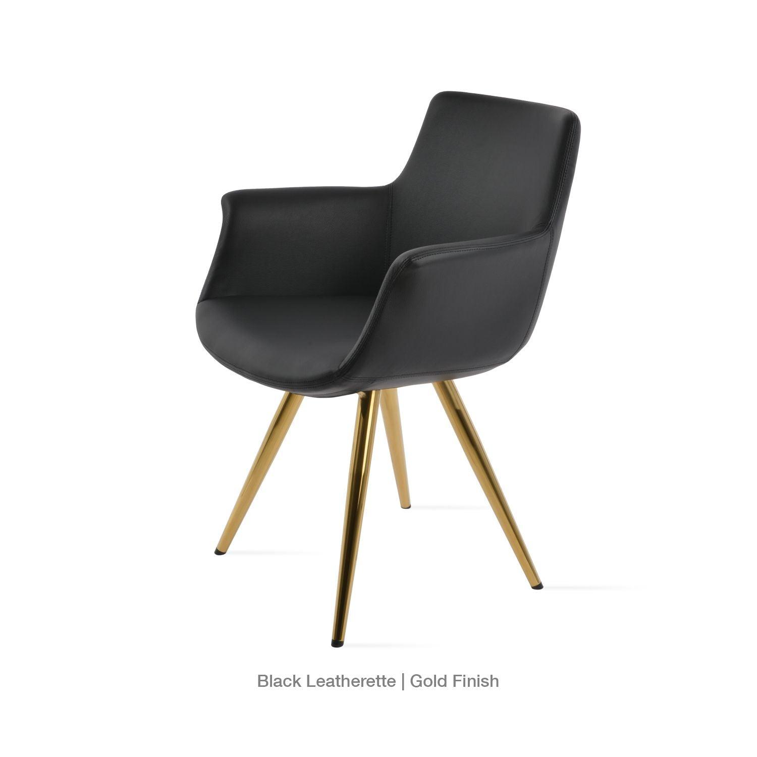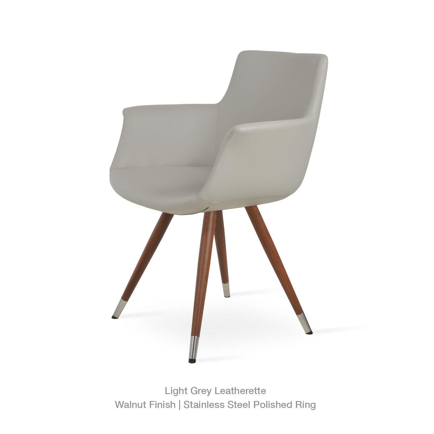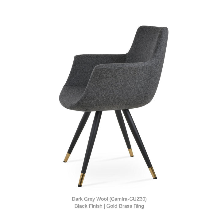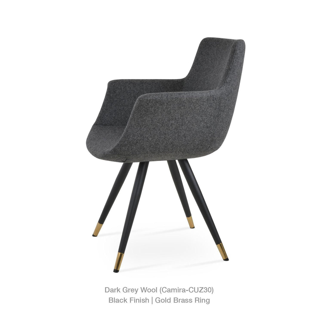 Bottega Star is a unique dining chair with a comfortable upholstered seat and backrest on a steel base available in various base options. Star Ring is available in Black Powder with Gold Brass rings and Walnut Finish with S. Steel Polished rings. Each leg is tipped with a plastic glide screwed into the foot. The seat has a steel structure with “S” shape springs for extra flexibility and strength. This steel frame is molded by injecting polyurethane foam. Bottega seat is upholstered with a removable zipper enclosed leather, PPM, leatherette, or wool fabric slipcover. This contemporary chair is suitable for both residential and commercial use.