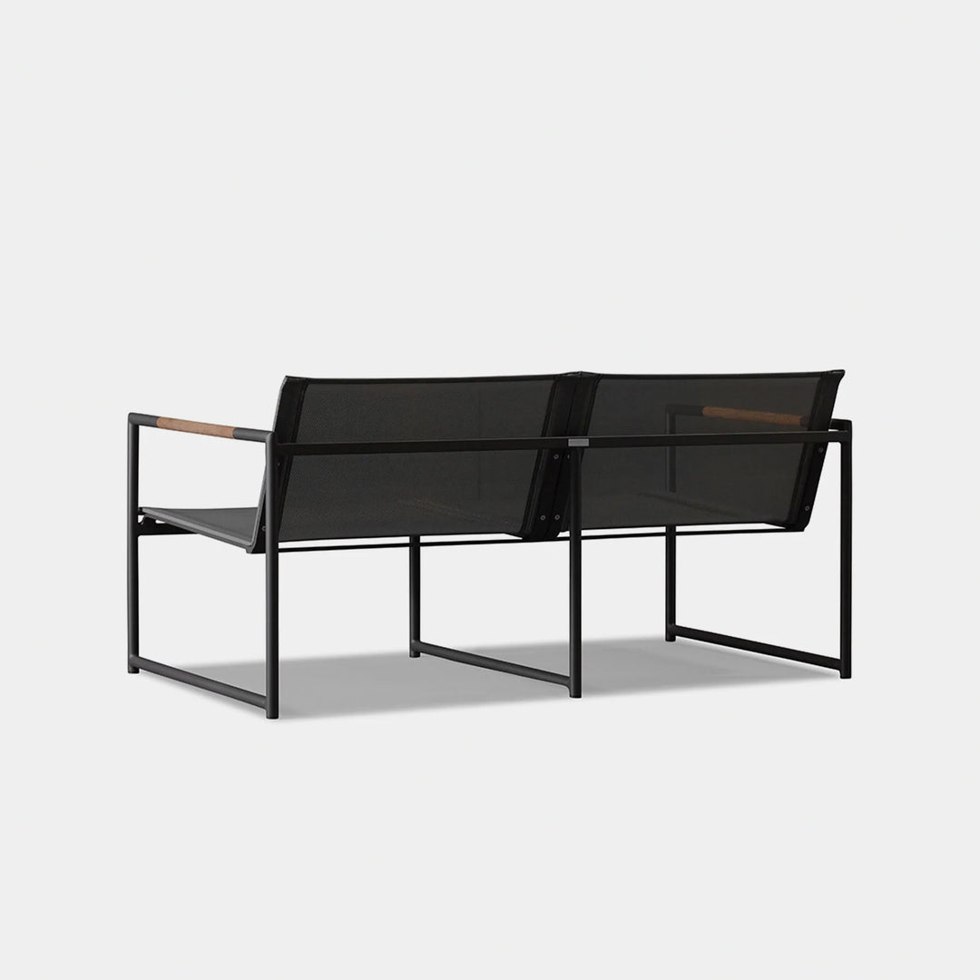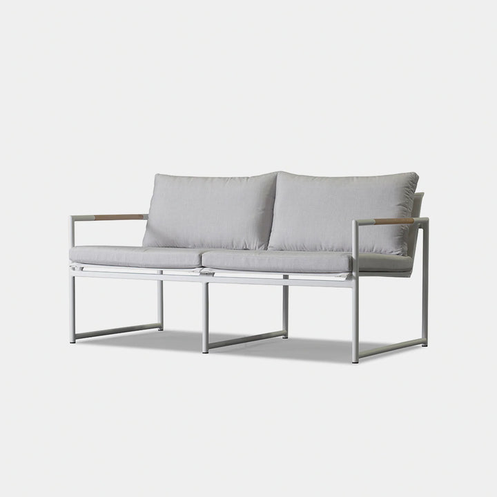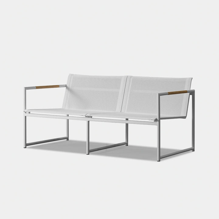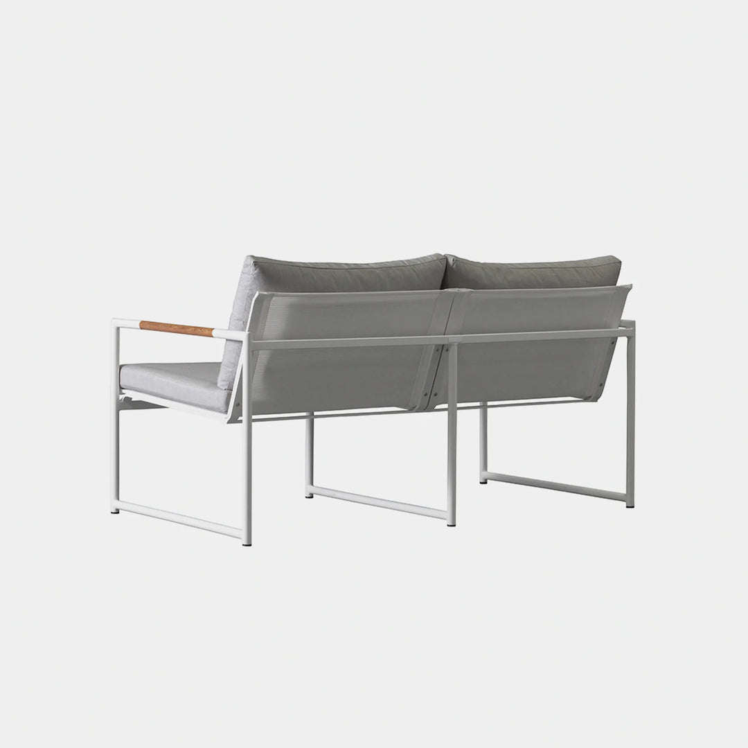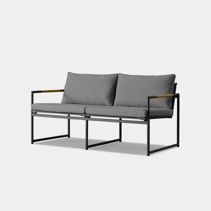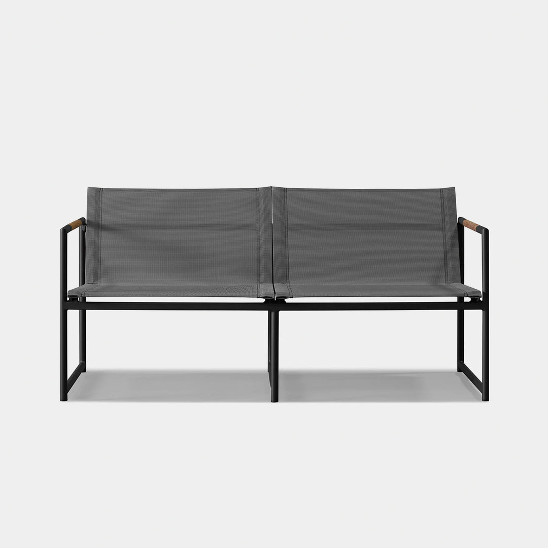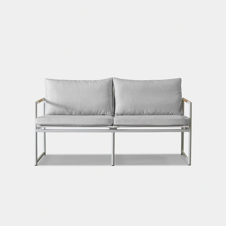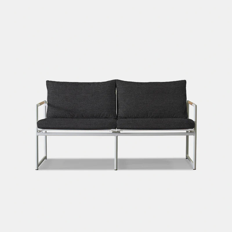 The Breeze 2-Seat Sofa is a sleek and modern outdoor seating option from the Breeze collection. Crafted with a powder-coated extruded aluminum frame and solid teak accents, this sofa features a slatted pitched back and plush cushions for ultimate comfort. Its low-profile design makes it a great choice for smaller outdoor spaces or balconies, and it can even be used without cushions for a minimalist look. Enjoy the alluring simplicity of the Breeze collection and relax in style.