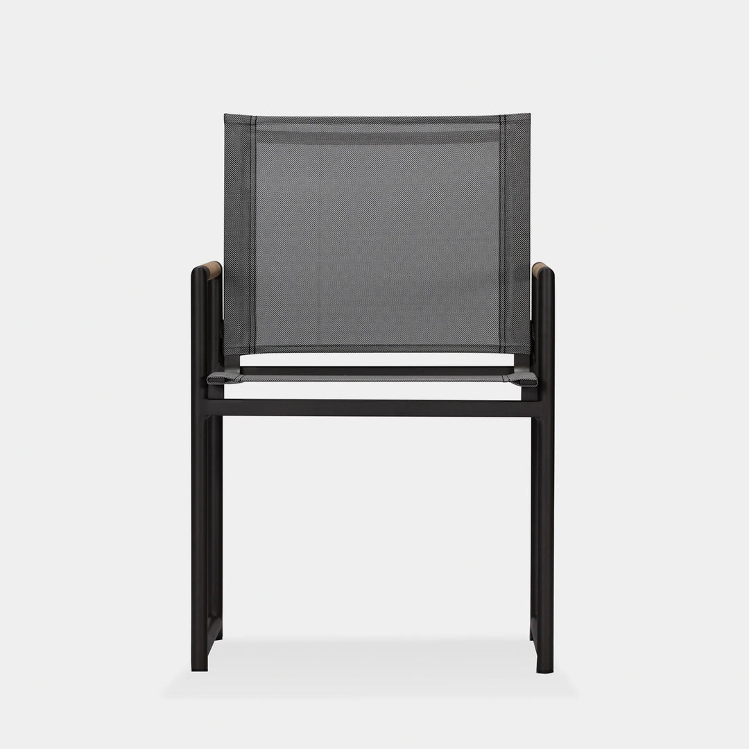 The smaller brother to our Breeze XL collection, our Breeze line mixes thin tubular aluminum construction with solid teak accents for an alluring simplicity. The sleek Breeze Dining Chair is modern comfort — with an all–weather Batyline sling seat and back for support and easy cleaning, no cushion required. Lightweight and incredibly easy to move, this elegant piece is made for a variety of table sizes and spaces.