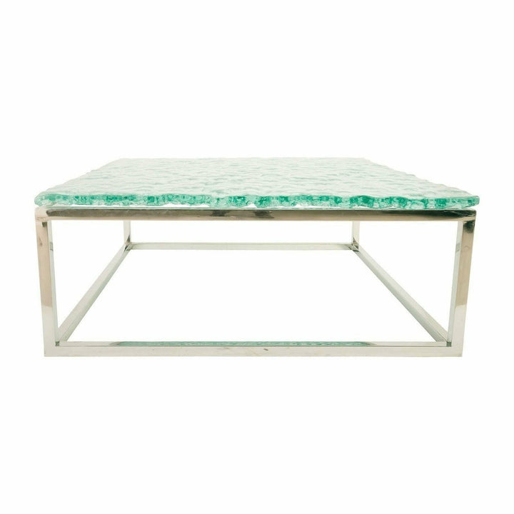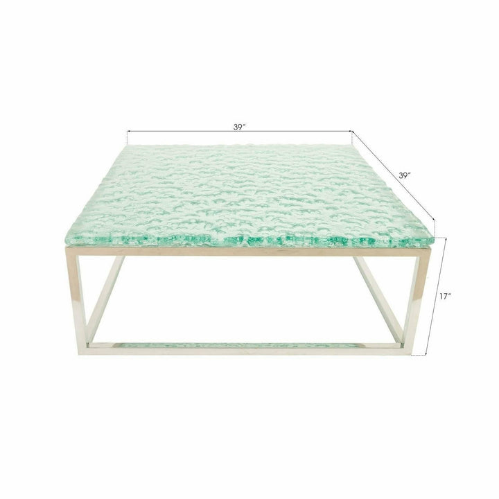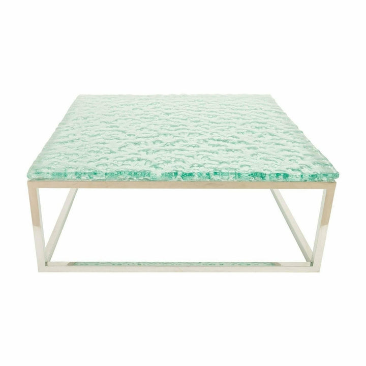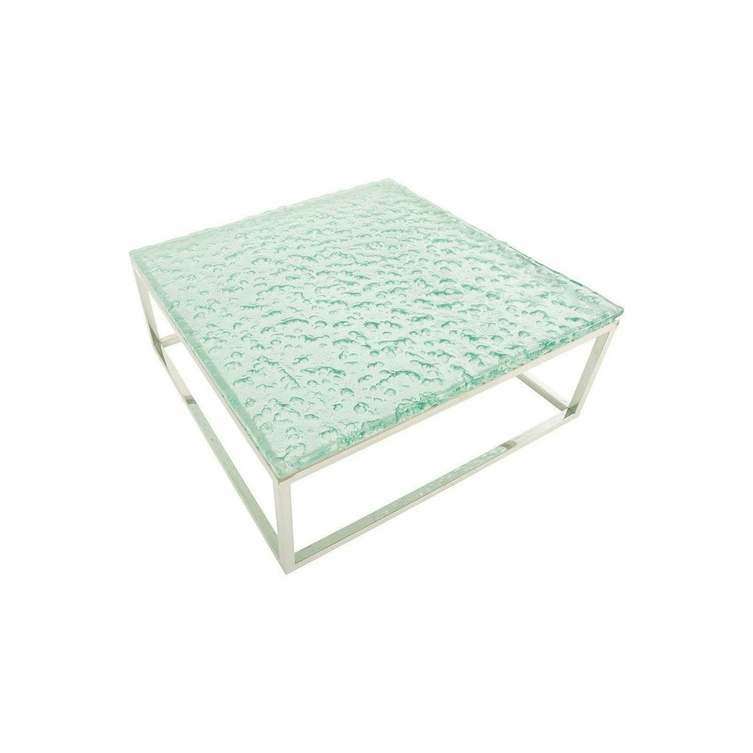 Made of glass with a turquoise sheen, the Bubble Glass Coffee Table is stamped with a flowing pattern that is created when molten glass is laid onto a surface covered with stones. The rocks create varying sizes of impressions that bring this glass coffee table its bubbly personality. The stainless-steel frame that supports the glass makes this a seamless design. A design aspect of note is how the bumpy surface of the bottom layer creates a textural feel even though the top surface is smooth. This contemporary coffee table perfectly reflects the ethos that the Phillips Collection personifies: modern organic. We offer a number of furnishings in the Bubble Glass family of products, including a console table.